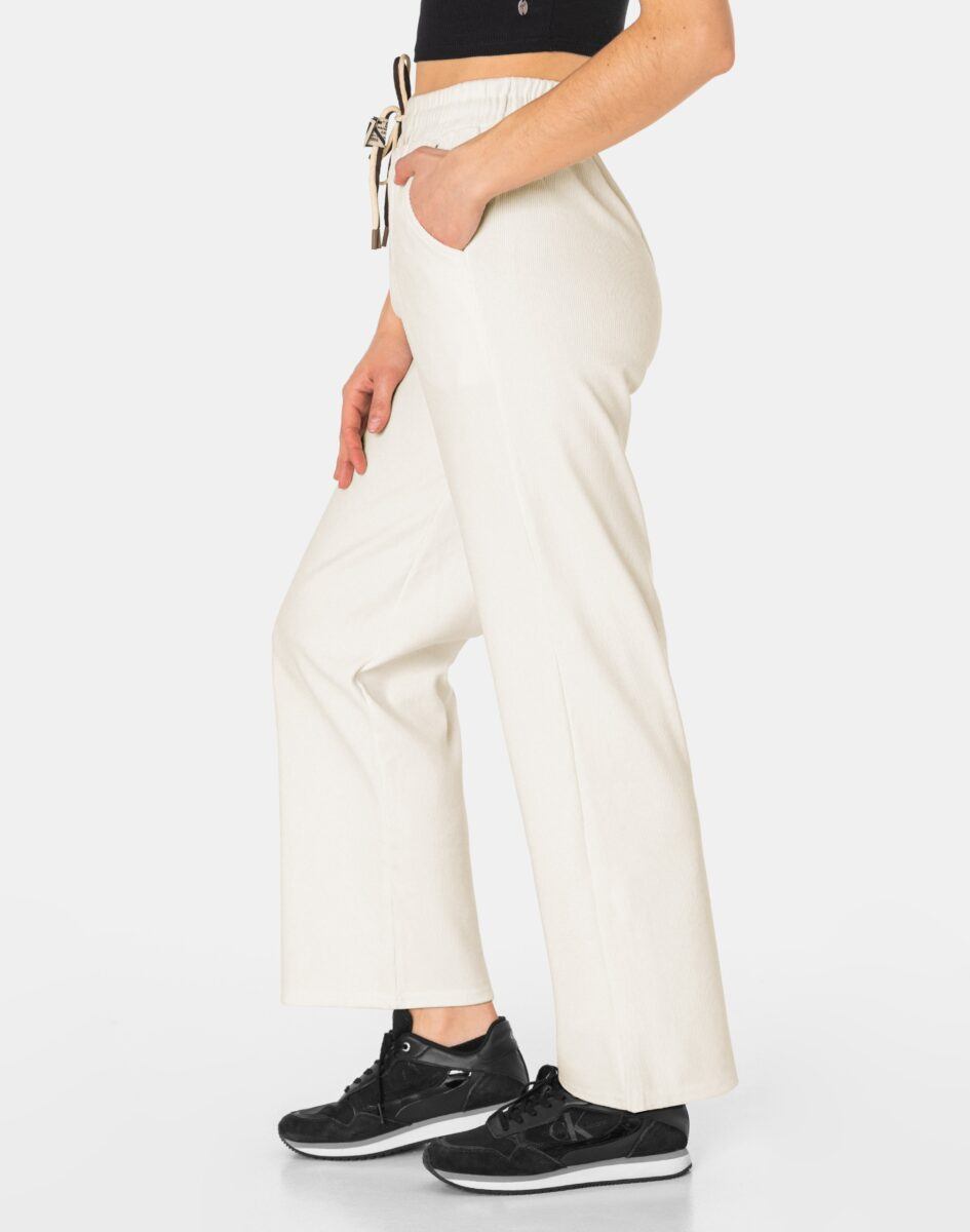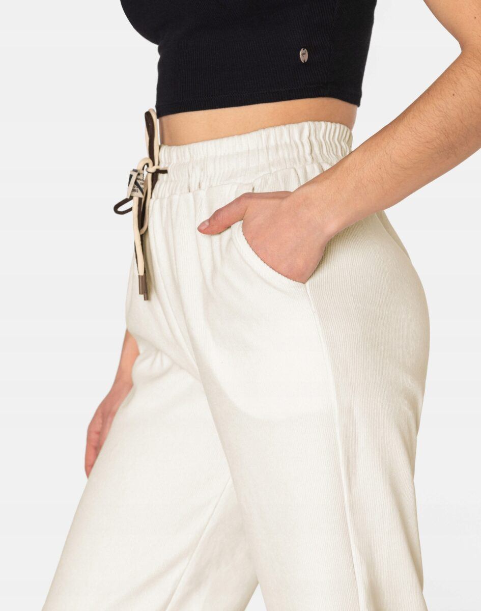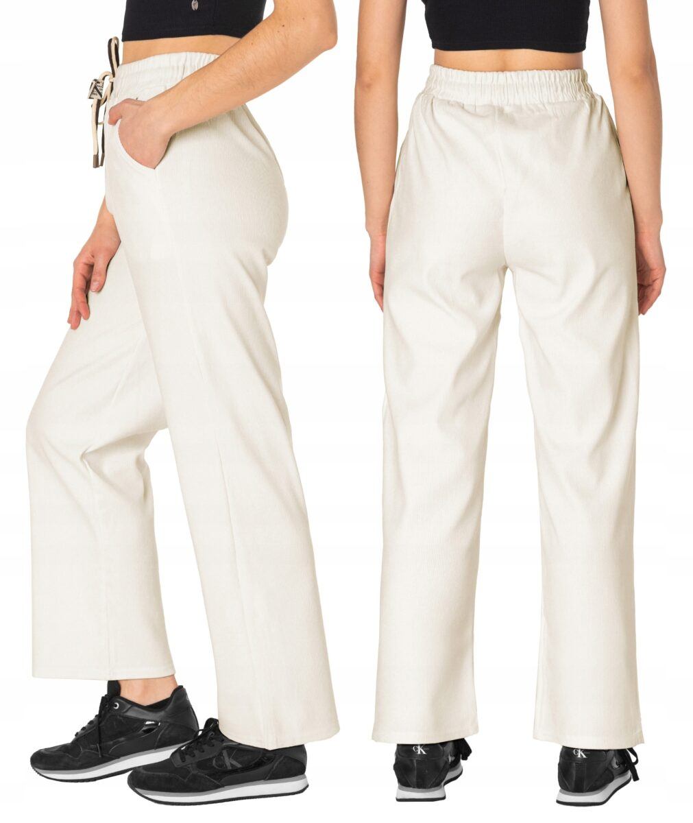 Spodnie model #970 to powracające do łask damskie szwedyWide Leg w letnim kolorze ecru, o charakterystycznych dla tego modelu szerokichnogawkach wide, rozszerzających się już od bioder. Wykonane z wysokiej jakości trwałej, mocnej i sprężystej tkaniny o najlepszej fakturze typu Bedford w charakterystyczny drobny prążek przypominającej tradycyjny sztruks o jednolitym wybarwieniu, wyjątkowo wygodnej w użytkowaniu. Z założenia wyróżniają się dużą wygodą a dopasowanie w pasie zapewnia szeroki, elastyczny pas ściągający zgrabnie modelujący talię, oraz dodatkowo wpuszczona w pasek ozdobna taśma regulacyjna z możliwością jej zawiązywania. Z przodu dwie wpuszczane kieszenie na dłonie, tył gładki bez kieszeni. Niewielki dodatek elastanu (lycra) sprawia, że spodnie są bardziej elastyczne, ładnie dopasowują się do sylwetki i są bardzo komfortowe w użytkowaniu. Łatwo się je zakłada i są znacznie wygodniejsze od spodni, które lycry nie mają.