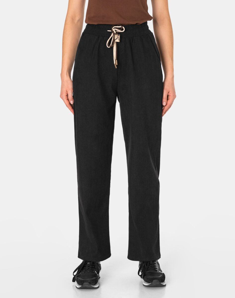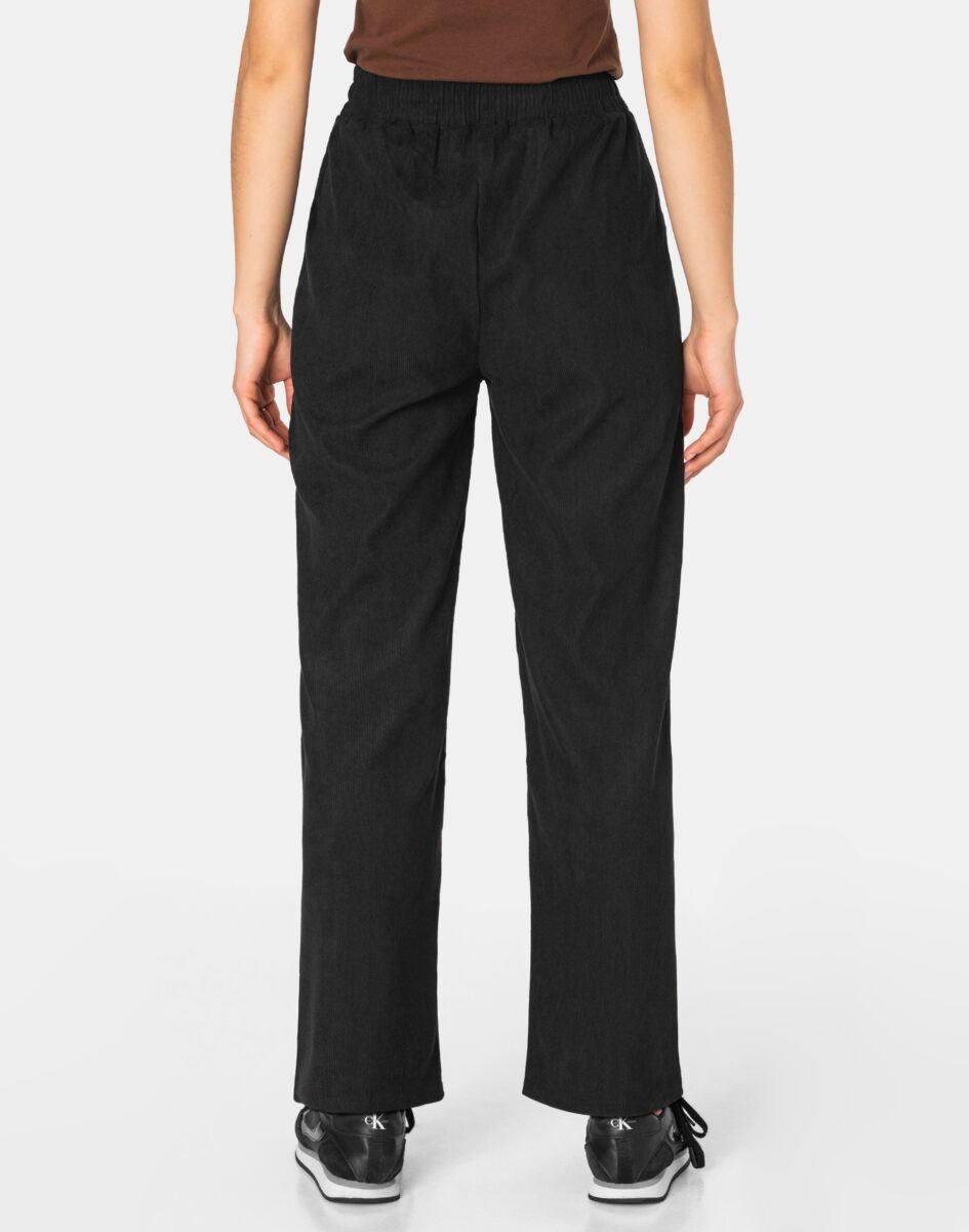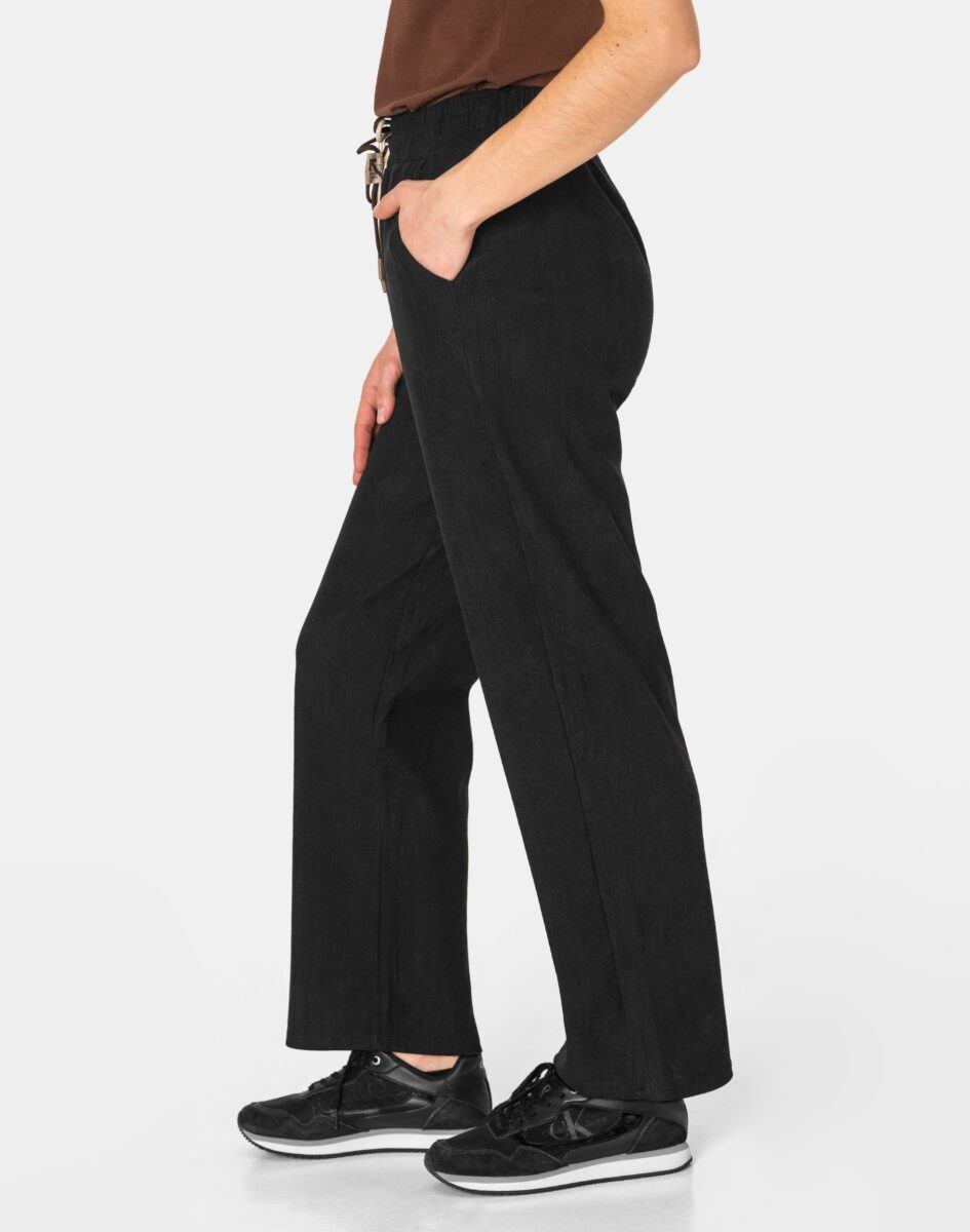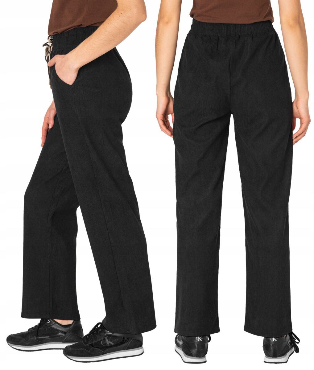 Spodnie model #970 to powracające do łask damskie szwedyWide Leg w letnim kolorze czarnym, o charakterystycznych dla tego modelu szerokichnogawkach wide, rozszerzających się już od bioder. Wykonane z wysokiej jakości trwałej, mocnej i sprężystej tkaniny o najlepszej fakturze typu Bedford w charakterystyczny drobny prążek przypominającej tradycyjny sztruks o jednolitym wybarwieniu, wyjątkowo wygodnej w użytkowaniu. Z założenia wyróżniają się dużą wygodą a dopasowanie w pasie zapewnia szeroki, elastyczny pas ściągający zgrabnie modelujący talię, oraz dodatkowo wpuszczona w pasek ozdobna taśma regulacyjna z możliwością jej zawiązywania. Z przodu dwie wpuszczane kieszenie na dłonie, tył gładki bez kieszeni. Niewielki dodatek elastanu (lycra) sprawia, że spodnie są bardziej elastyczne, ładnie dopasowują się do sylwetki i są bardzo komfortowe w użytkowaniu. Łatwo się je zakłada i są znacznie wygodniejsze od spodni, które lycry nie mają.