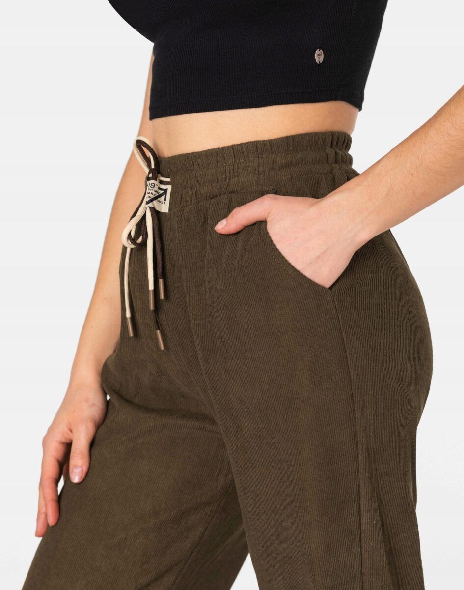 Spodnie model #970 to powracające do łask damskie szwedyWide Leg w letnim kolorze orzechowym, o charakterystycznych dla tego modelu szerokichnogawkach wide, rozszerzających się już od bioder. Wykonane z wysokiej jakości trwałej, mocnej i sprężystej tkaniny o najlepszej fakturze typu Bedford w charakterystyczny drobny prążek przypominającej tradycyjny sztruks o jednolitym wybarwieniu, wyjątkowo wygodnej w użytkowaniu. Z założenia wyróżniają się dużą wygodą a dopasowanie w pasie zapewnia szeroki, elastyczny pas ściągający zgrabnie modelujący talię, oraz dodatkowo wpuszczona w pasek ozdobna taśma regulacyjna z możliwością jej zawiązywania. Z przodu dwie wpuszczane kieszenie na dłonie, tył gładki bez kieszeni. Niewielki dodatek elastanu (lycra) sprawia, że spodnie są bardziej elastyczne, ładnie dopasowują się do sylwetki i są bardzo komfortowe w użytkowaniu. Łatwo się je zakłada i są znacznie wygodniejsze od spodni, które lycry nie mają.