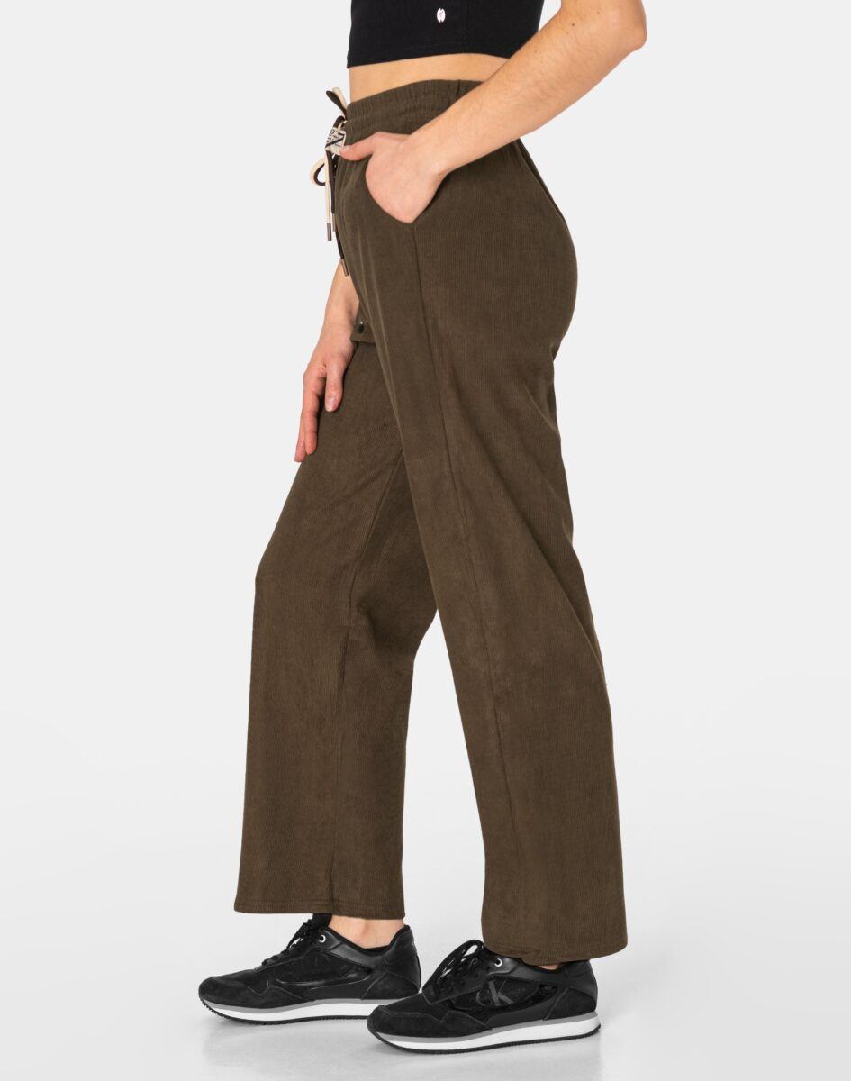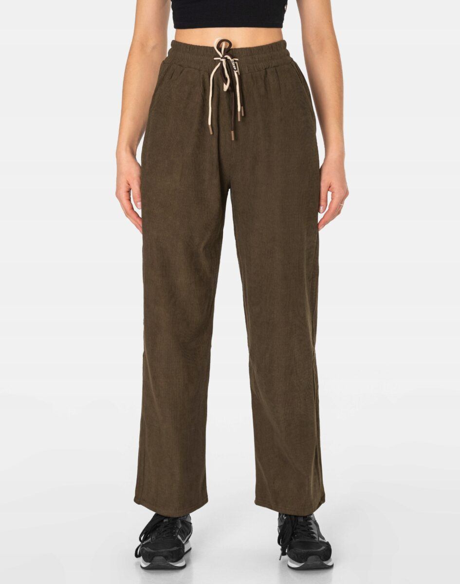 Spodnie model #970 to powracające do łask damskie szwedyWide Leg w letnim kolorze orzechowym, o charakterystycznych dla tego modelu szerokichnogawkach wide, rozszerzających się już od bioder. Wykonane z wysokiej jakości trwałej, mocnej i sprężystej tkaniny o najlepszej fakturze typu Bedford w charakterystyczny drobny prążek przypominającej tradycyjny sztruks o jednolitym wybarwieniu, wyjątkowo wygodnej w użytkowaniu. Z założenia wyróżniają się dużą wygodą a dopasowanie w pasie zapewnia szeroki, elastyczny pas ściągający zgrabnie modelujący talię, oraz dodatkowo wpuszczona w pasek ozdobna taśma regulacyjna z możliwością jej zawiązywania. Z przodu dwie wpuszczane kieszenie na dłonie, tył gładki bez kieszeni. Niewielki dodatek elastanu (lycra) sprawia, że spodnie są bardziej elastyczne, ładnie dopasowują się do sylwetki i są bardzo komfortowe w użytkowaniu. Łatwo się je zakłada i są znacznie wygodniejsze od spodni, które lycry nie mają.