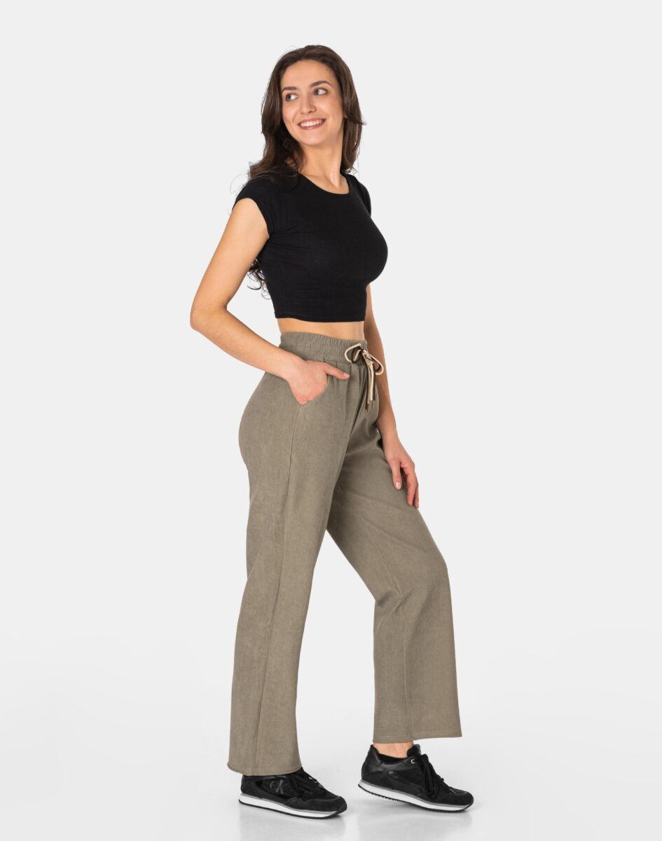 Spodnie model #970 to powracające do łask damskie szwedyWide Leg w letnim kolorze beżowym, o charakterystycznych dla tego modelu szerokichnogawkach wide, rozszerzających się już od bioder. Wykonane z wysokiej jakości trwałej, mocnej i sprężystej tkaniny o najlepszej fakturze typu Bedford w charakterystyczny drobny prążek przypominającej tradycyjny sztruks o jednolitym wybarwieniu, wyjątkowo wygodnej w użytkowaniu. Z założenia wyróżniają się dużą wygodą a dopasowanie w pasie zapewnia szeroki, elastyczny pas ściągający zgrabnie modelujący talię, oraz dodatkowo wpuszczona w pasek ozdobna taśma regulacyjna z możliwością jej zawiązywania. Z przodu dwie wpuszczane kieszenie na dłonie, tył gładki bez kieszeni. Niewielki dodatek elastanu (lycra) sprawia, że spodnie są bardziej elastyczne, ładnie dopasowują się do sylwetki i są bardzo komfortowe w użytkowaniu. Łatwo się je zakłada i są znacznie wygodniejsze od spodni, które lycry nie mają.