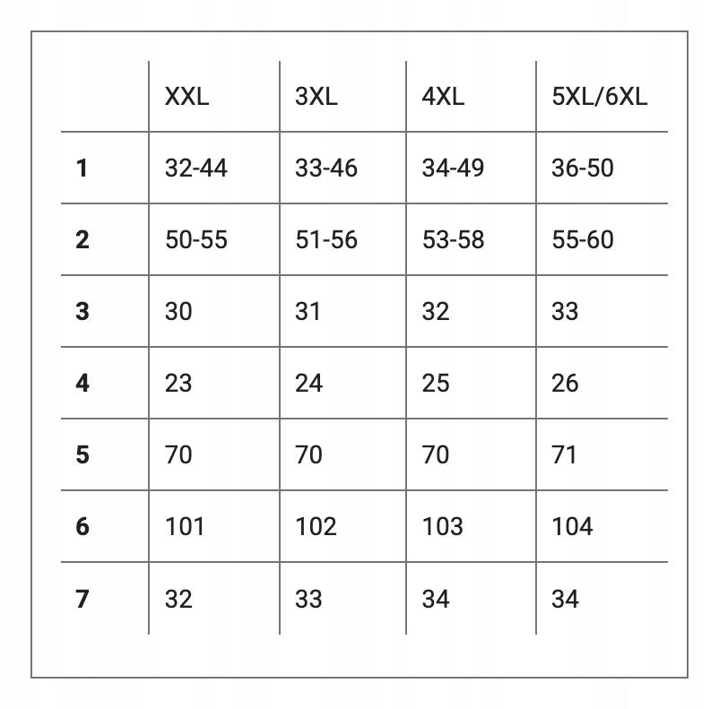 Proszę nie sugerować się rozmiarem podanym na metce przez producenta ( np: XXL, 3XL czy 5XL/6XL) ponieważ różne firmy stosują bardzo różne oznaczenia rozmiaru na co my jako sprzedawcy na Allegro nie mamy żadnego wpływu. Najlepiej jest zmierzyć się dokładnie centymetrem a następnie porównać swoje wymiary z tabelą wymiarów podaną przez nas na aukcji i wybrać odpowiedni rozmiar.