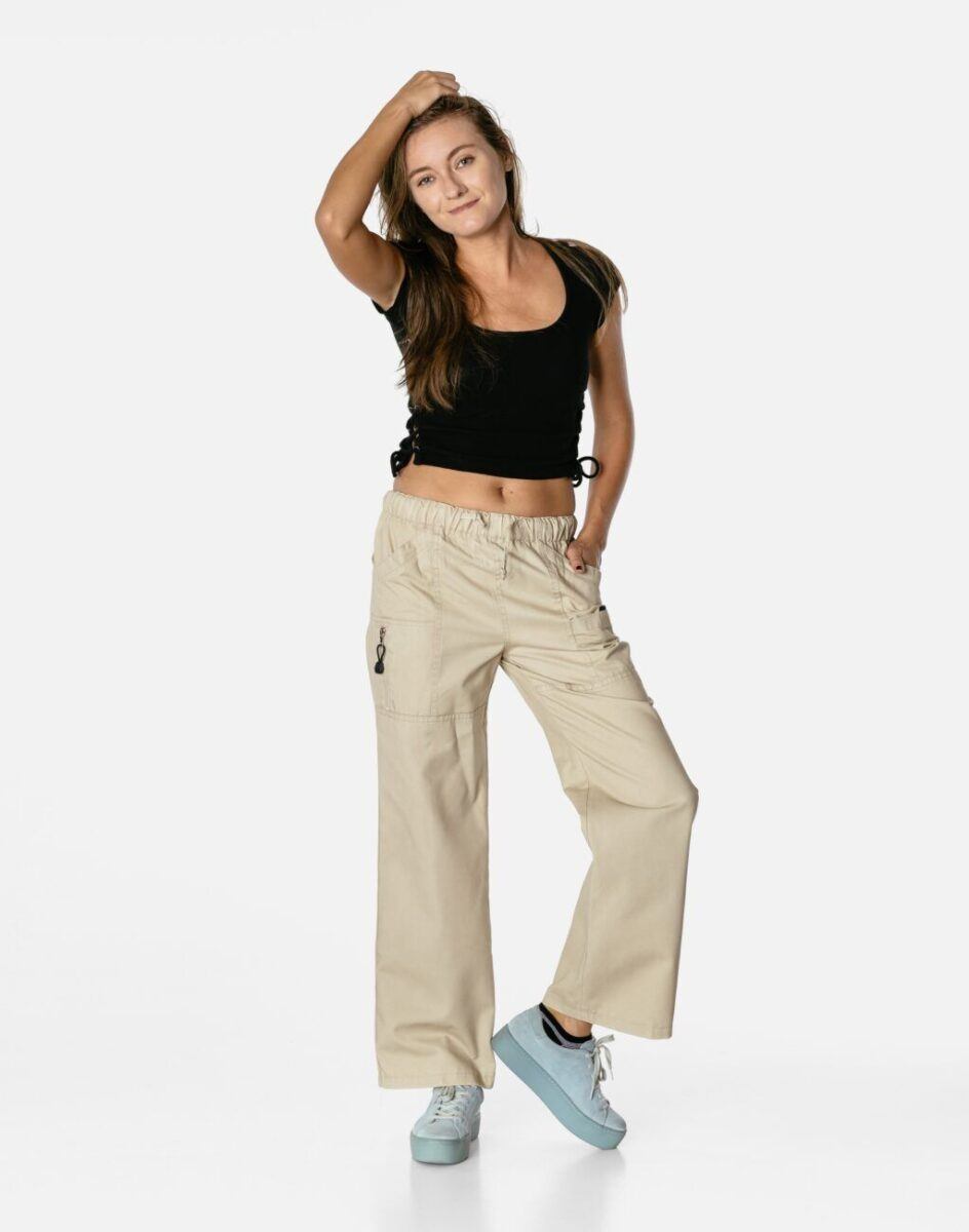 Z założenia wyróżniają się dużą wygodą, a dopasowanie w pasie zapewnia elastyczny pas ściągający oraz dodatkowo wpuszczona w pasek taśma z możliwością jej zawiązywania co umożliwia regulację i dopasowanie do indywidualnych preferencji. Model ten wyposażono w obszerne kieszenie z przodu i z tyłu , przez co są niezwykle funkcjonalne i praktyczne dodając im modnego i lekko militarystycznego charakteru. Nie musisz nosić z nimi torebki. Najpotrzebniejsze drobiazgi zmieścisz przy sobie.