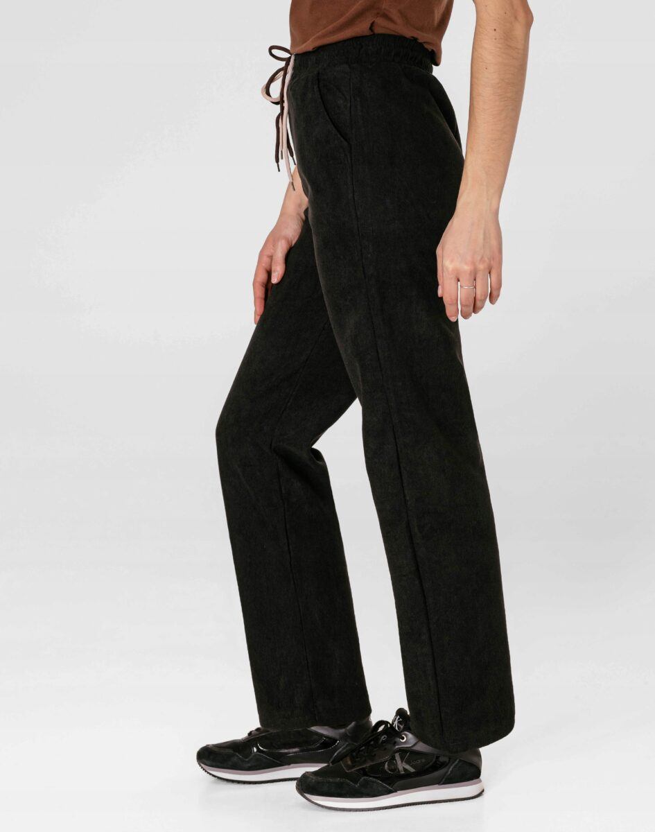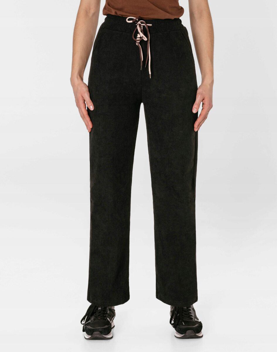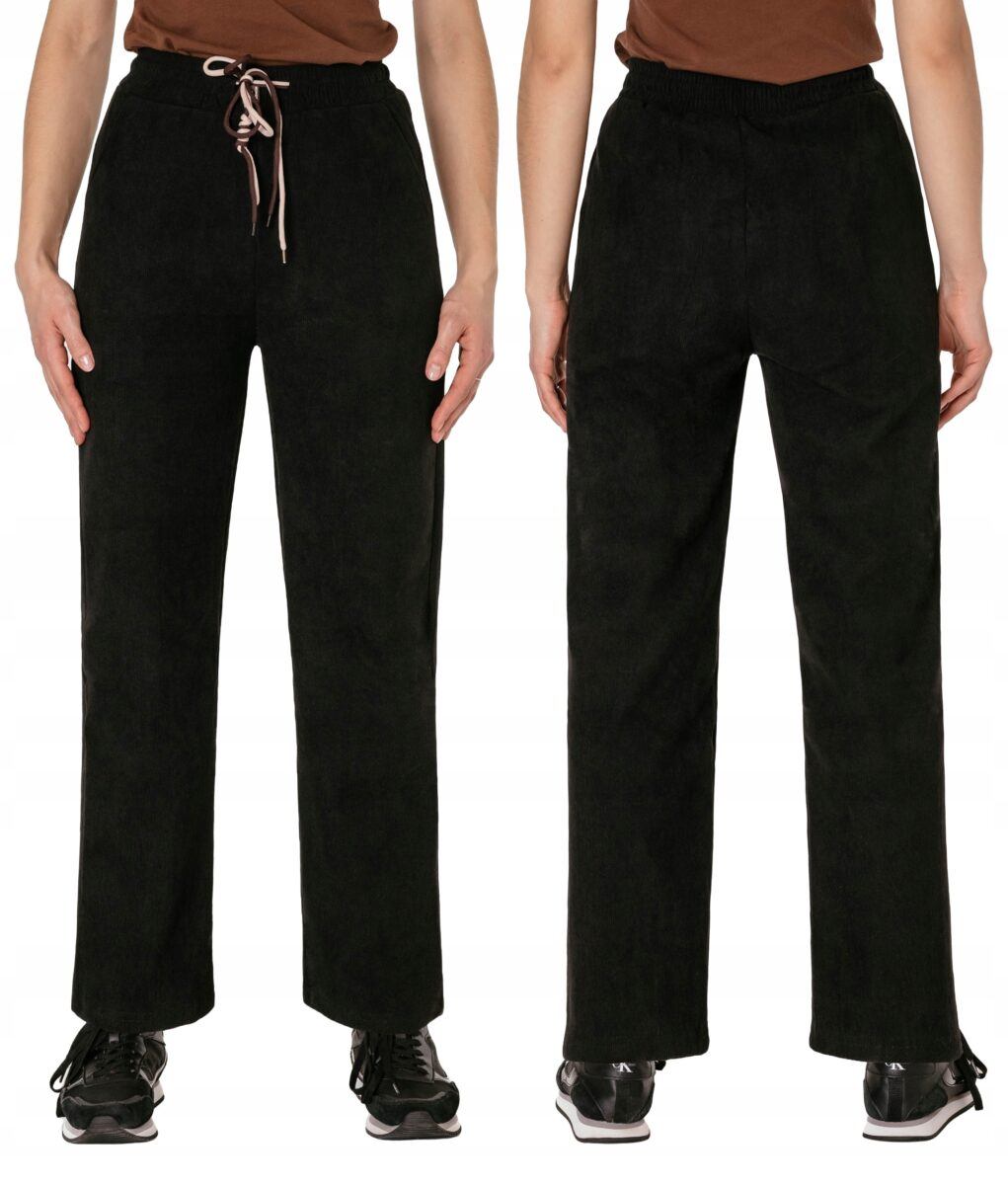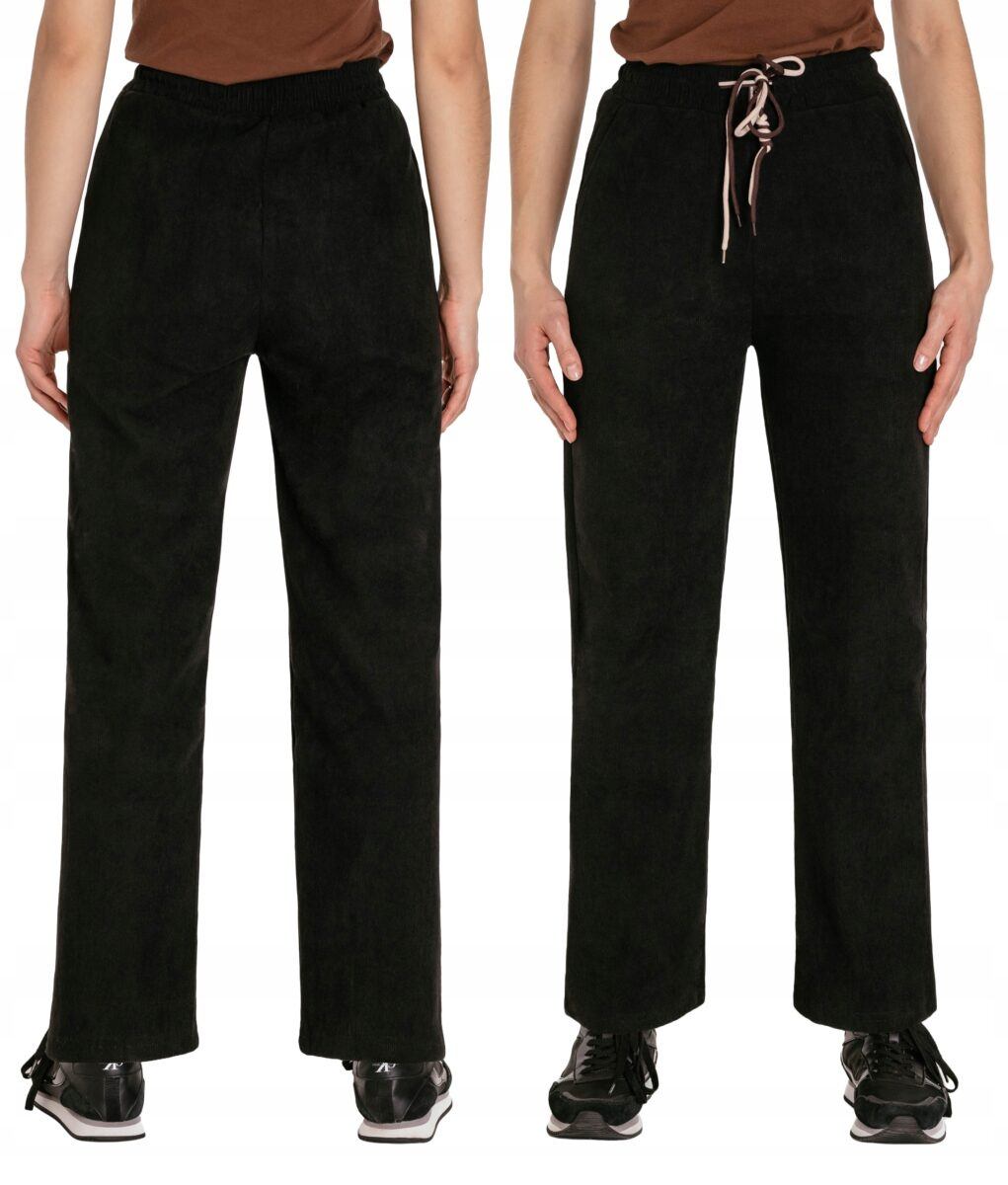 Wyjątkowo ciepłe bo ocieplone od wewnętrznej strony mikropolarem damskie spodniesztruksowe w kolorze czarnym na jesień, zimę, z podwyższonym stanem i prostą, luźną nogawką. Wykonane z wysokiej jakości przyjemnej w dotyku tkaniny sztruksowej w charakterystyczny drobny prążek o jednolitym wybarwieniu, miękkiej i ciepłej, bardzo wygodnej w użytkowaniu, która zapewnia bardzo wysoki współczynnik ochrony termicznej w stosunku do wagi. To komfortowo skrojony model w stylu sport-casual z prostą, luźną nogawką Regular Fit. Z założenia wyróżniają się dużą wygodą a dopasowanie w pasie zapewnia szeroki, elastyczny pas ściągający zgrabnie modelujący talię, oraz dodatkowo wpuszczona w pasek ozdobna taśma regulacyjna z możliwością jej zawiązywania. Na bokach dwie wpuszczane kieszenie na dłonie. Tył gładki bez kieszeni.