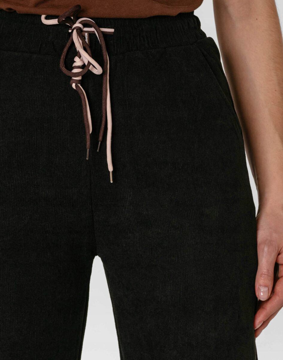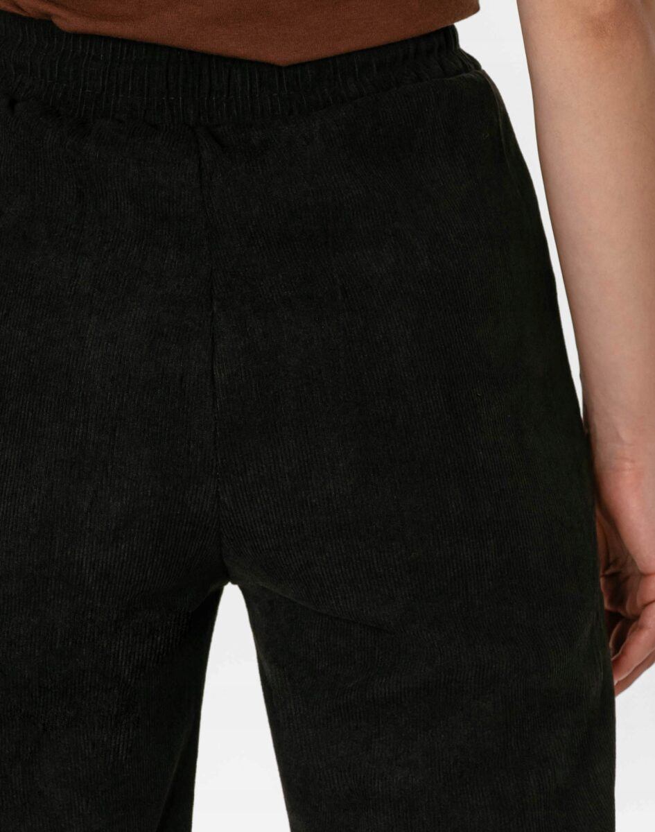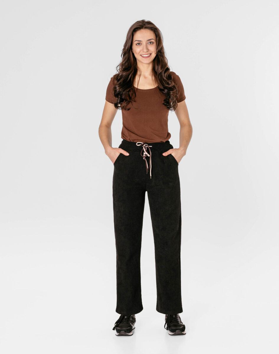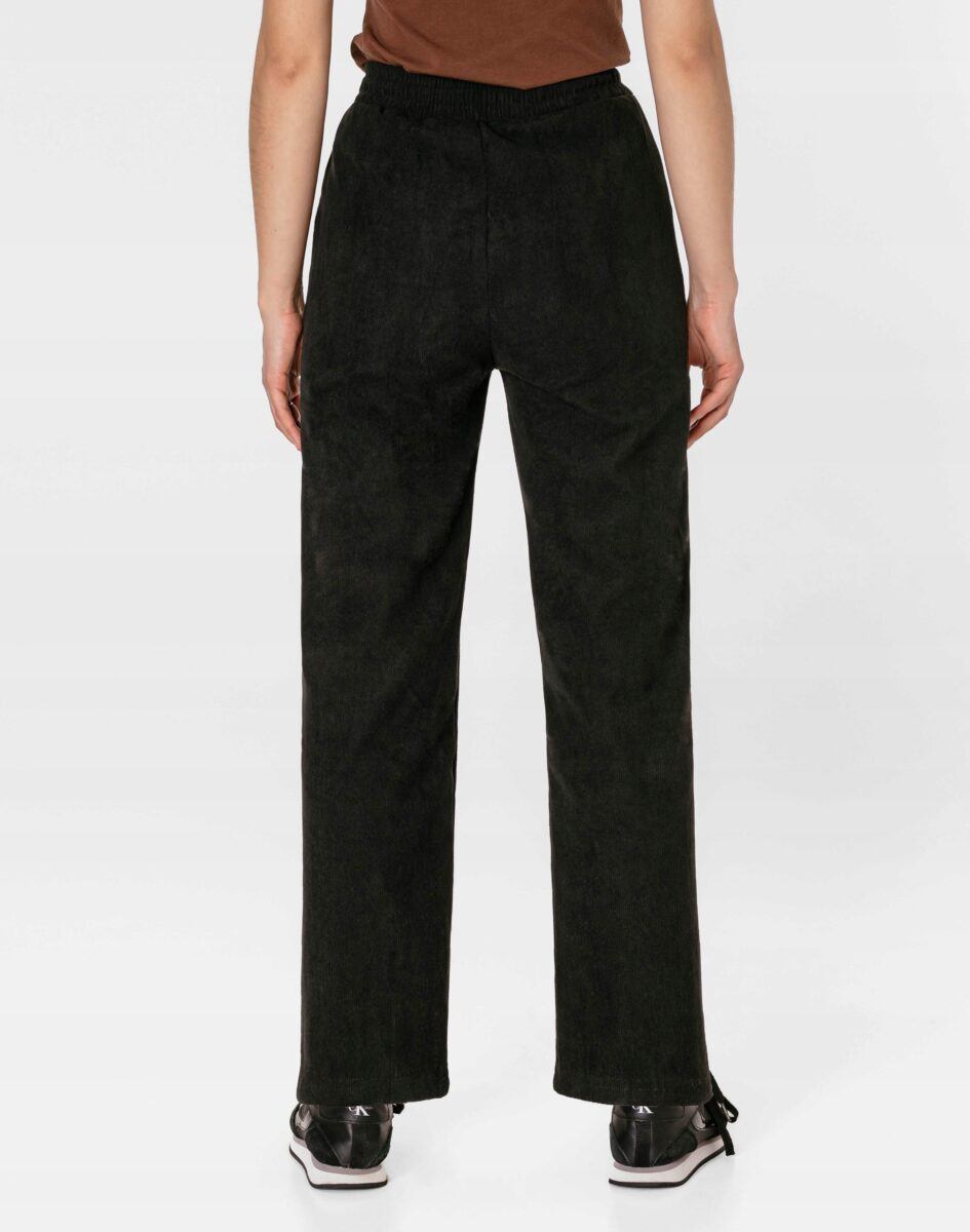 Wyjątkowo ciepłe bo ocieplone od wewnętrznej strony mikropolarem damskie spodniesztruksowe w kolorze czarnym na jesień, zimę, z podwyższonym stanem i prostą, luźną nogawką. Wykonane z wysokiej jakości przyjemnej w dotyku tkaniny sztruksowej w charakterystyczny drobny prążek o jednolitym wybarwieniu, miękkiej i ciepłej, bardzo wygodnej w użytkowaniu, która zapewnia bardzo wysoki współczynnik ochrony termicznej w stosunku do wagi. To komfortowo skrojony model w stylu sport-casual z prostą, luźną nogawką Regular Fit. Z założenia wyróżniają się dużą wygodą a dopasowanie w pasie zapewnia szeroki, elastyczny pas ściągający zgrabnie modelujący talię, oraz dodatkowo wpuszczona w pasek ozdobna taśma regulacyjna z możliwością jej zawiązywania. Na bokach dwie wpuszczane kieszenie na dłonie. Tył gładki bez kieszeni.