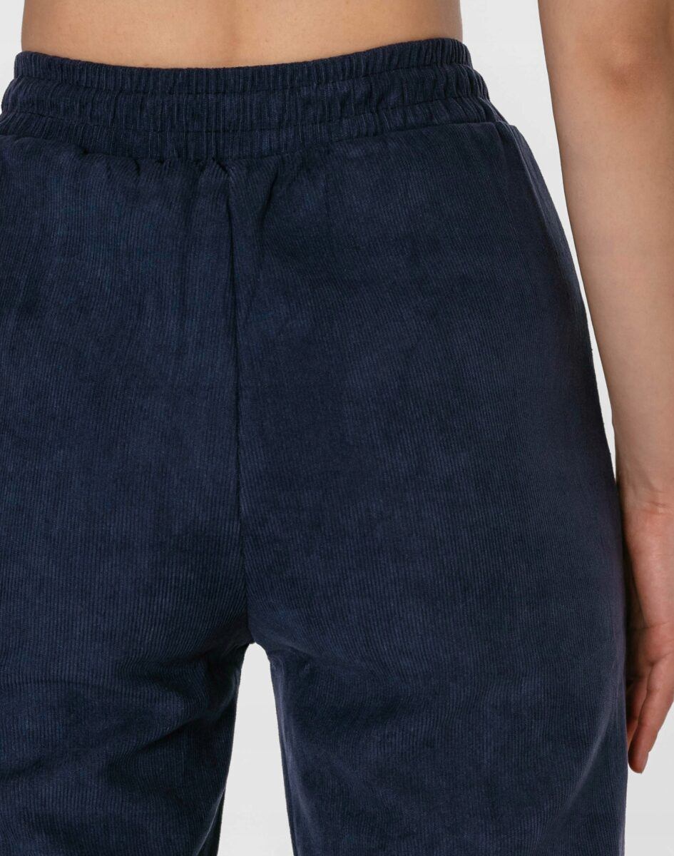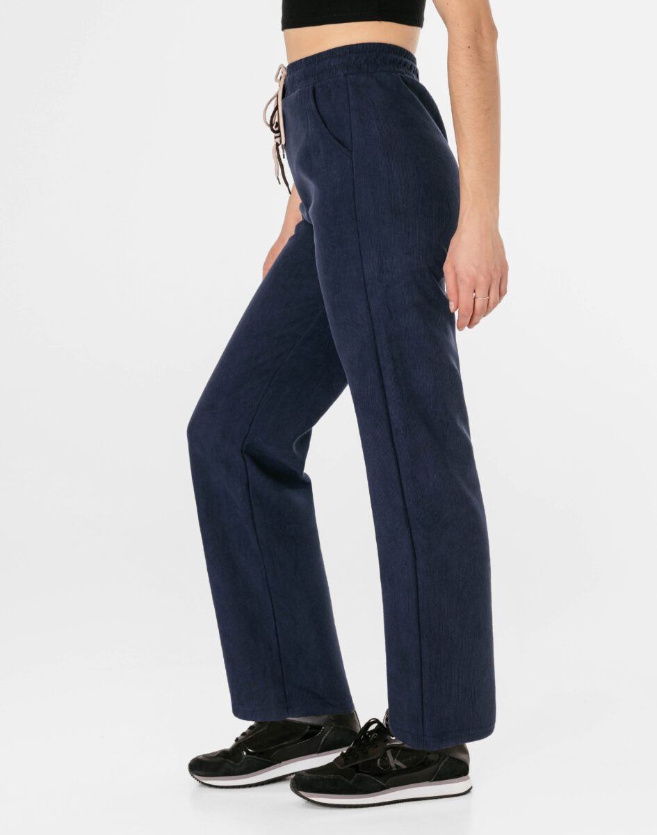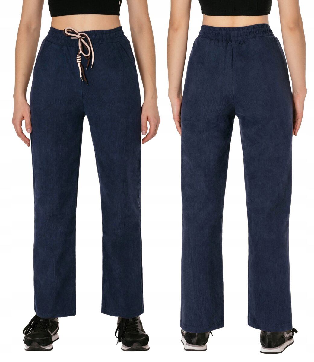 Wyjątkowo ciepłe bo ocieplone od wewnętrznej strony mikropolarem damskie spodniesztruksowe w kolorze granatowym na jesień, zimę, z podwyższonym stanem i prostą, luźną nogawką. Wykonane z wysokiej jakości przyjemnej w dotyku tkaniny sztruksowej w charakterystyczny drobny prążek o jednolitym wybarwieniu, miękkiej i ciepłej, bardzo wygodnej w użytkowaniu, która zapewnia bardzo wysoki współczynnik ochrony termicznej w stosunku do wagi. To komfortowo skrojony model w stylu sport-casual z prostą, luźną nogawką Regular Fit. Z założenia wyróżniają się dużą wygodą a dopasowanie w pasie zapewnia szeroki, elastyczny pas ściągający zgrabnie modelujący talię, oraz dodatkowo wpuszczona w pasek ozdobna taśma regulacyjna z możliwością jej zawiązywania. Na bokach dwie wpuszczane kieszenie na dłonie. Tył gładki bez kieszeni.