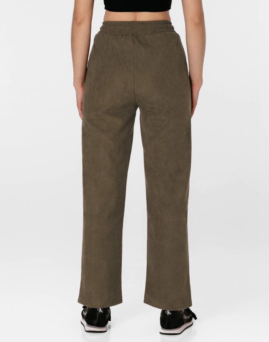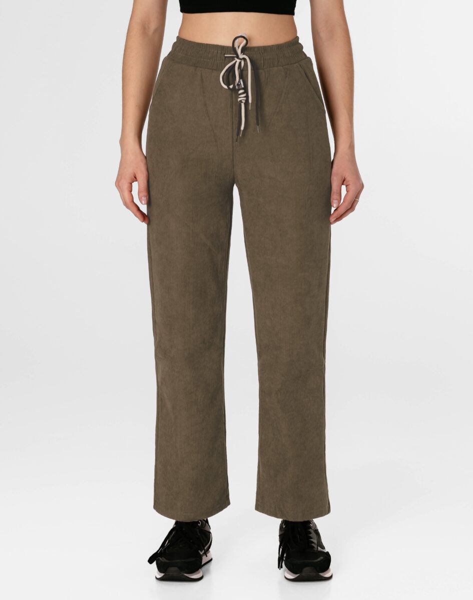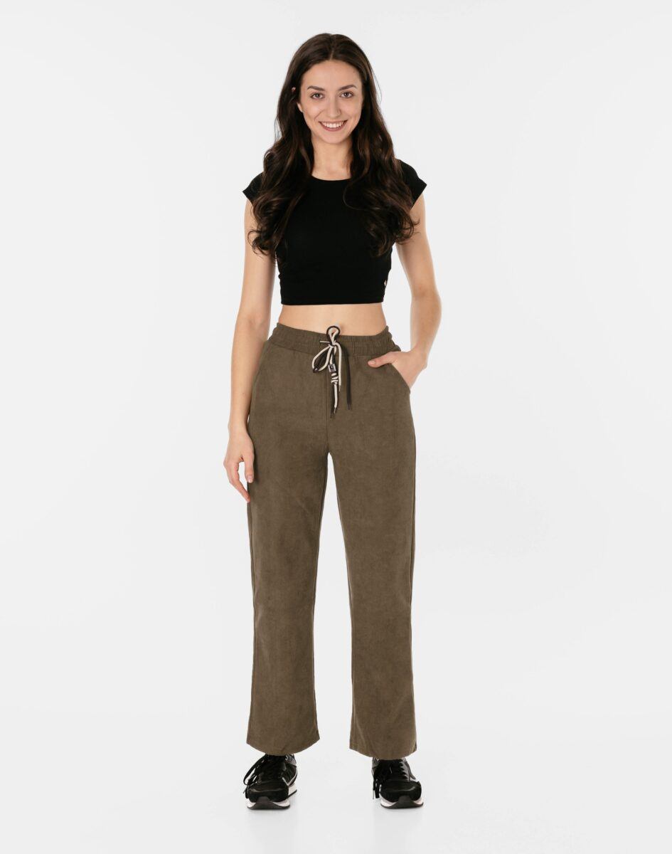 Wyjątkowo ciepłe bo ocieplone od wewnętrznej strony mikropolarem damskie spodniesztruksowe w kolorze khaki na jesień, zimę, z podwyższonym stanem i prostą, luźną nogawką. Wykonane z wysokiej jakości przyjemnej w dotyku tkaniny sztruksowej w charakterystyczny drobny prążek o jednolitym wybarwieniu, miękkiej i ciepłej, bardzo wygodnej w użytkowaniu, która zapewnia bardzo wysoki współczynnik ochrony termicznej w stosunku do wagi. To komfortowo skrojony model w stylu sport-casual z prostą, luźną nogawką Regular Fit. Z założenia wyróżniają się dużą wygodą a dopasowanie w pasie zapewnia szeroki, elastyczny pas ściągający zgrabnie modelujący talię, oraz dodatkowo wpuszczona w pasek ozdobna taśma regulacyjna z możliwością jej zawiązywania. Na bokach dwie wpuszczane kieszenie na dłonie. Tył gładki bez kieszeni.