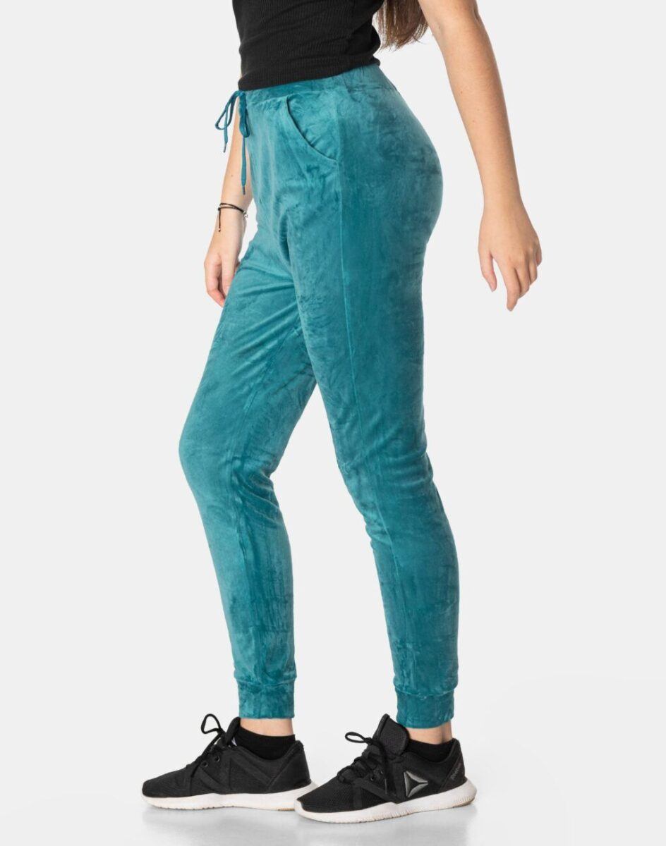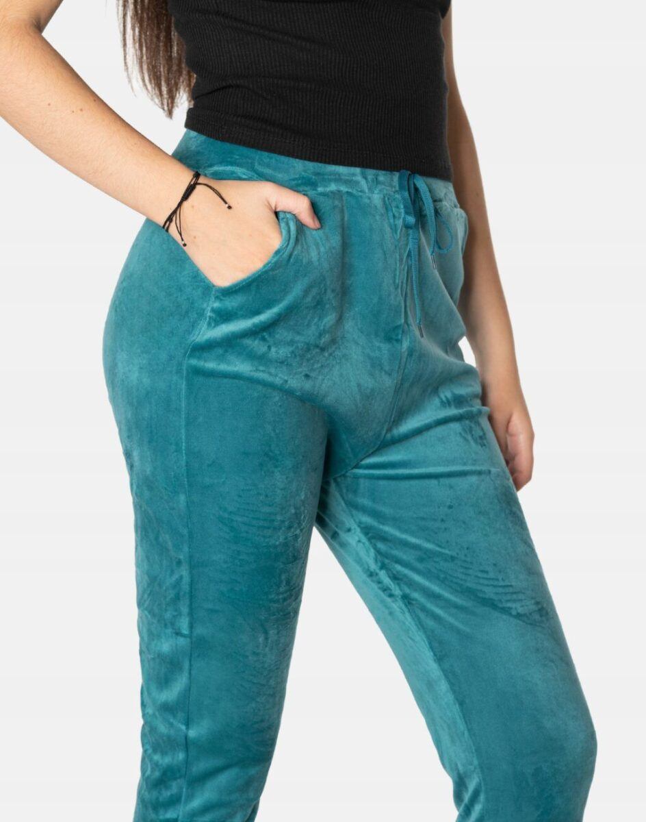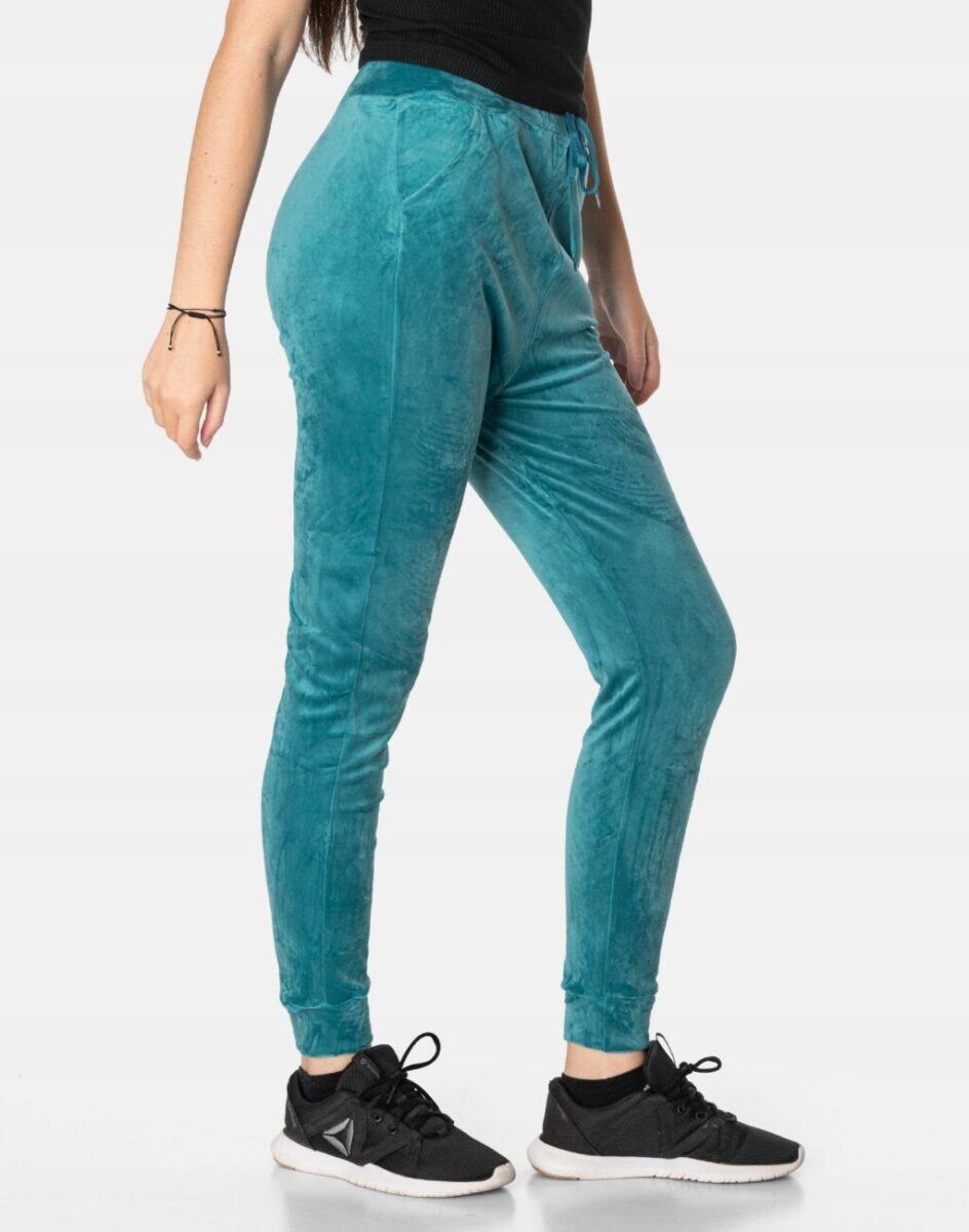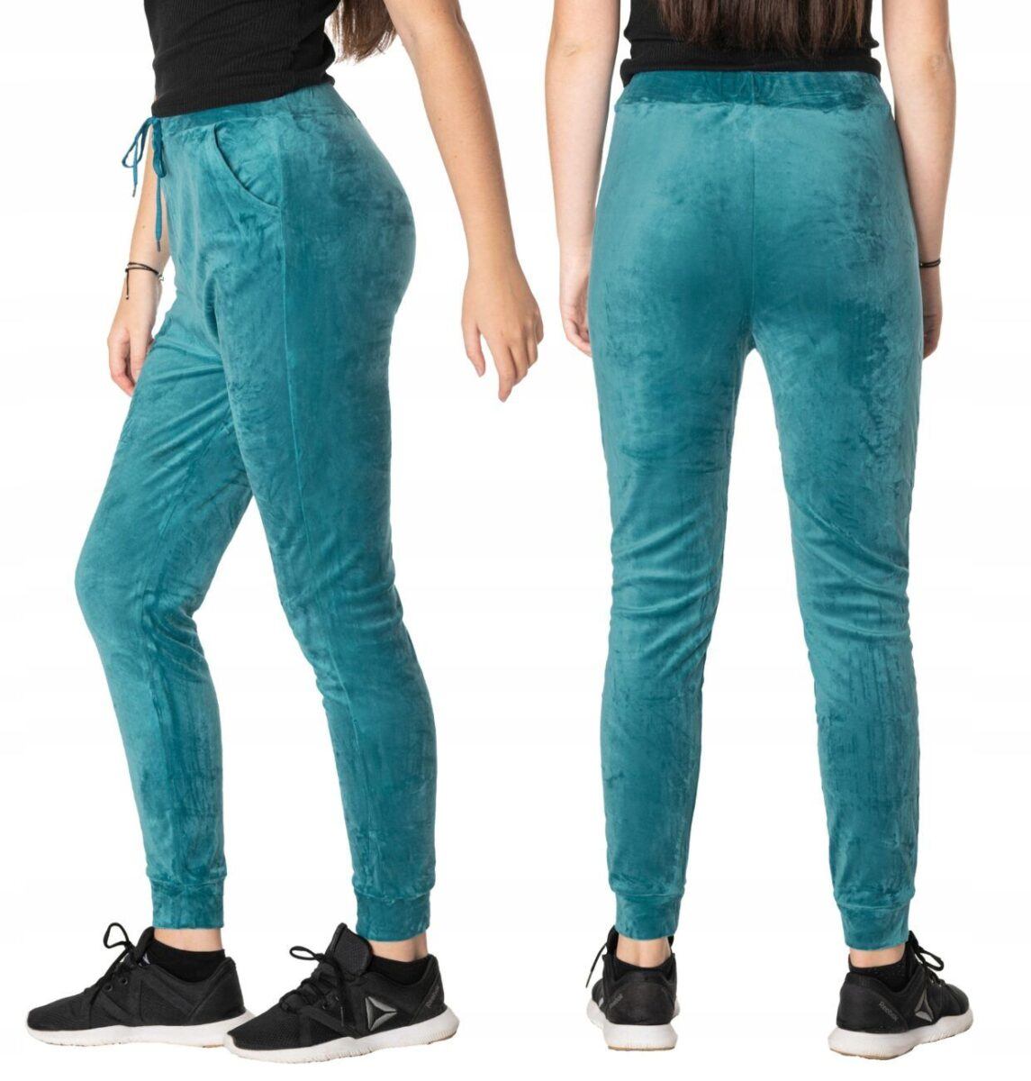Spodnie sportowe damskie z puszystego weluru to wyjątkowo komfortowe, ciepłe, i bardzo praktyczne okrycie wierzchnie na sezon przejściowy i zimowy o szerokich możliwościach wykorzystania. Wykonane z miękkiej, przyjemnej w dotyku, ciepłej dzianiny welurowej z delikatnym włoskiem, dostosowanej do użytku w zmiennych warunkach i niskiej temperaturze, która zapewnia wysoki współczynnik ochrony termicznej w stosunku do wagi. To komfortowo skrojony model w stylu sport-casual z lekko zwężaną nogawką zakończoną ściągaczem. Z założenia wyróżniają się dużą wygodą a dopasowanie w pasie zapewnia szeroki, elastyczny pas ściągający zgrabnie modelujący sylwetkę w talii.