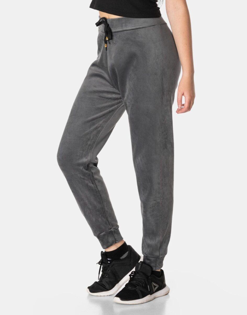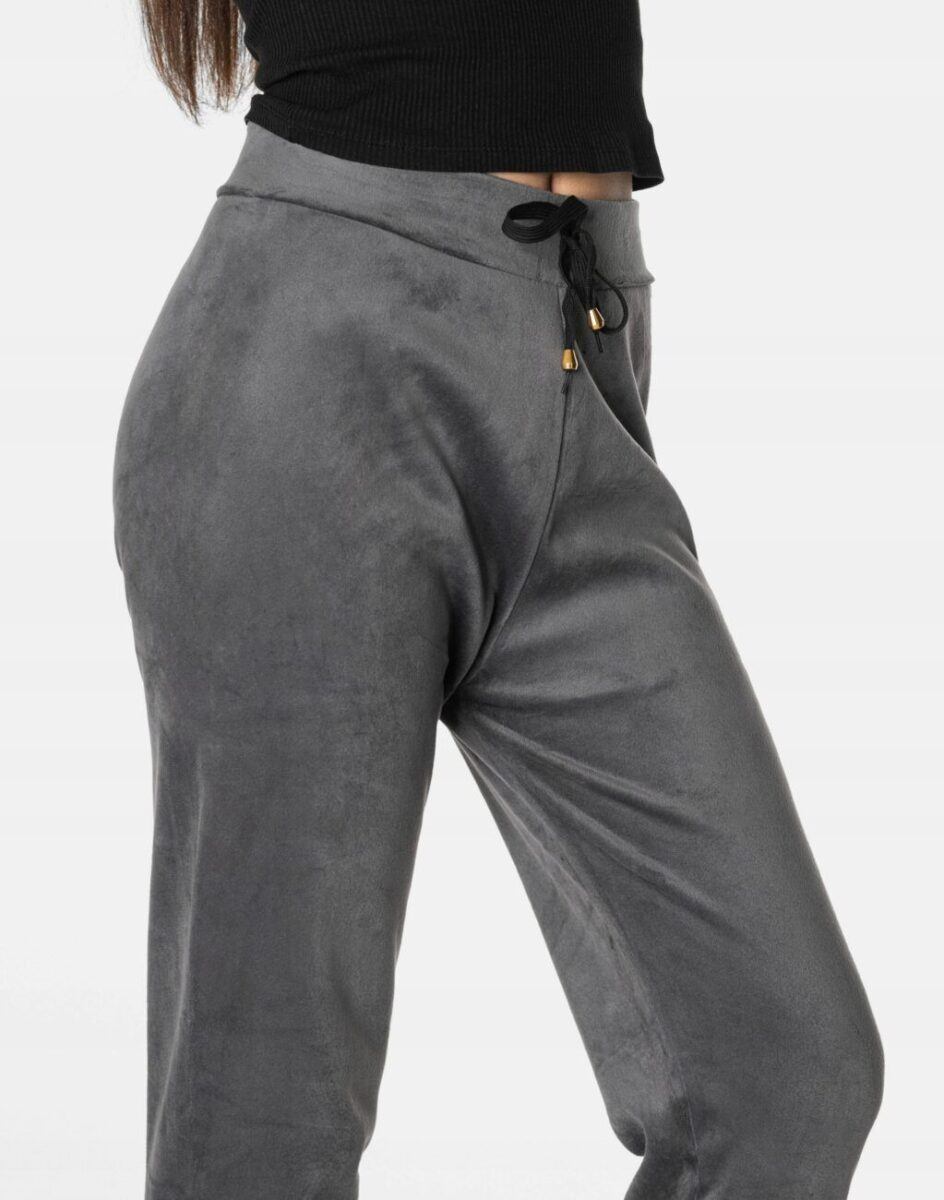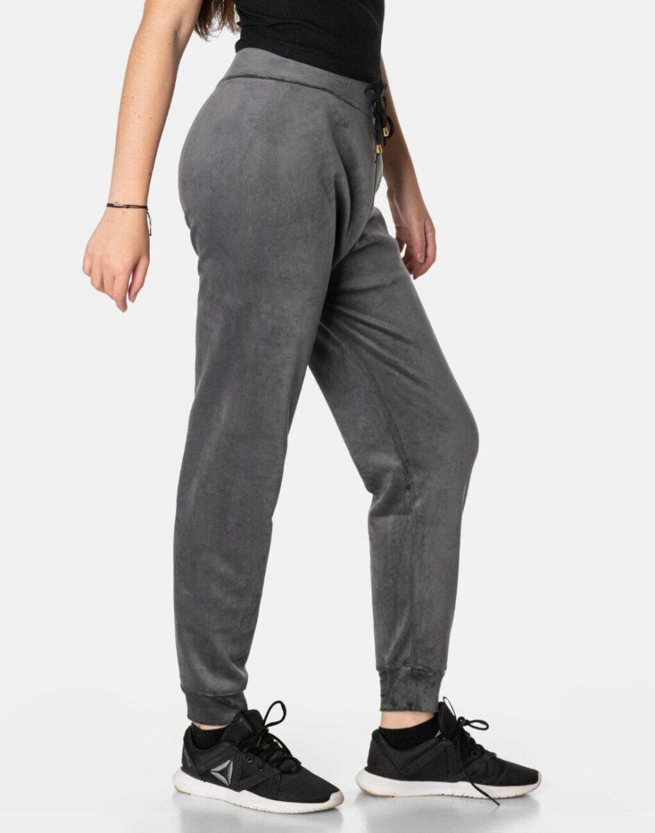 Spodnie sportowe damskie z puszystego weluru to wyjątkowo komfortowe, ciepłe, i bardzo praktyczne okrycie wierzchnie na sezon przejściowy i zimowy o szerokich możliwościach wykorzystania. Wykonane z miękkiej, przyjemnej w dotyku, ciepłej dzianiny welurowej z delikatnym włoskiem, dostosowanej do użytku w zmiennych warunkach i niskiej temperaturze, która zapewnia wysoki współczynnik ochrony termicznej w stosunku do wagi. To komfortowo skrojony model w stylu sport-casual z lekko zwężaną nogawką zakończoną ściągaczem. Z założenia wyróżniają się dużą wygodą a dopasowanie w pasie zapewnia szeroki, elastyczny pas ściągający zgrabnie modelujący sylwetkę w talii. Wewnętrzna strona spodni posiada wykończenie typu „MESCH” (fabrycznie wykończona jest miłym w dotyku i przyjemnym dla ciała meszkiem przypominającym futerko) zapewniające bardzo przyjemny kontakt ze skórą oraz komfort cieplny. Takie wykończenie wewnętrznej strony spodni zapewnia bardzo wysoki wskaźnik ochrony termicznej jak również zdecydowanie podnosi komfort użytkowania jesienią a zwłaszcza zimą.
