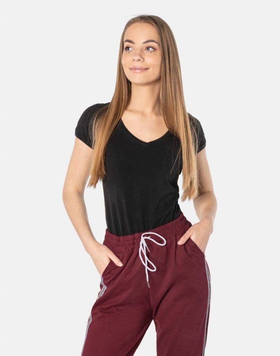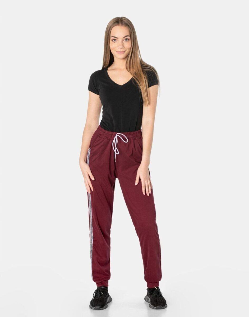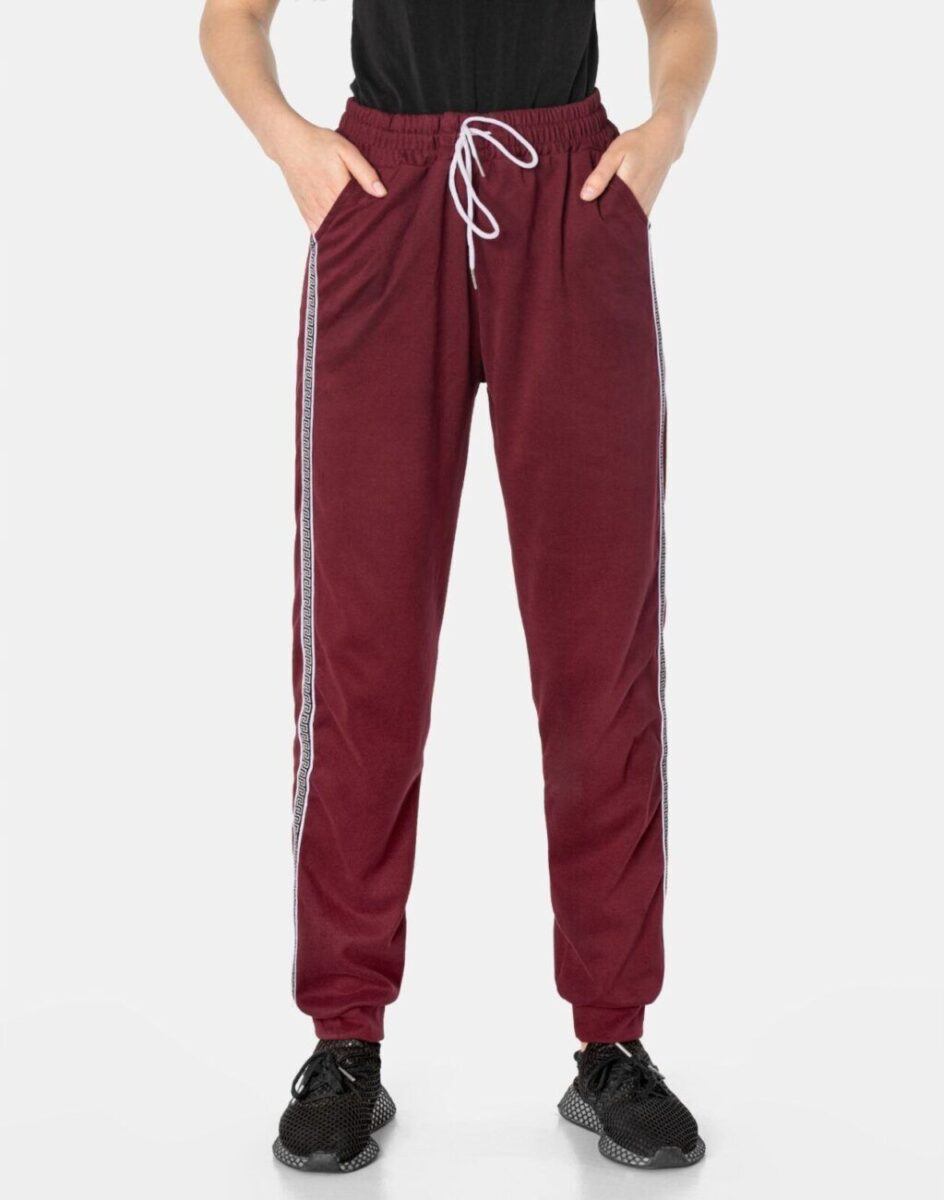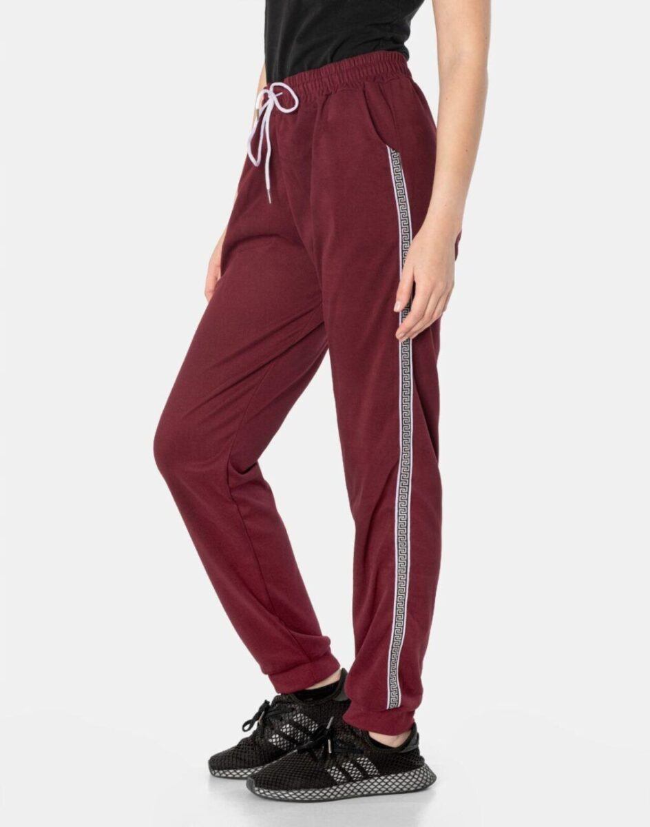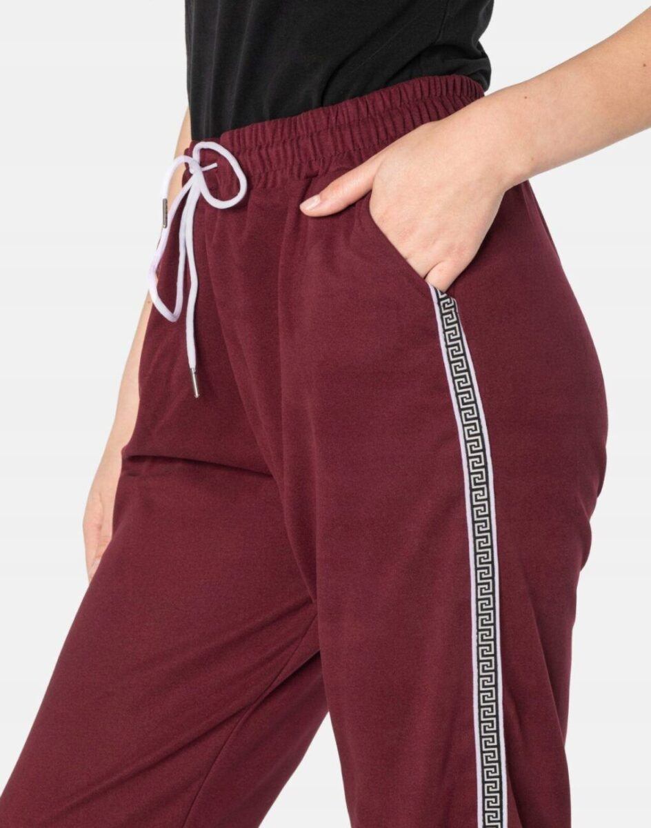 Spodnie sportowe damskie 819 to komfortowo skrojony model w stylu sport-casual ze zwężającymi się nogawkami zakończonymi elastycznym ściągaczem. Nogawki wykończone są ozdobnymi lampasami z motywem wzoru greckiej drogi, co nadaje im wyjątkowego charakteru. Z założenia wyróżniają się dużą wygodą a dopasowanie w pasie zapewnia szeroki, elastyczny pas ściągający oraz dodatkowo wpuszczona w pasek taśma regulacyjna z możliwością jej zawiązywania. Na bokach spodni znajdują się dwie wpuszczane kieszenie na dłonie. Ergonomiczny krój spodni nie ogranicza swobody ruchów a właściwe dla odzieży sportowej proporcje surowcowe i niewielka gramatura wpływają pozytywnie na komfort użytkowania. Sylwetka użytkownika staje się w nich optycznie smuklejsza i nabiera dynamicznego sportowego wyglądu.