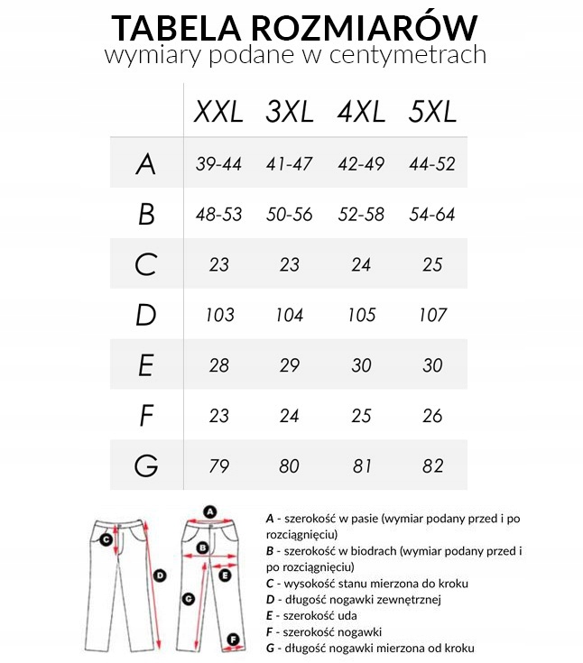 Proszę nie sugerować się rozmiarem podanym na metce przez producenta (np: S, M, XL czy XXL) ponieważ różne firmy stosują bardzo różne oznaczenia rozmiaru. Najlepiej jest zmierzyć swoje stare spodnie dokładnie centymetrem (bez rozciągania i po rozciągnięciu gumki w pasie) a następnie wybrać odpowiedni rozmiar podany w centymetrach z tabeli na naszych aukcjach.