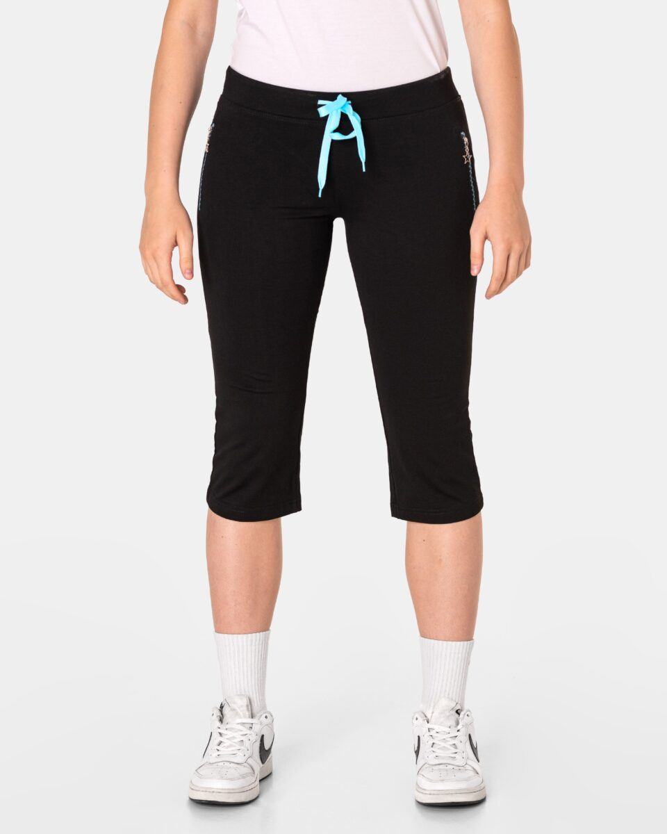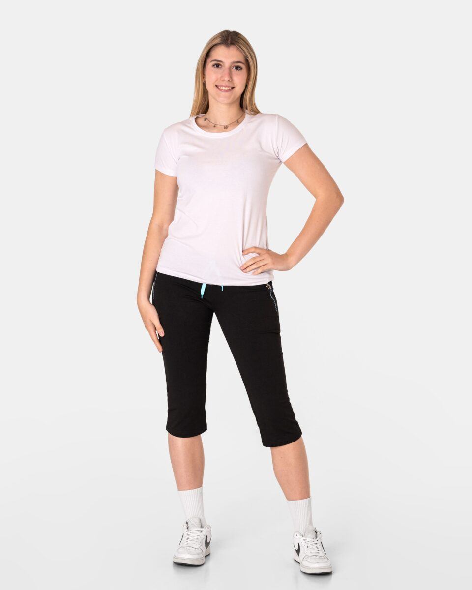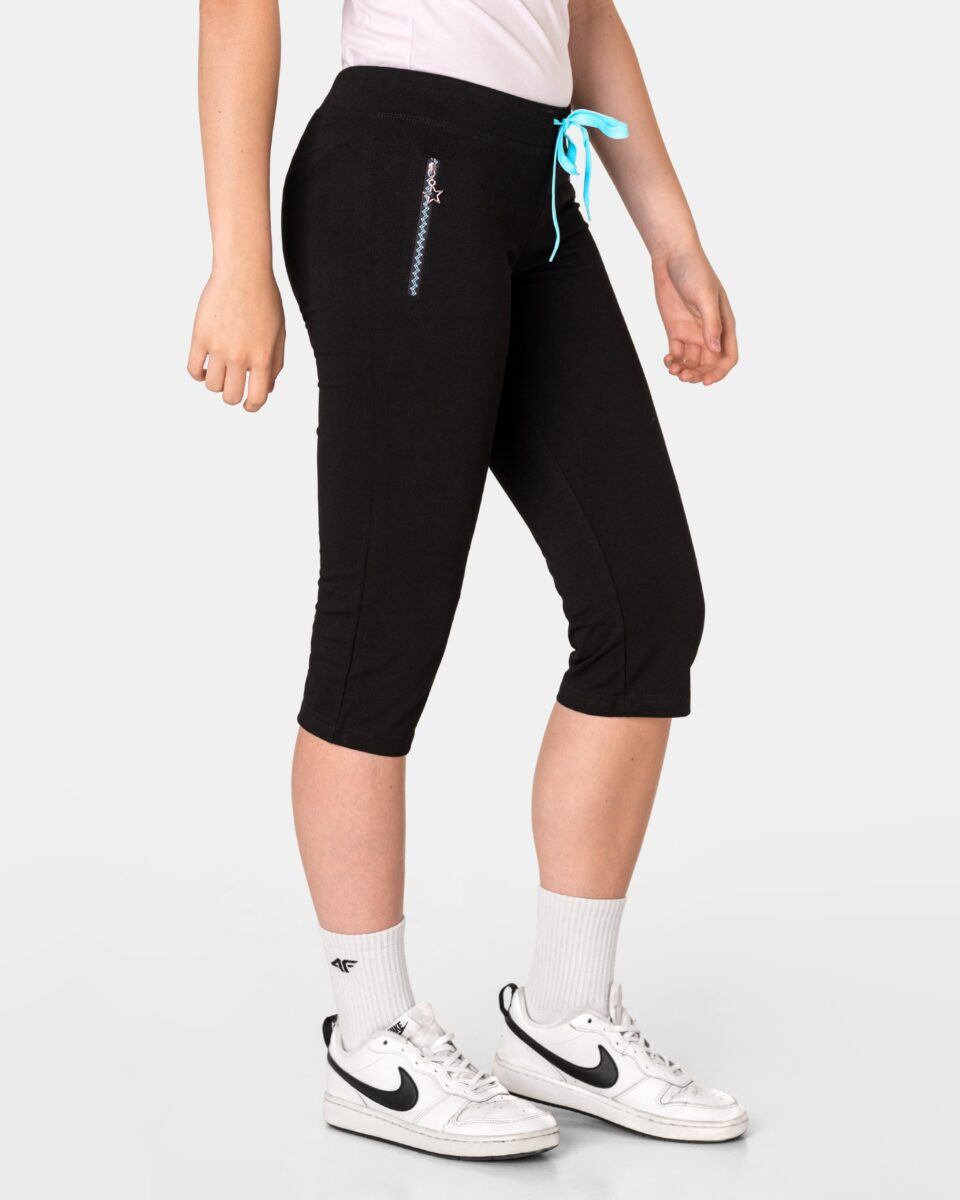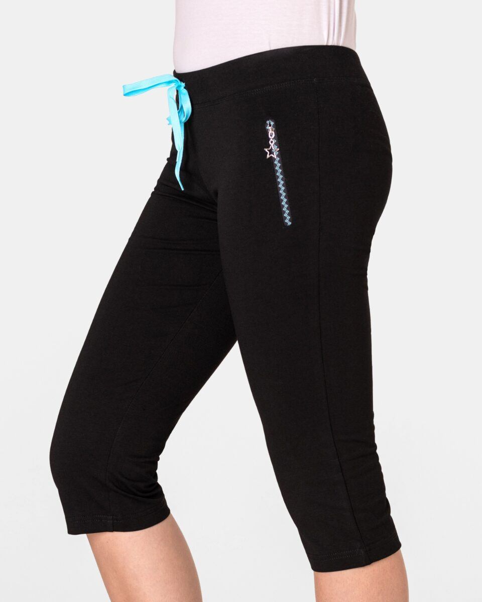 Komfortowe legginsy sportowe 3/4 z kolekcji Fitness&Sport są doskonałym wyborem dla kobiet aktywnych. Dopasowane, gładkie, z wysoką elastyczną talią i wąską, dopasowaną nogawką typu SLIM FIT gwarantują piękny opływowy kształt. Z założenia wyróżniają się dużą wygodą a dopasowanie w pasie zapewnia szeroki, elastyczny pas ściągający zgrabnie modelujący sylwetkę w talii oraz dodatkowo wpuszczona w pasek taśma regulacyjna z możliwością jej zawiązywania. Na bokach posiadają dwie wpuszczane kieszenie na dłonie, zasuwane na zamki błyskawiczne.Ozdobne kolorowe wstawki przy kieszeniach nadają im wyjątkowego charakteru i ożywiają sportowy look. Wysokiej klasy dzianina wykonana w nowoczesnej technologii, odprowadza wilgoć z powierzchni skóry, pozostawiając ją suchą nawet w czasie intensywnego wysiłku fizycznego, zwiększając w ten sposób komfort użytkowania. Materiał jest przyjemny w dotyku, elastyczny i długo zachowuje swoje właściwości. Struktura dzianiny zapewnia odpowiednią rozciągliwość i idealne dopasowanie do ciała zachowując jednocześnie pełną swobodę ruchów. Sylwetka użytkownika staje się w nich optycznie smuklejsza i nabiera dynamicznego sportowego wyglądu.
