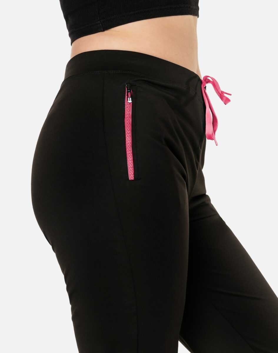 Spodnie sportowe damskie #4710 to komfortowo skrojony model w stylu sport-casual z podwyższoną elastyczną talią, prostymi nogawkami i kolorowymi wstawkami przy kieszeniach. Z założenia wyróżniają się dużą wygodą a dopasowanie w pasie zapewnia szeroki, elastyczny pas ściągający zgrabnie modelujący sylwetkę w talii, oraz dodatkowo wpuszczona w pasek taśma regulacyjna z możliwością jej zawiązywania. Z przodu dwie wpuszczane kieszenie na dłonie zasuwane na zamki, tył gładki bez kieszeni. Ergonomiczny krój spodni nie ogranicza swobody ruchów a właściwe dla odzieży sportowej proporcje surowcowe i niewielka gramatura wpływają pozytywnie na komfort użytkowania. Sylwetka użytkownika staje się w nich optycznie smuklejsza i nabiera dynamicznego sportowego wyglądu.