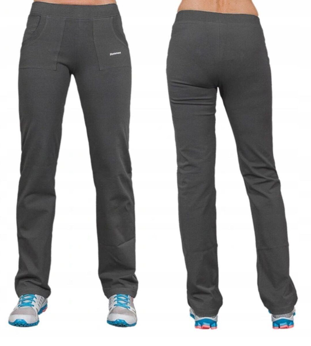 Sportowe spodnie damskie Rennox model 107 to komfortowo skrojony model z klasycznymi prostymi nogawkami. Z założenia wyróżniają się dużą wygodą, dopasowanie w pasie zapewnia szeroki, elastyczny pas ściągający. Na bokach dwie naszywane kieszenie na dłonie. Tył gładki bez kieszeni. Zawsze modna i wygodna klasyczna prosta nogawka.