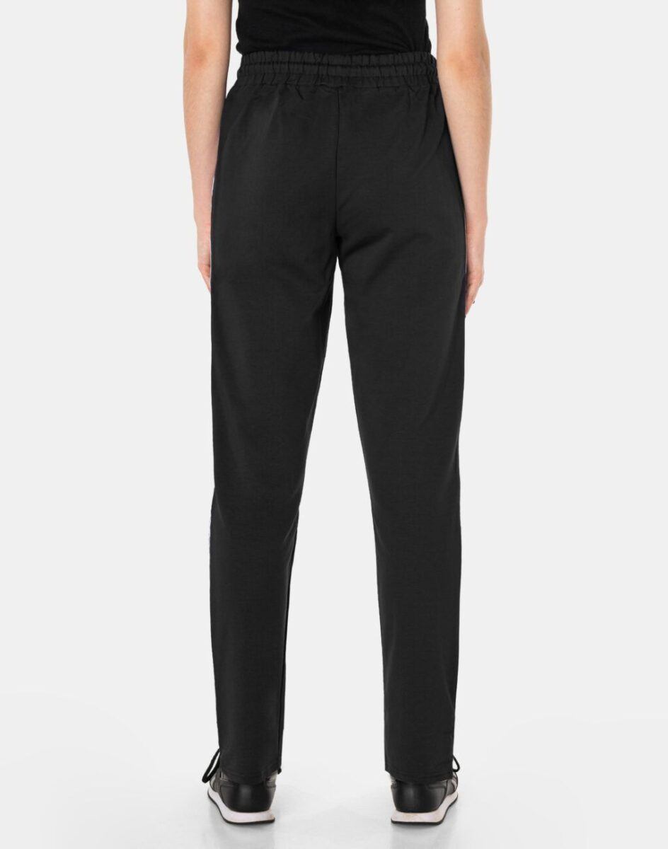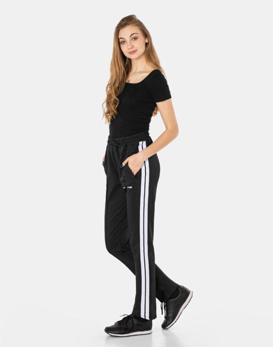 Spodnie sportowe damskie 657 to komfortowo skrojony model w stylu sport-casual z prostymi, klasycznymi nogawkami ozdobionymi lampasami co nadaje im wyjątkowego charakteru i ożywia sportowy look. Z założenia wyróżniają się dużą wygodą a dopasowanie w pasie zapewnia szeroki, elastyczny pas ściągający oraz dodatkowo wpuszczona w pasek taśma regulacyjna z możliwością jej zawiązywania. Na bokach spodni znajdują się dwie wpuszczane kieszenie na dłonie. Ergonomiczny krój spodni nie ogranicza swobody ruchów a właściwe dla odzieży sportowej proporcje surowcowe i niewielka gramatura wpływają pozytywnie na komfort użytkowania. Sylwetka użytkownika staje się w nich optycznie smuklejsza i nabiera dynamicznego sportowego wyglądu.