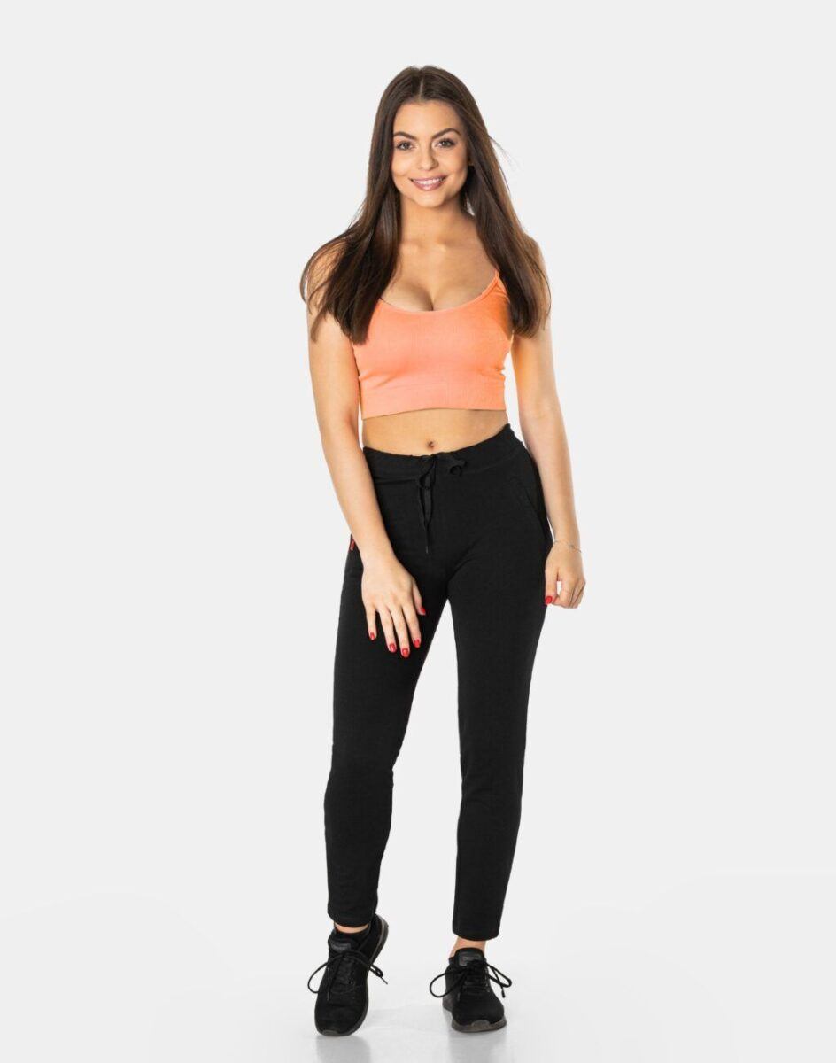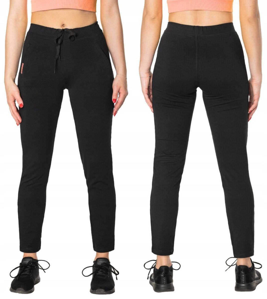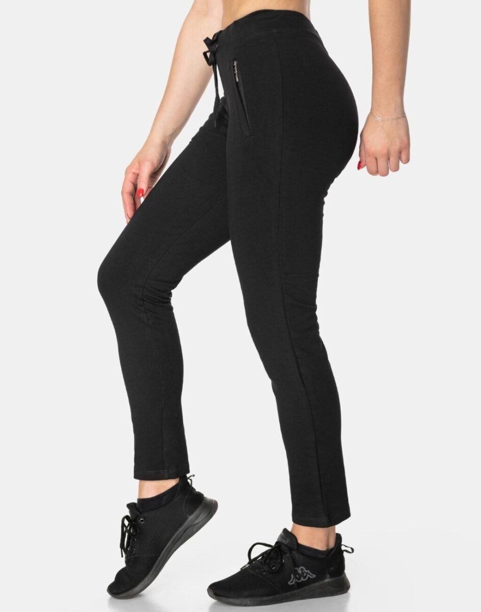 Spodnie sportowe damskie BENTER 46983 z kolekcji Fitness&Sport są doskonałym wyborem dla kobiet aktywnych. To komfortowo skrojony model w stylu sport-casual z wąskimi nogawkami. Z założenia wyróżniają się dużą wygodą a dopasowanie w pasie zapewnia szeroki, elastyczny pas ściągający oraz dodatkowo wpuszczona w pasek taśma regulacyjna z możliwością jej zawiązywania. Na bokach spodni znajdują się dwie wpuszczane kieszenie na dłonie, zasuwane za zamki błyskawiczne. Ergonomiczny krój spodni nie ogranicza swobody ruchów a właściwe dla odzieży sportowej proporcje surowcowe i niewielka gramatura wpływają pozytywnie na komfort użytkowania. Sylwetka użytkownika staje się w nich optycznie smuklejsza i nabiera dynamicznego sportowego wyglądu.