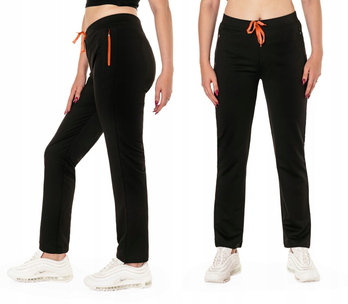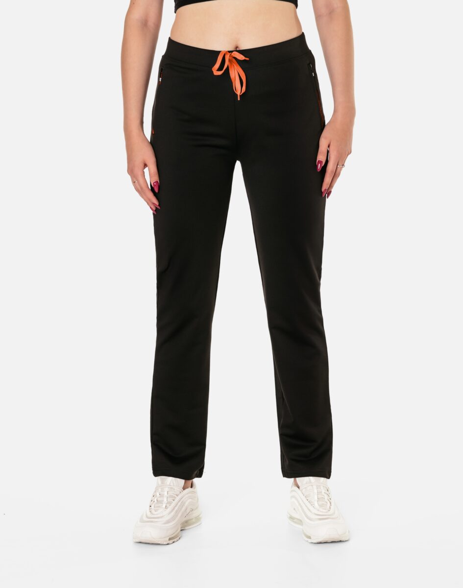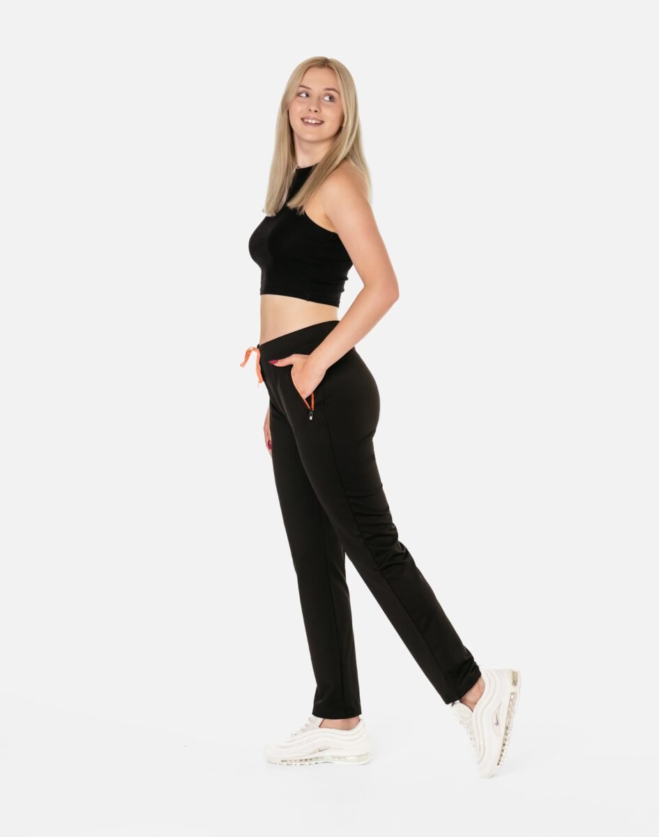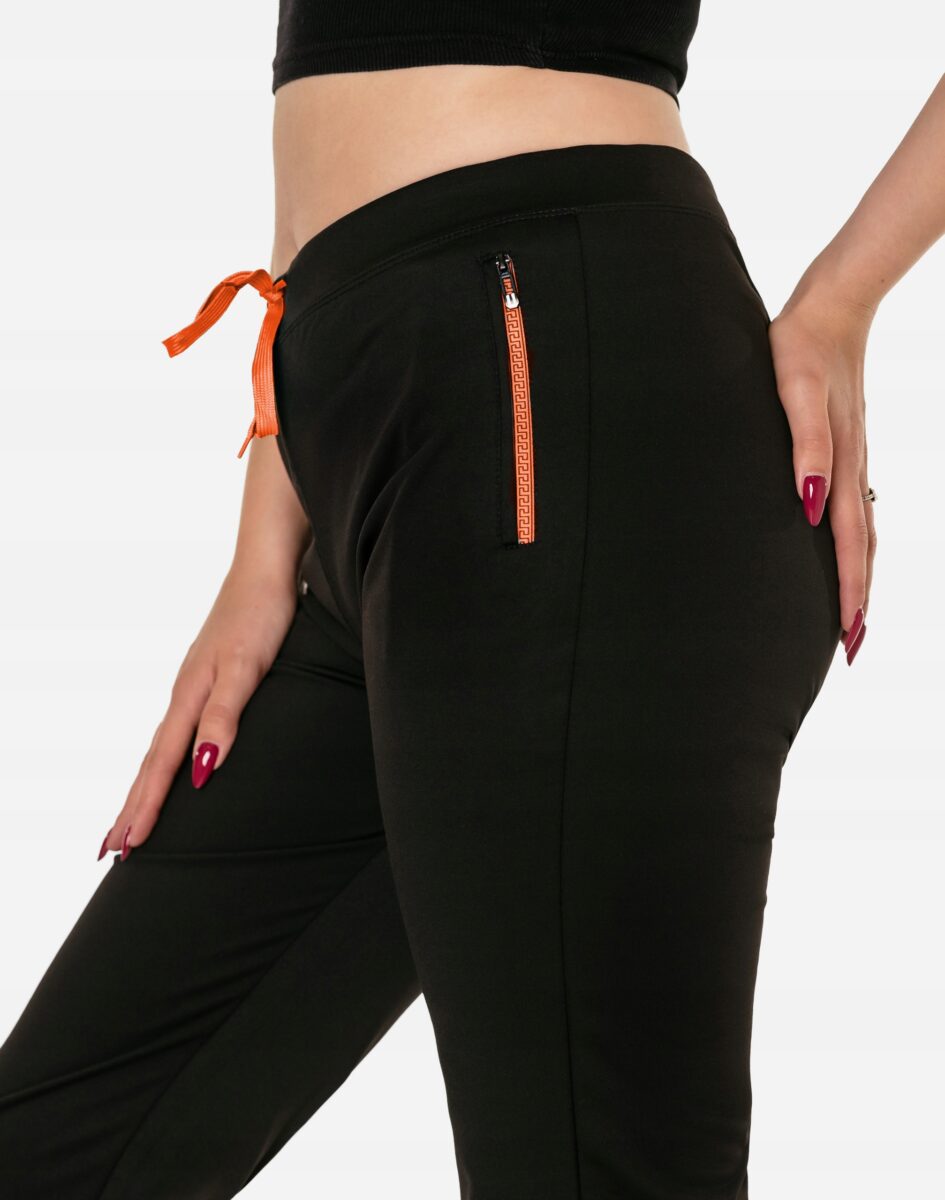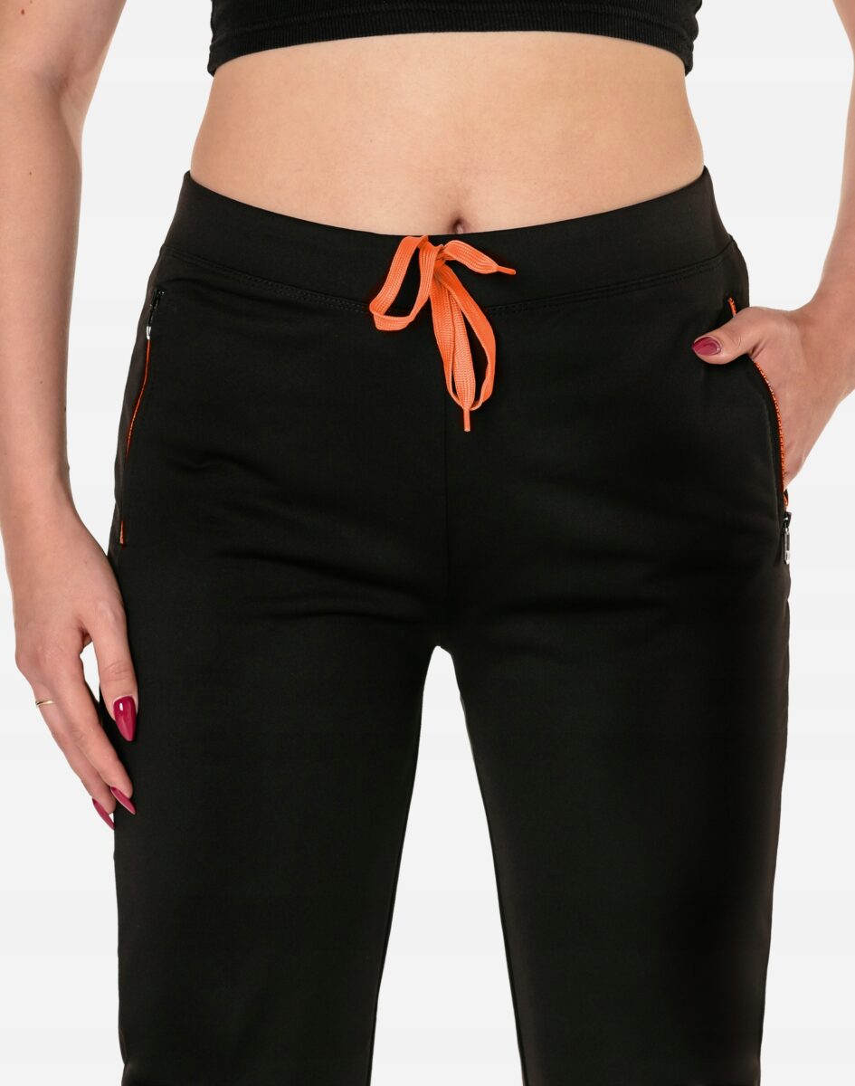 Spodnie sportowe damskie #4710 to komfortowo skrojony model w stylu sport-casual z podwyższoną elastyczną talią, prostymi nogawkami i kolorowymi wstawkami przy kieszeniach. Z założenia wyróżniają się dużą wygodą a dopasowanie w pasie zapewnia szeroki, elastyczny pas ściągający zgrabnie modelujący sylwetkę w talii, oraz dodatkowo wpuszczona w pasek taśma regulacyjna z możliwością jej zawiązywania. Z przodu dwie wpuszczane kieszenie na dłonie zasuwane na zamki, tył gładki bez kieszeni. Ergonomiczny krój spodni nie ogranicza swobody ruchów a właściwe dla odzieży sportowej proporcje surowcowe i niewielka gramatura wpływają pozytywnie na komfort użytkowania. Sylwetka użytkownika staje się w nich optycznie smuklejsza i nabiera dynamicznego sportowego wyglądu.