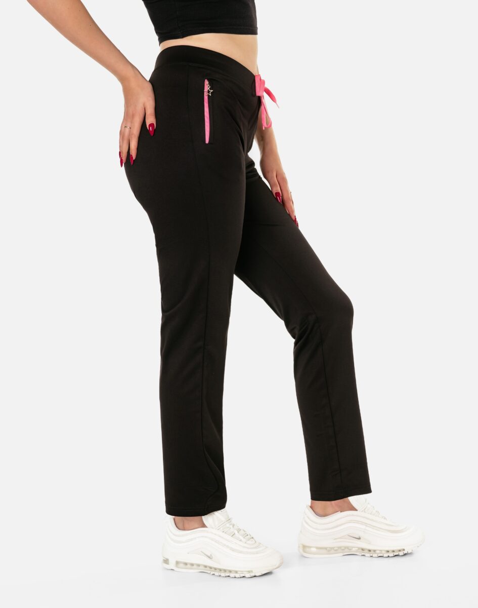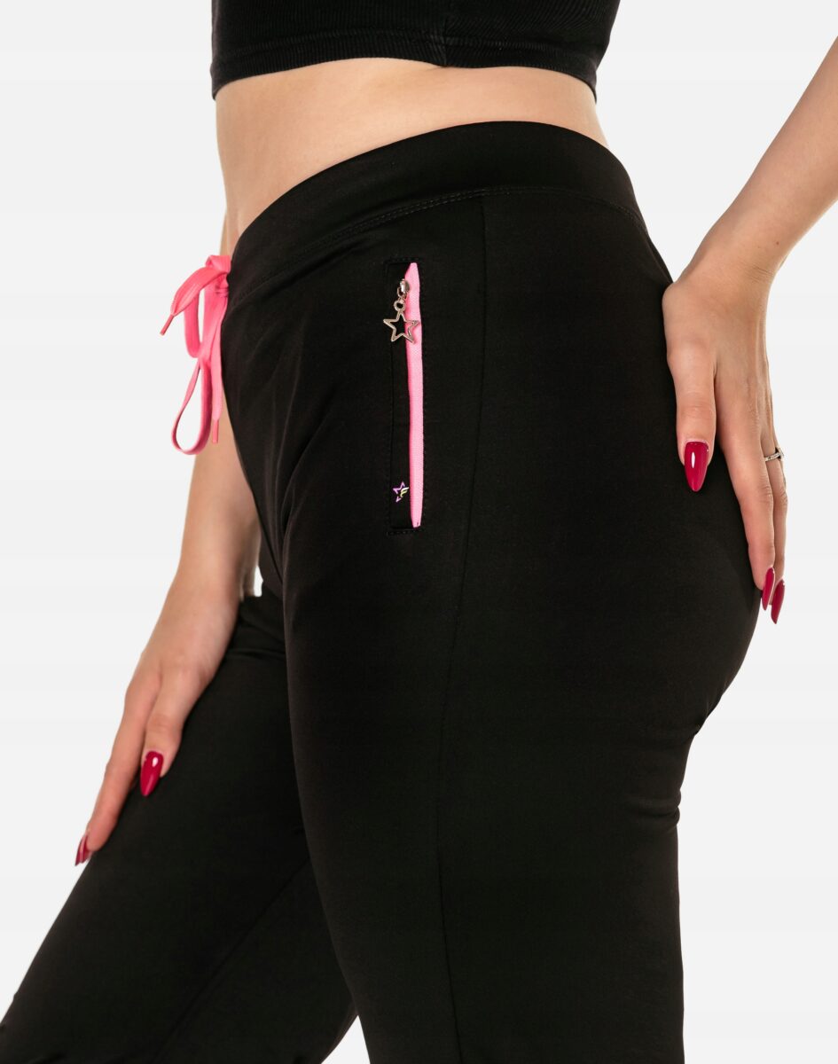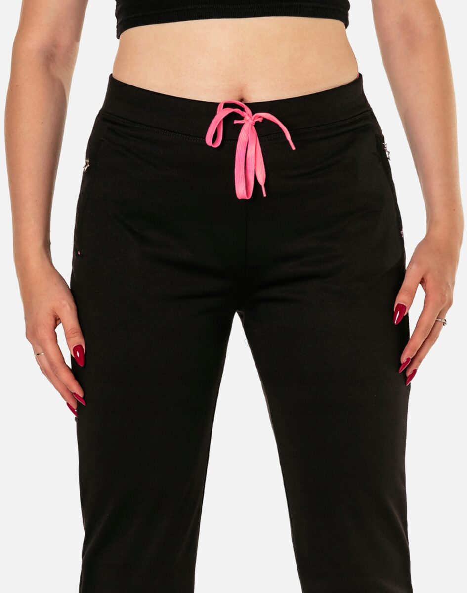 Spodnie sportowe damskie #4711 to komfortowo skrojony model w stylu sport-casual z podwyższoną elastyczną talią, prostymi nogawkami i kolorowymi wstawkami przy kieszeniach. Z założenia wyróżniają się dużą wygodą a dopasowanie w pasie zapewnia szeroki, elastyczny pas ściągający zgrabnie modelujący sylwetkę w talii, oraz dodatkowo wpuszczona w pasek taśma regulacyjna z możliwością jej zawiązywania. Z przodu dwie wpuszczane kieszenie na dłonie zasuwane na zamki, tył gładki bez kieszeni. Ergonomiczny krój spodni nie ogranicza swobody ruchów a właściwe dla odzieży sportowej proporcje surowcowe i niewielka gramatura wpływają pozytywnie na komfort użytkowania. Sylwetka użytkownika staje się w nich optycznie smuklejsza i nabiera dynamicznego sportowego wyglądu.