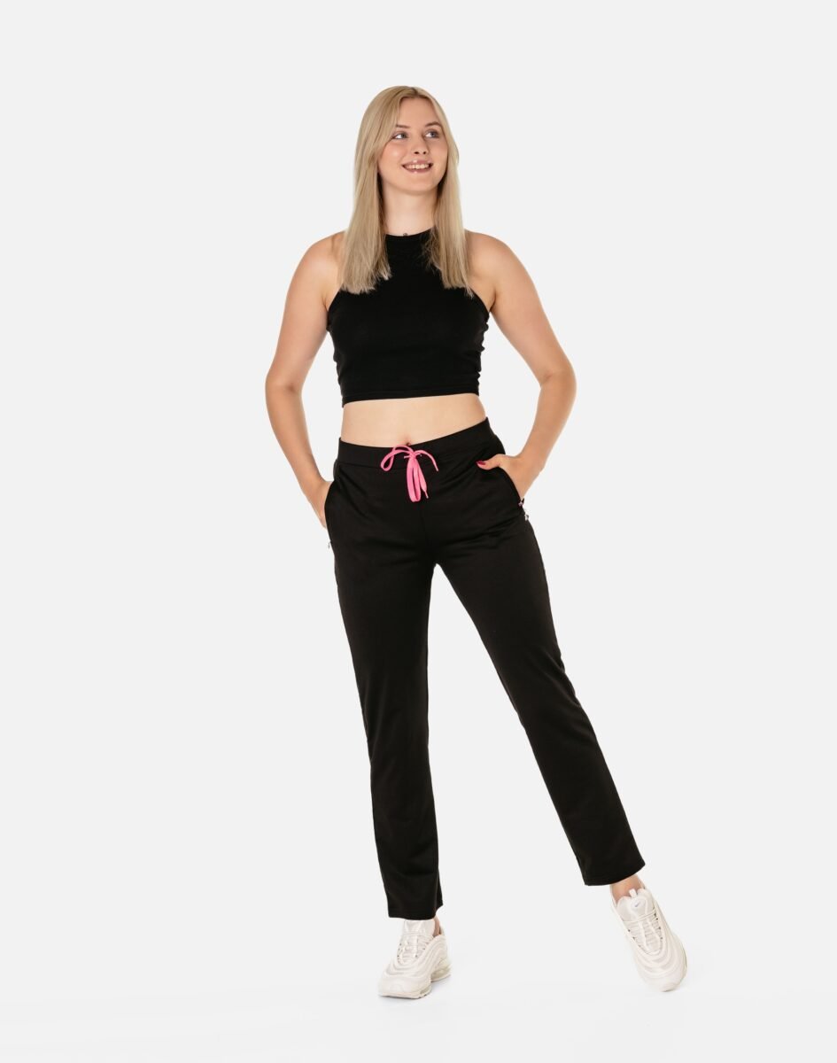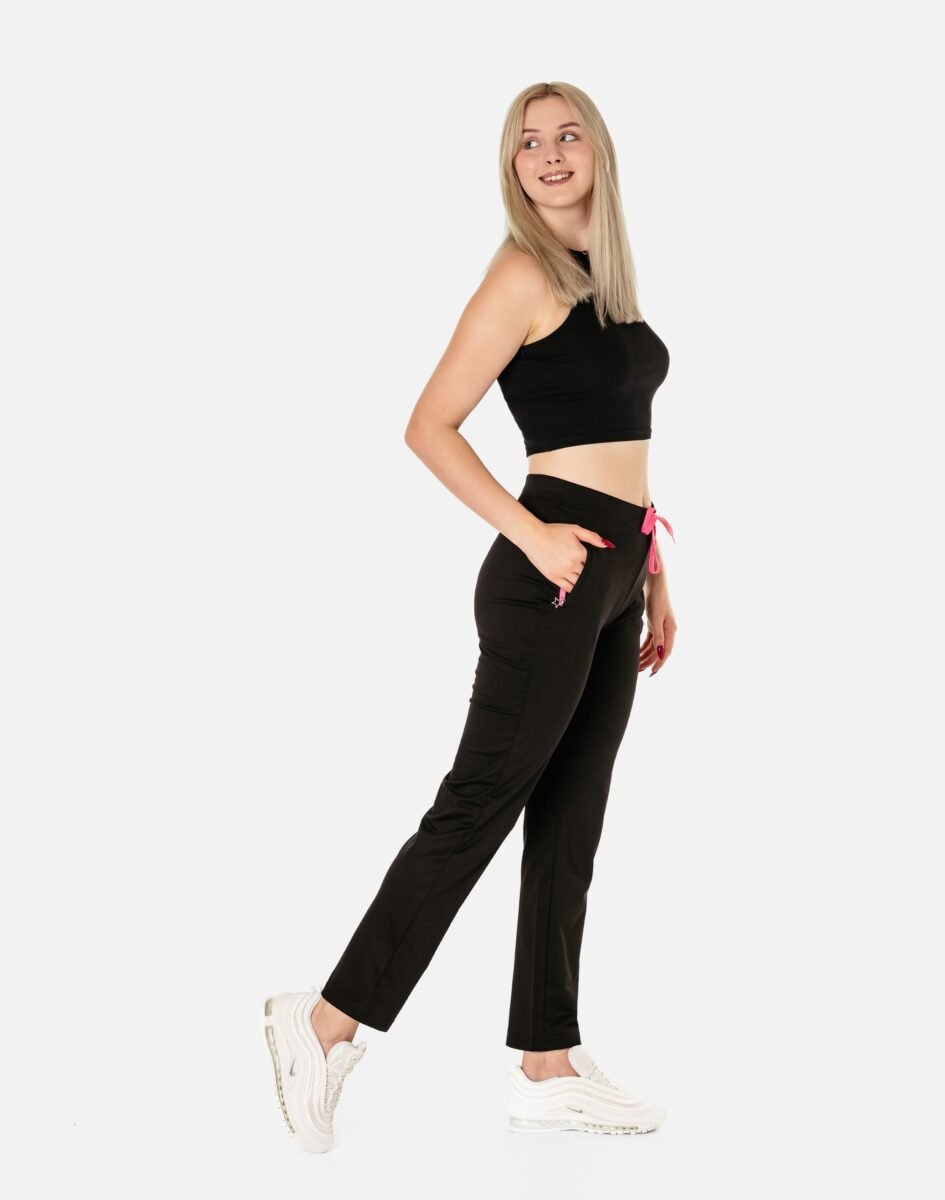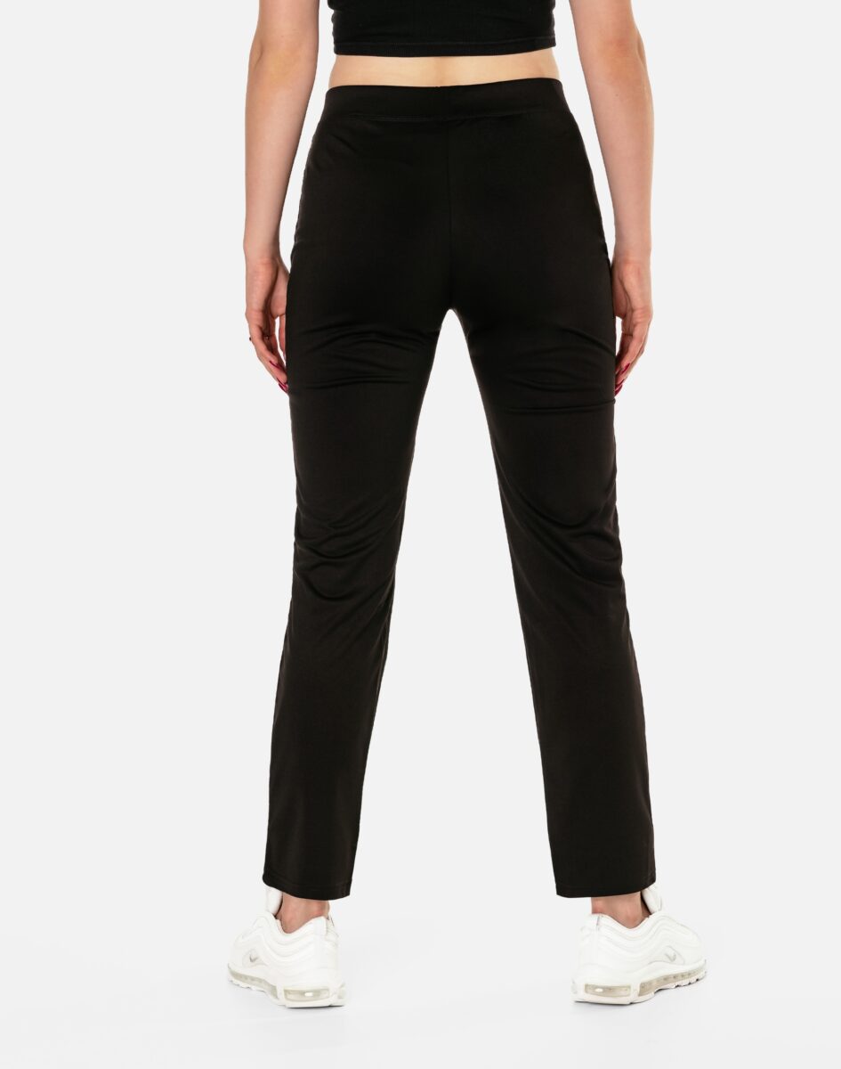 Spodnie sportowe damskie #4711 to komfortowo skrojony model w stylu sport-casual z podwyższoną elastyczną talią, prostymi nogawkami i kolorowymi wstawkami przy kieszeniach. Z założenia wyróżniają się dużą wygodą a dopasowanie w pasie zapewnia szeroki, elastyczny pas ściągający zgrabnie modelujący sylwetkę w talii, oraz dodatkowo wpuszczona w pasek taśma regulacyjna z możliwością jej zawiązywania. Z przodu dwie wpuszczane kieszenie na dłonie zasuwane na zamki, tył gładki bez kieszeni. Ergonomiczny krój spodni nie ogranicza swobody ruchów a właściwe dla odzieży sportowej proporcje surowcowe i niewielka gramatura wpływają pozytywnie na komfort użytkowania. Sylwetka użytkownika staje się w nich optycznie smuklejsza i nabiera dynamicznego sportowego wyglądu.
