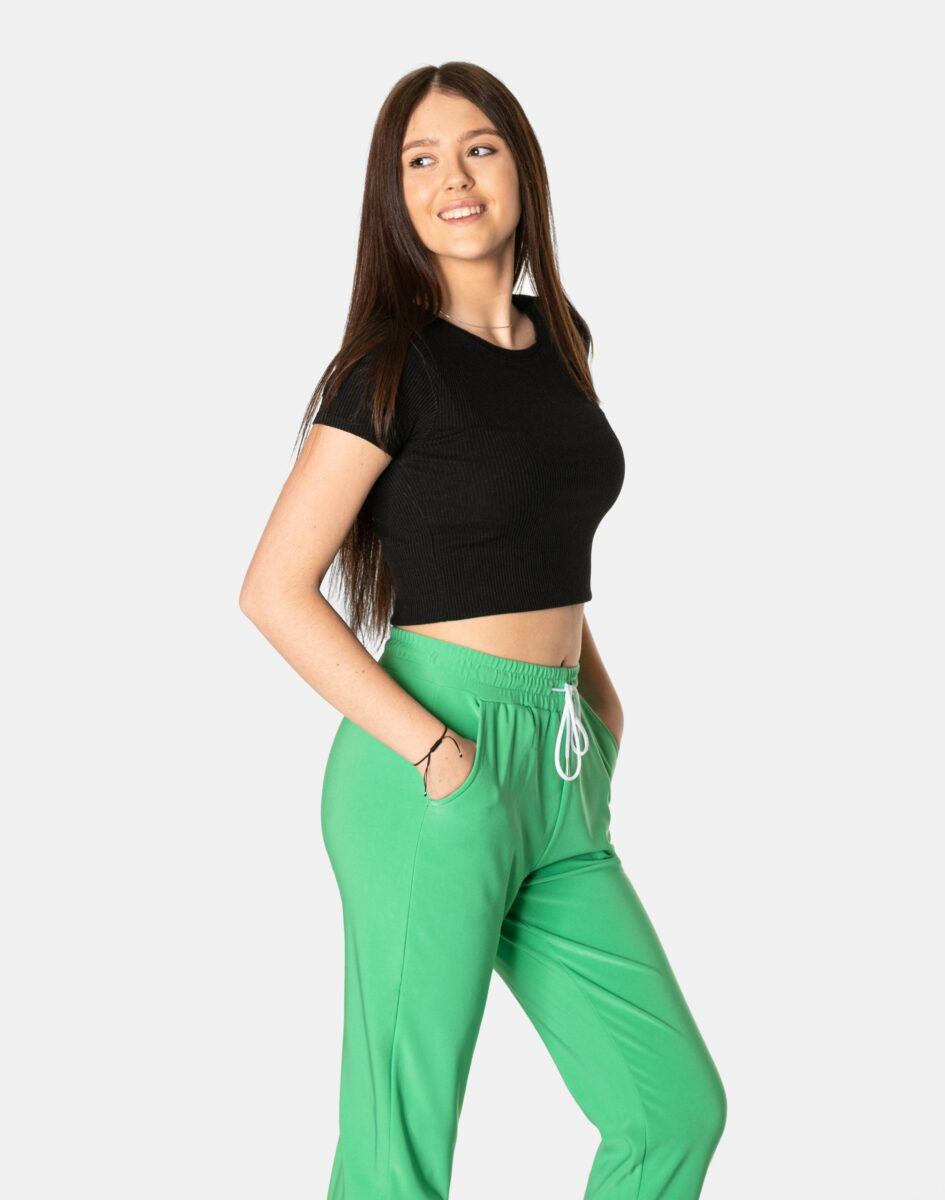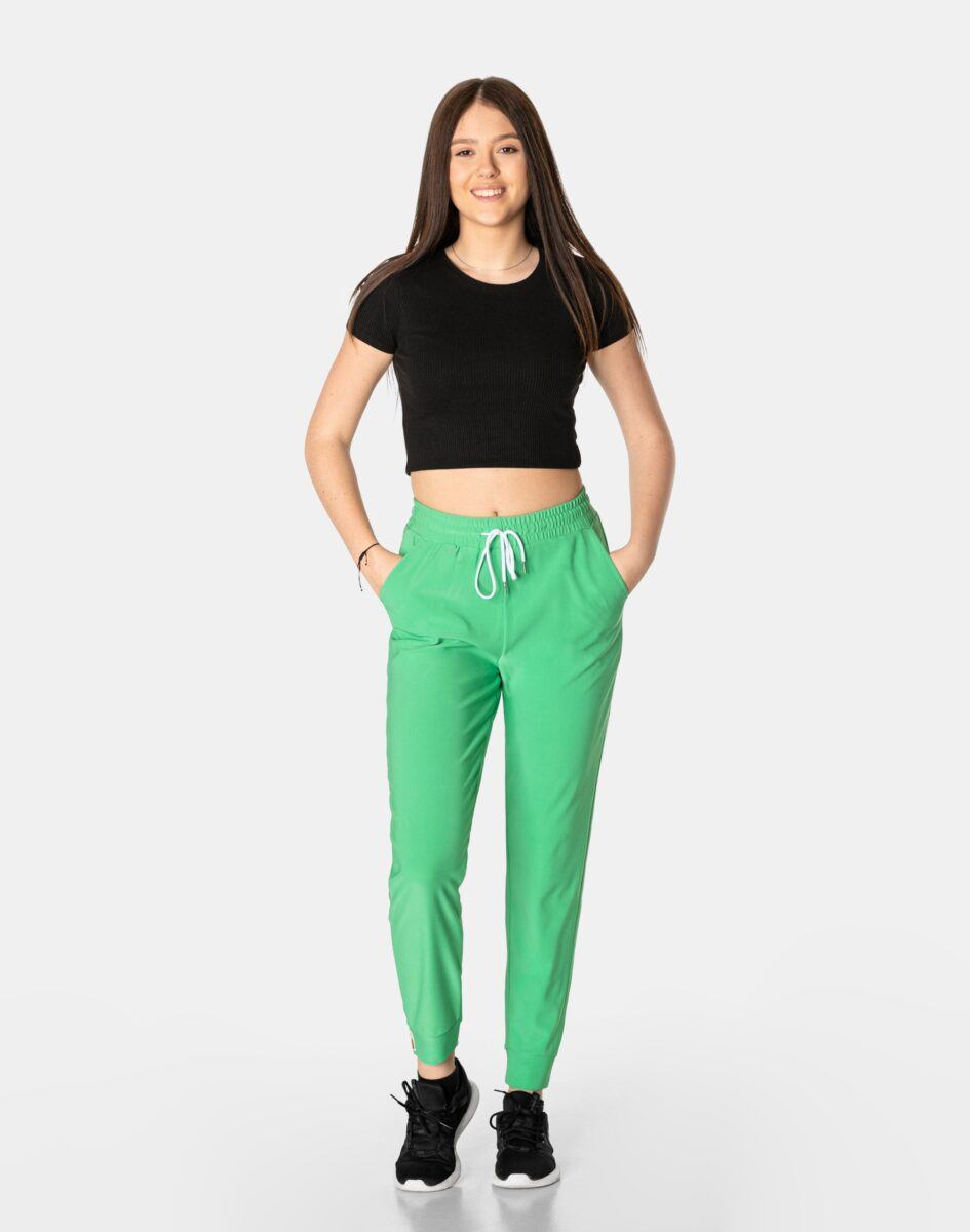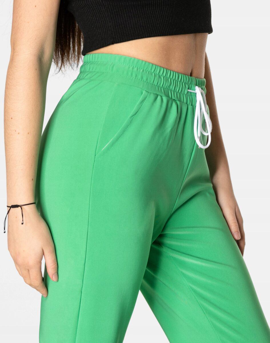 Spodnie sportowe damskie 99162 to komfortowo skrojony model w stylu sport-casual z podwyższoną elastyczną talią i zwężającymi się nogawkami zakończonymi ściągaczem. Z założenia wyróżniają się dużą wygodą a dopasowanie w pasie zapewnia szeroki, elastyczny pas ściągający zgrabnie modelujący talię, oraz dodatkowo wpuszczona w pasek taśma regulacyjna z możliwością jej zawiązywania. Z przodu dwie wpuszczane kieszenie na dłonie, tył gładki bez kieszeni. Ergonomiczny krój spodni nie ogranicza swobody ruchów a właściwe dla odzieży sportowej proporcje surowcowe i niewielka gramatura wpływają pozytywnie na komfort użytkowania. Sylwetka użytkownika staje się w nich optycznie smuklejsza i nabiera dynamicznego sportowego wyglądu.