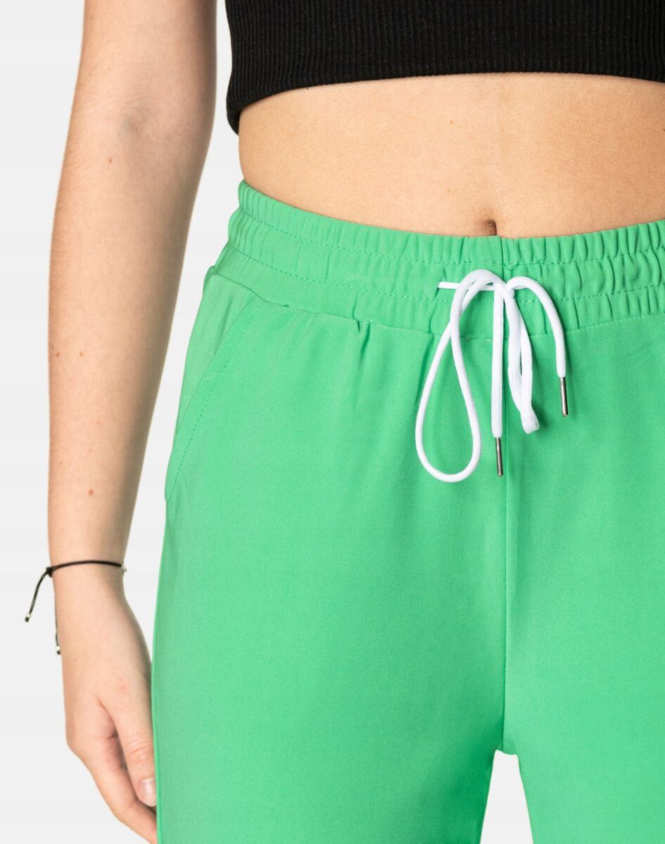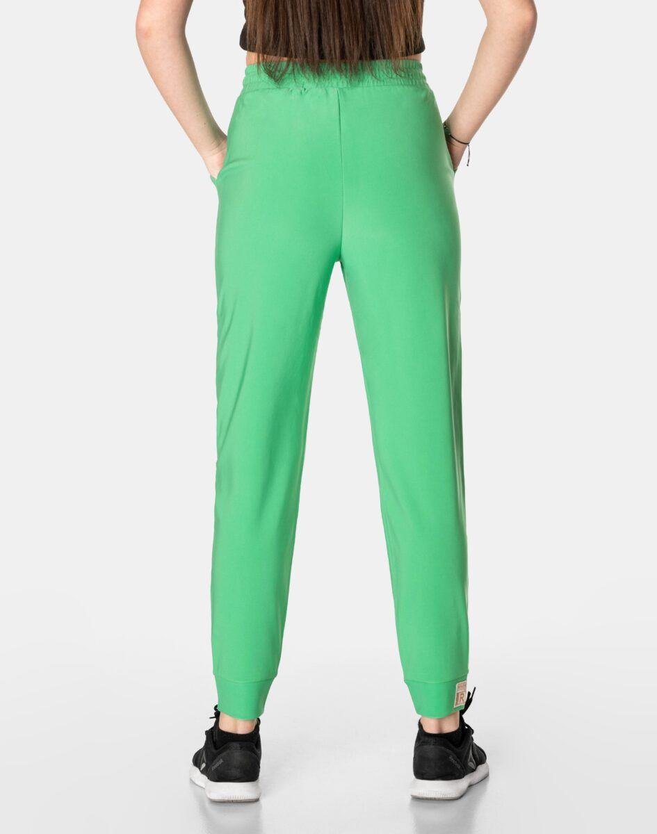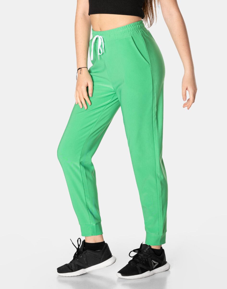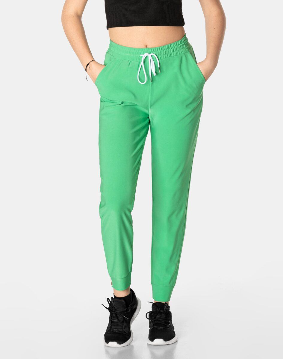 Spodnie sportowe damskie 99162 to komfortowo skrojony model w stylu sport-casual z podwyższoną elastyczną talią i zwężającymi się nogawkami zakończonymi ściągaczem. Z założenia wyróżniają się dużą wygodą a dopasowanie w pasie zapewnia szeroki, elastyczny pas ściągający zgrabnie modelujący talię, oraz dodatkowo wpuszczona w pasek taśma regulacyjna z możliwością jej zawiązywania. Z przodu dwie wpuszczane kieszenie na dłonie, tył gładki bez kieszeni. Ergonomiczny krój spodni nie ogranicza swobody ruchów a właściwe dla odzieży sportowej proporcje surowcowe i niewielka gramatura wpływają pozytywnie na komfort użytkowania. Sylwetka użytkownika staje się w nich optycznie smuklejsza i nabiera dynamicznego sportowego wyglądu.