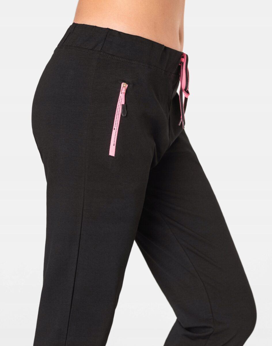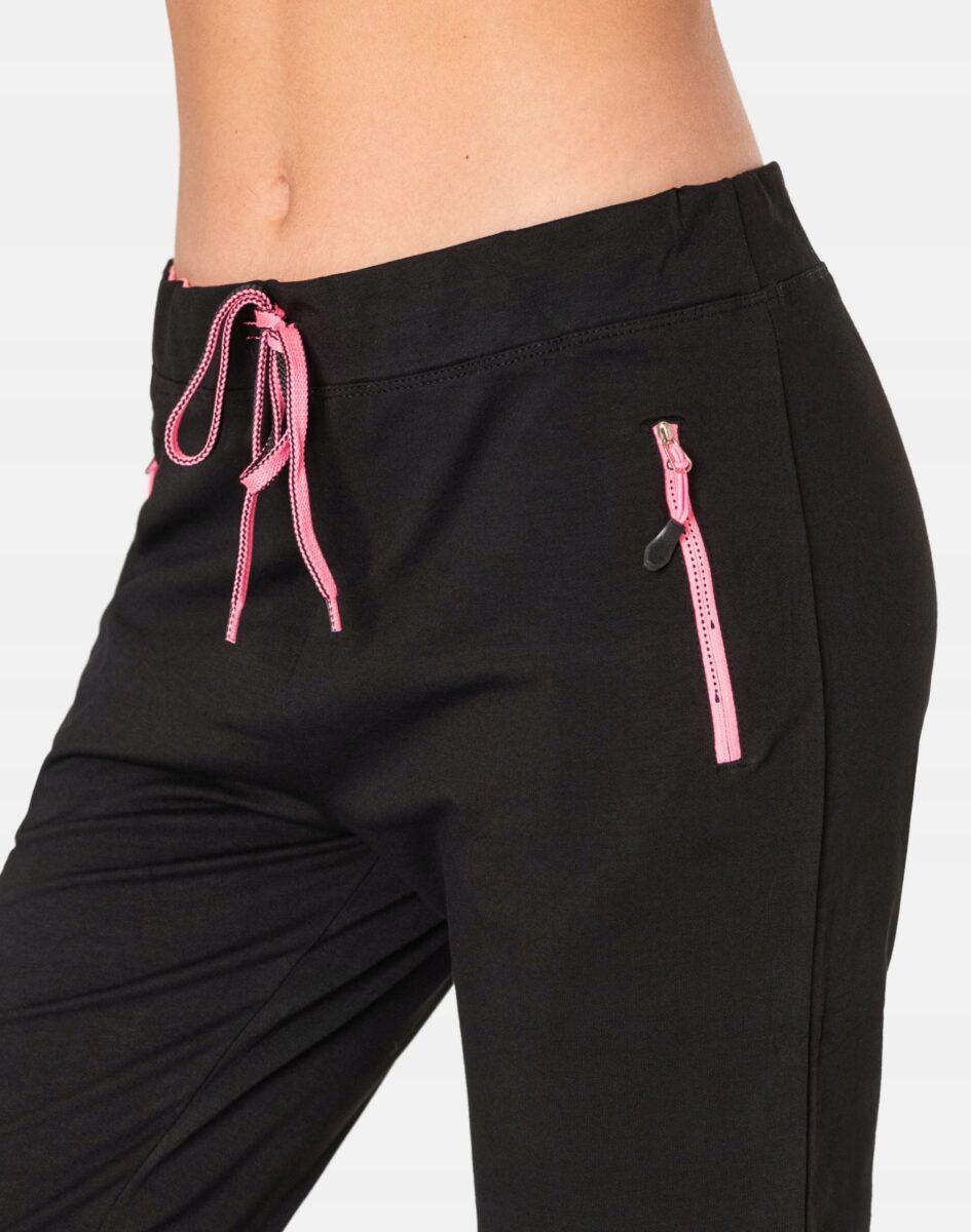 Spodnie sportowe damskie 2920P to komfortowo skrojony model w stylu sport-casual z podwyższoną elastyczną talią i zwężanymi nogawkami. Z założenia wyróżniają się dużą wygodą a dopasowanie w pasie zapewnia szeroki, elastyczny pas ściągający zgrabnie modelujący talię, oraz dodatkowo wpuszczona w pasek taśma regulacyjna z możliwością jej zawiązywania. Z przodu dwie wpuszczane kieszenie na dłonie, zasuwane na zamki błyskawiczne, tył gładki bez kieszeni. Ergonomiczny krój spodni nie ogranicza swobody ruchów, a właściwe dla odzieży sportowej proporcje surowcowe i niewielka gramatura wpływają pozytywnie na komfort użytkowania. Sylwetka użytkownika staje się w nich optycznie smuklejsza i nabiera dynamicznego sportowego wyglądu.