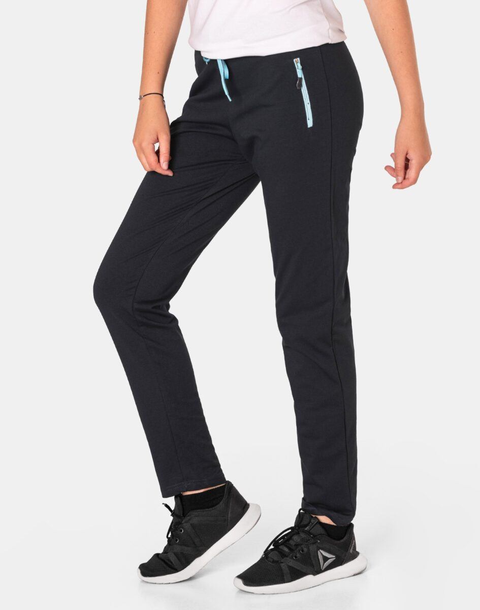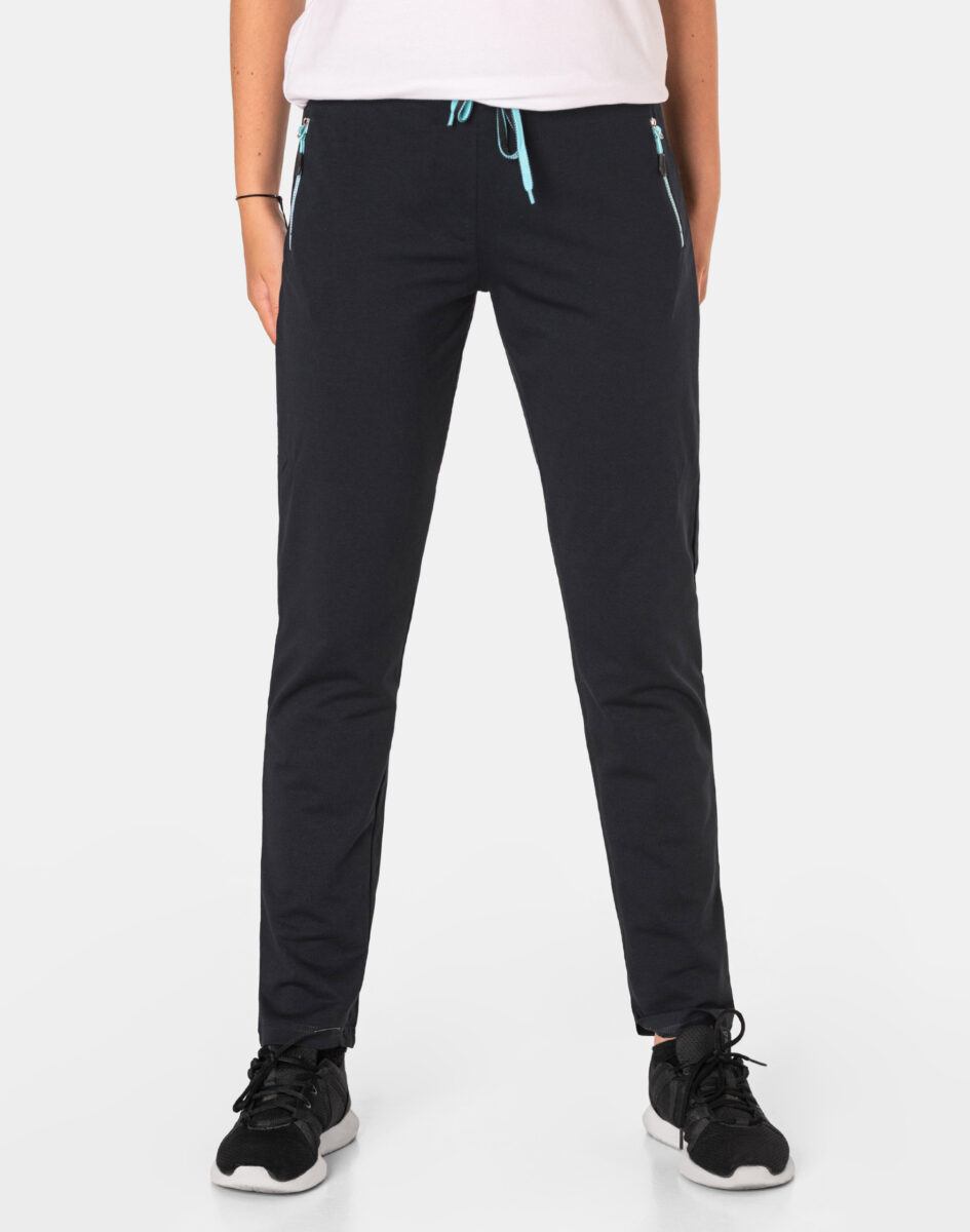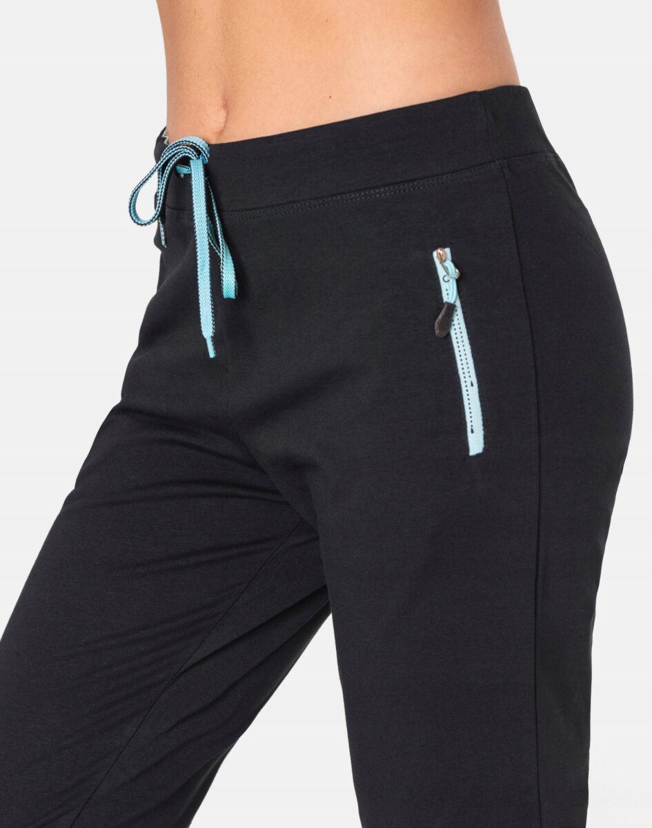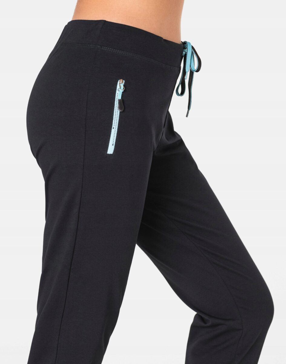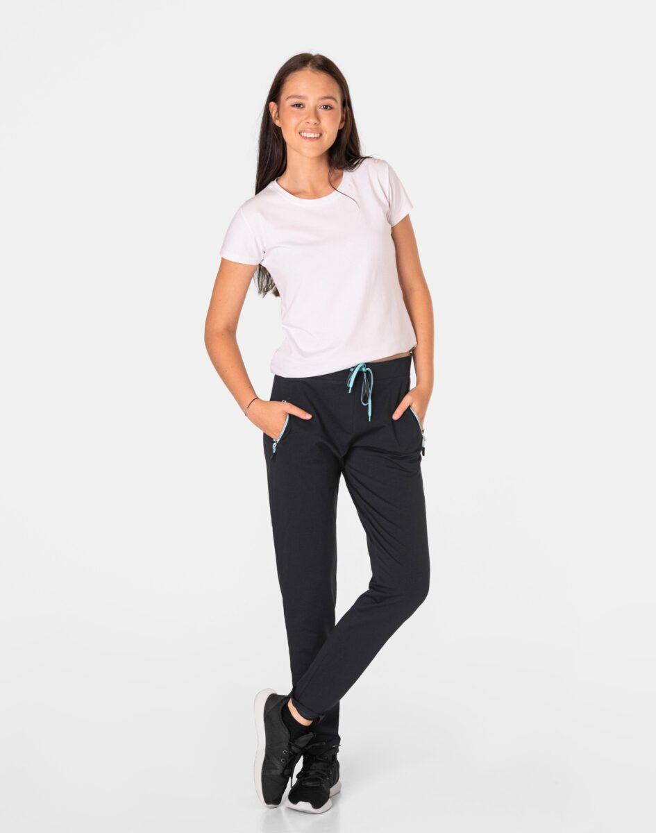 Spodnie sportowe damskie 2920P to komfortowo skrojony model w stylu sport-casual z podwyższoną elastyczną talią i zwężanymi nogawkami. Z założenia wyróżniają się dużą wygodą a dopasowanie w pasie zapewnia szeroki, elastyczny pas ściągający zgrabnie modelujący talię, oraz dodatkowo wpuszczona w pasek taśma regulacyjna z możliwością jej zawiązywania. Z przodu dwie wpuszczane kieszenie na dłonie, zasuwane na zamki błyskawiczne, tył gładki bez kieszeni. Ergonomiczny krój spodni nie ogranicza swobody ruchów, a właściwe dla odzieży sportowej proporcje surowcowe i niewielka gramatura wpływają pozytywnie na komfort użytkowania. Sylwetka użytkownika staje się w nich optycznie smuklejsza i nabiera dynamicznego sportowego wyglądu.