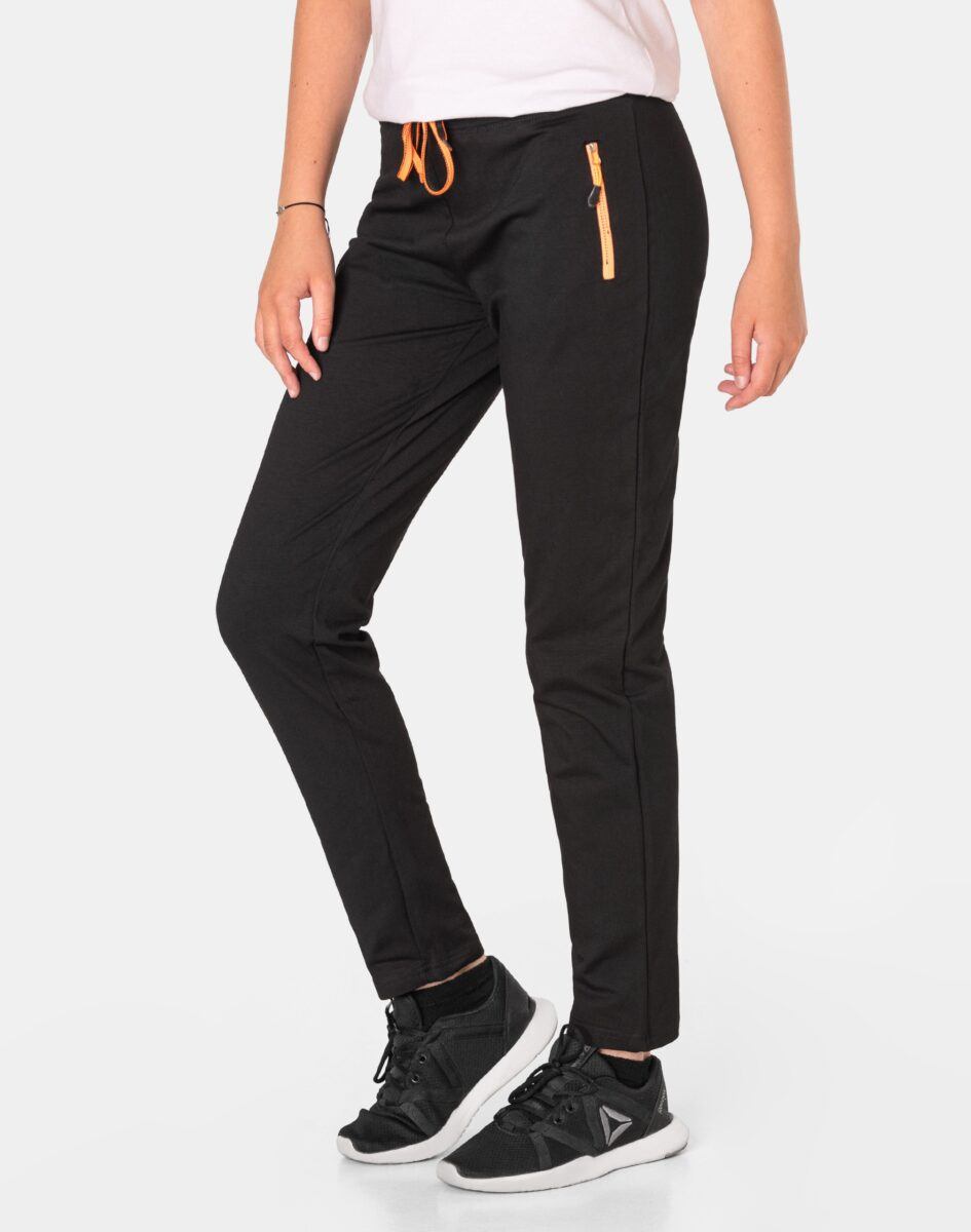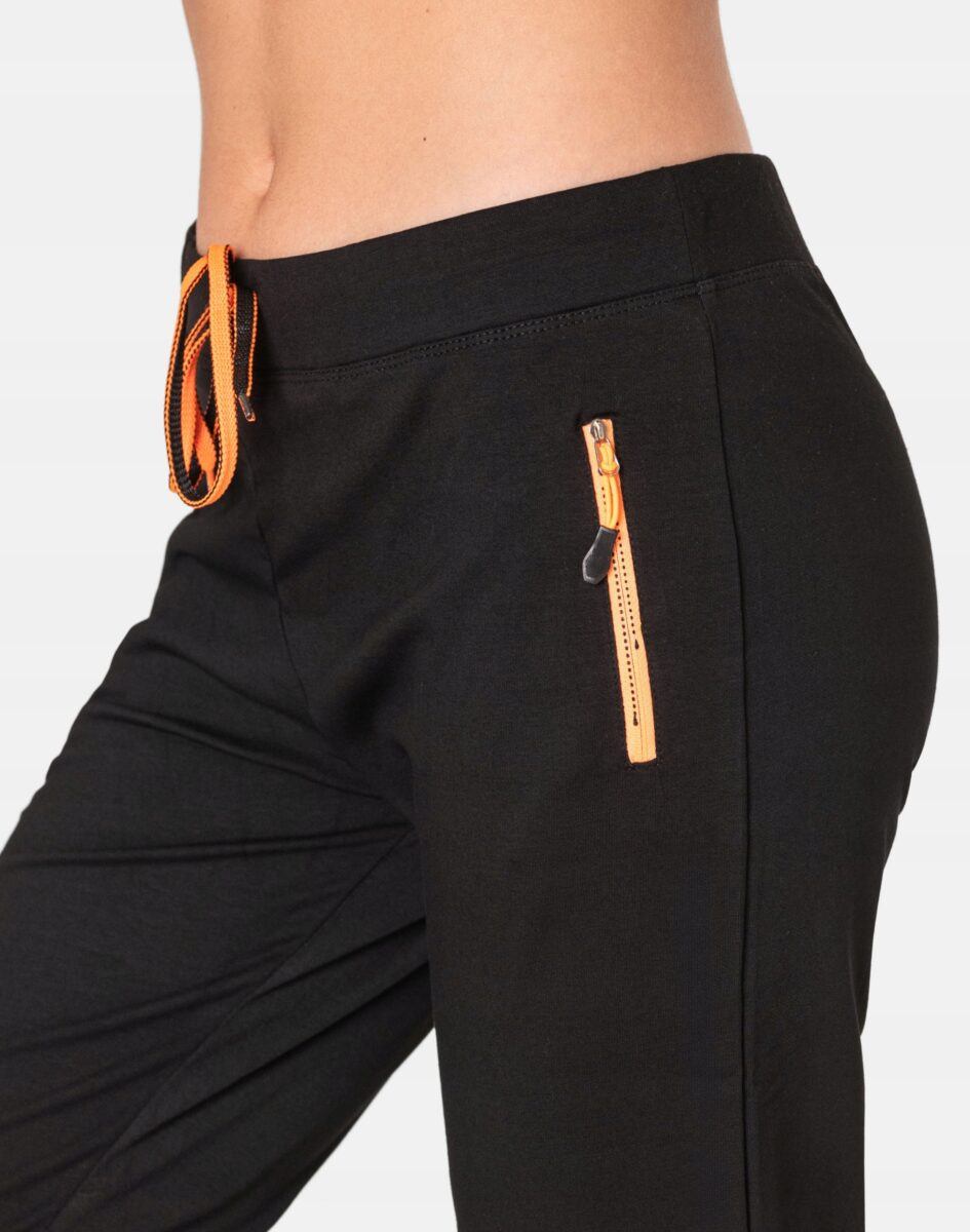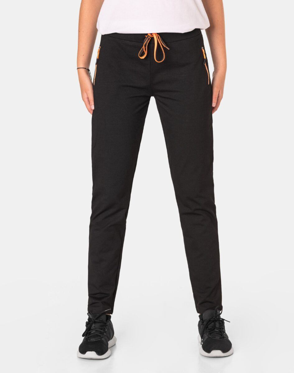 Spodnie sportowe damskie 2920P to komfortowo skrojony model w stylu sport-casual z podwyższoną elastyczną talią i zwężanymi nogawkami. Z założenia wyróżniają się dużą wygodą a dopasowanie w pasie zapewnia szeroki, elastyczny pas ściągający zgrabnie modelujący talię, oraz dodatkowo wpuszczona w pasek taśma regulacyjna z możliwością jej zawiązywania. Z przodu dwie wpuszczane kieszenie na dłonie, zasuwane na zamki błyskawiczne, tył gładki bez kieszeni. Ergonomiczny krój spodni nie ogranicza swobody ruchów, a właściwe dla odzieży sportowej proporcje surowcowe i niewielka gramatura wpływają pozytywnie na komfort użytkowania. Sylwetka użytkownika staje się w nich optycznie smuklejsza i nabiera dynamicznego sportowego wyglądu.