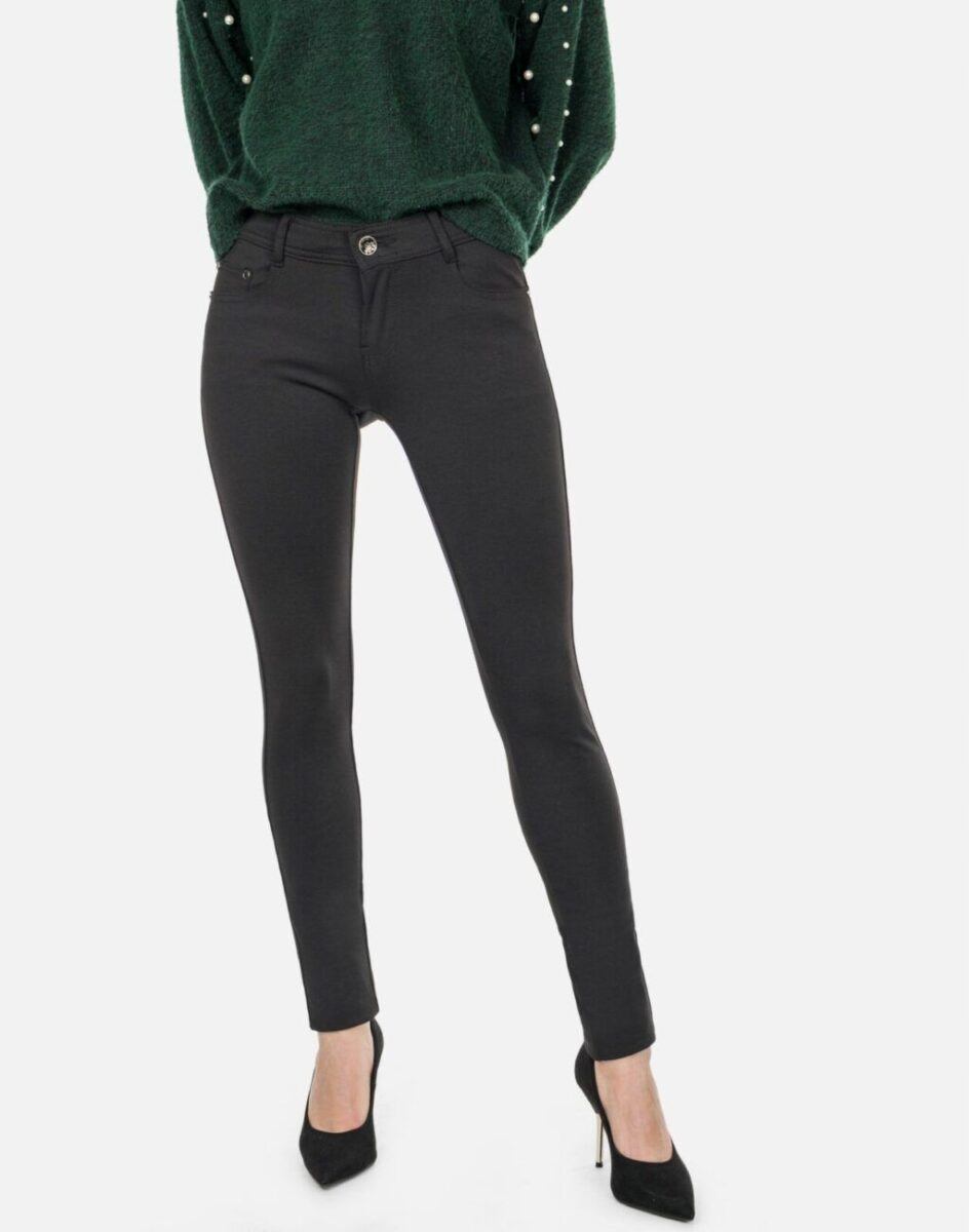 Spodnie damskie model 15080 to klasyczna czarna rurka o wyszczuplającym optycznie kobiecą sylwetkę fasonie i wyższym stanie. Zapinane są na zamek błyskawiczny i guzik sygnowany logiem firmy. Z przodu mają dwie kieszonki zaokrąglone oraz mniejszą kieszonkę tzw. bilonówkę, a na tyle klasyczne kieszenie naszywane jak w typowych spodniach jeansowych. W pasie szlufki umożliwiające stylizacje z paskiem. Najbardziej podatne na uszkodzenia miejsca wzmocnione są dodatkowymi przeszyciami oraz ozdobnymi nitami.