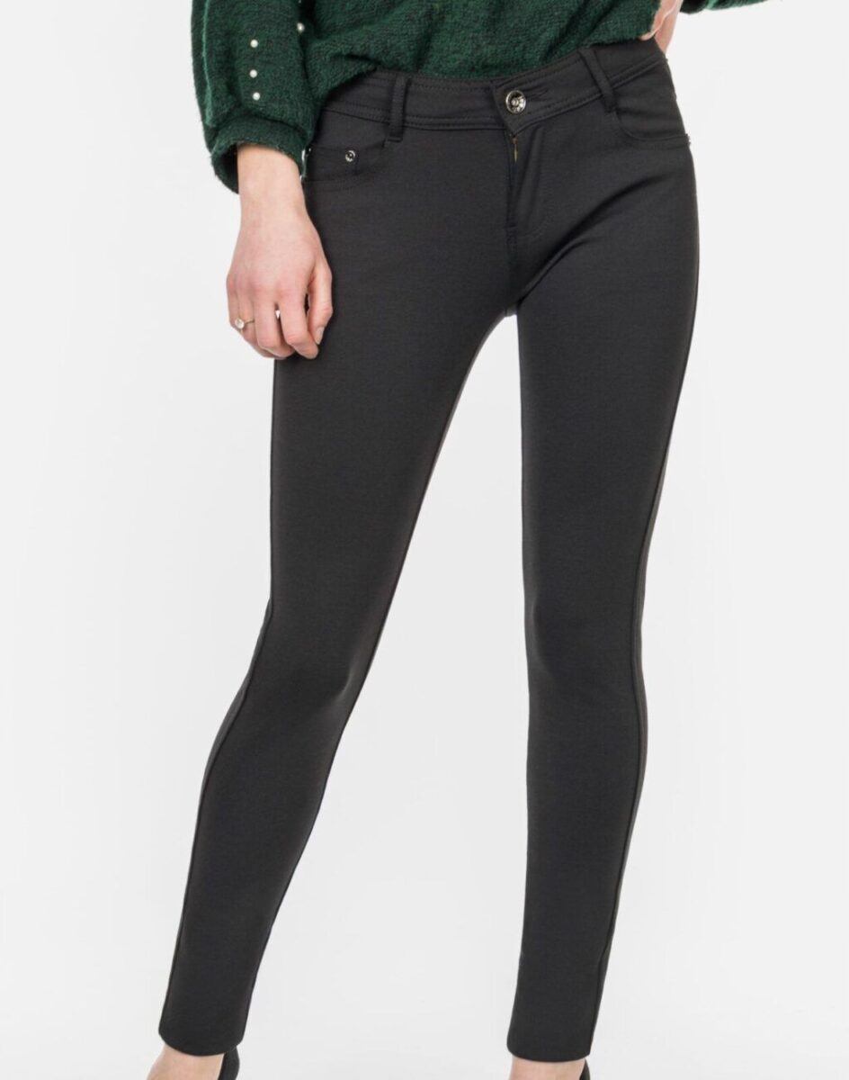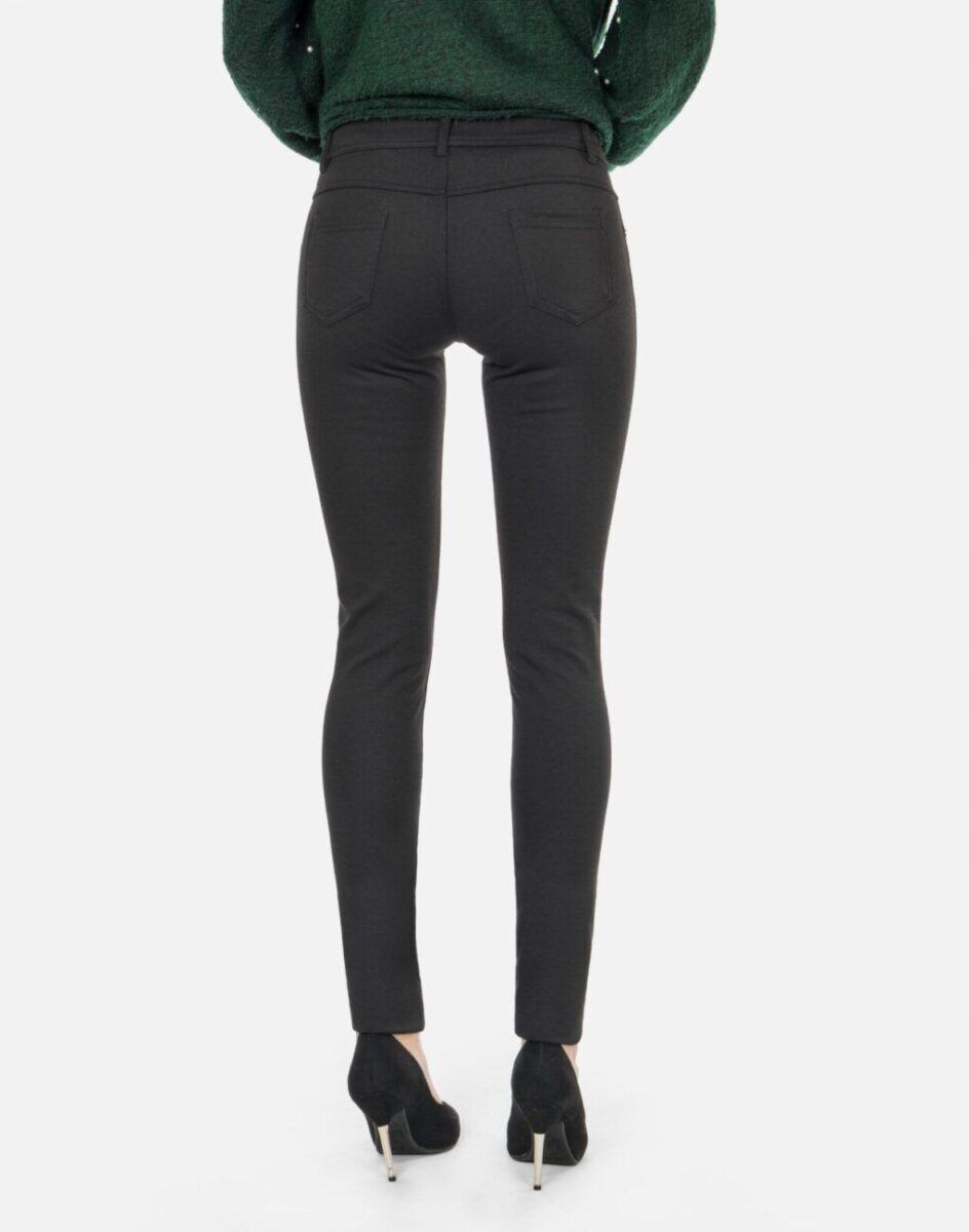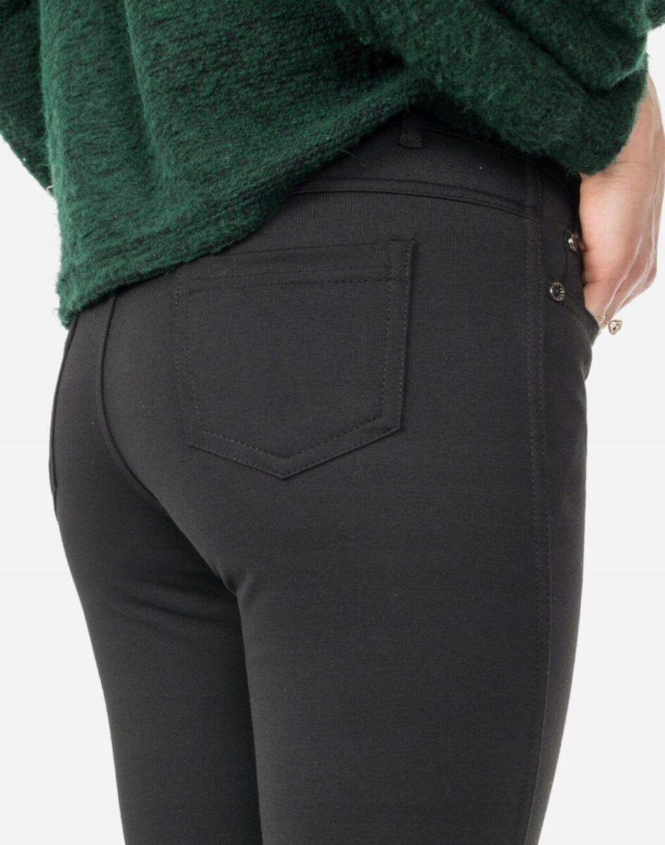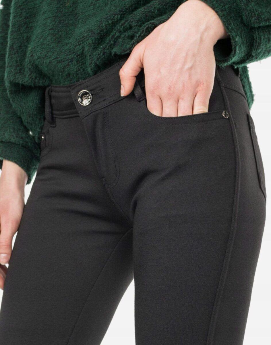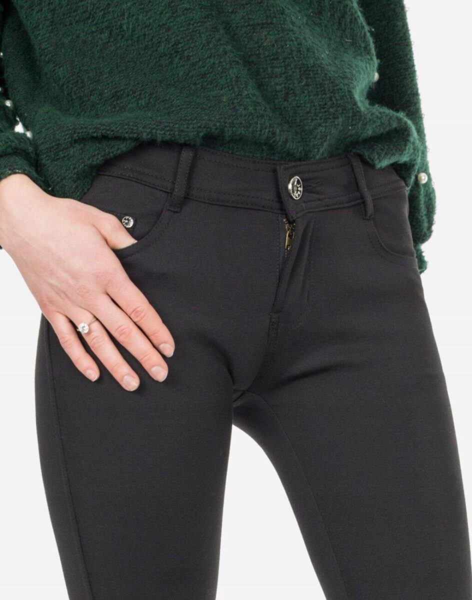 Spodnie damskie model 15080 to klasyczna czarna rurka o wyszczuplającym optycznie kobiecą sylwetkę fasonie i wyższym stanie. Zapinane są na zamek błyskawiczny i guzik sygnowany logiem firmy. Z przodu mają dwie kieszonki zaokrąglone oraz mniejszą kieszonkę tzw. bilonówkę, a na tyle klasyczne kieszenie naszywane jak w typowych spodniach jeansowych. W pasie szlufki umożliwiające stylizacje z paskiem. Najbardziej podatne na uszkodzenia miejsca wzmocnione są dodatkowymi przeszyciami oraz ozdobnymi nitami.