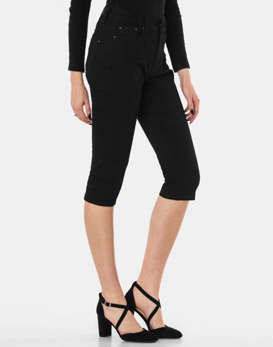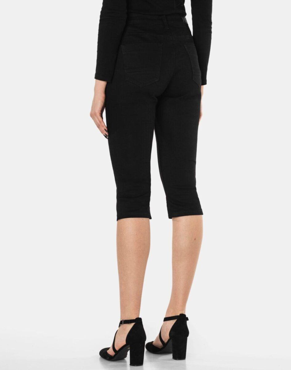 Spodenki damskie S70 to komfortowo skrojony model o wyszczuplającym optycznie kobiecą sylwetkę fasonie i wyższym stanie. Zapinane są na kryty zamek błyskawiczny i ozdobny guziki sygnowane logiem firmy. Z przodu mają dwie kieszonki zaokrąglone oraz mniejszą kieszonkę tzw. bilonówkę, z tyłu dwie kieszonki naszywane. W pasie szlufki umożliwiające stylizacje z paskiem. Najbardziej podatne na uszkodzenia miejsca wzmocnione są dodatkowymi przeszyciami oraz ozdobnymi nitami. Sprawdzony przez wiele zadowolonych klientek uniwersalni i modny krój typu rybaczki z wąskimi dopasowanymi nogawkami 3/4 i wyższym stanem, które założysz na wiele różnych okazji.