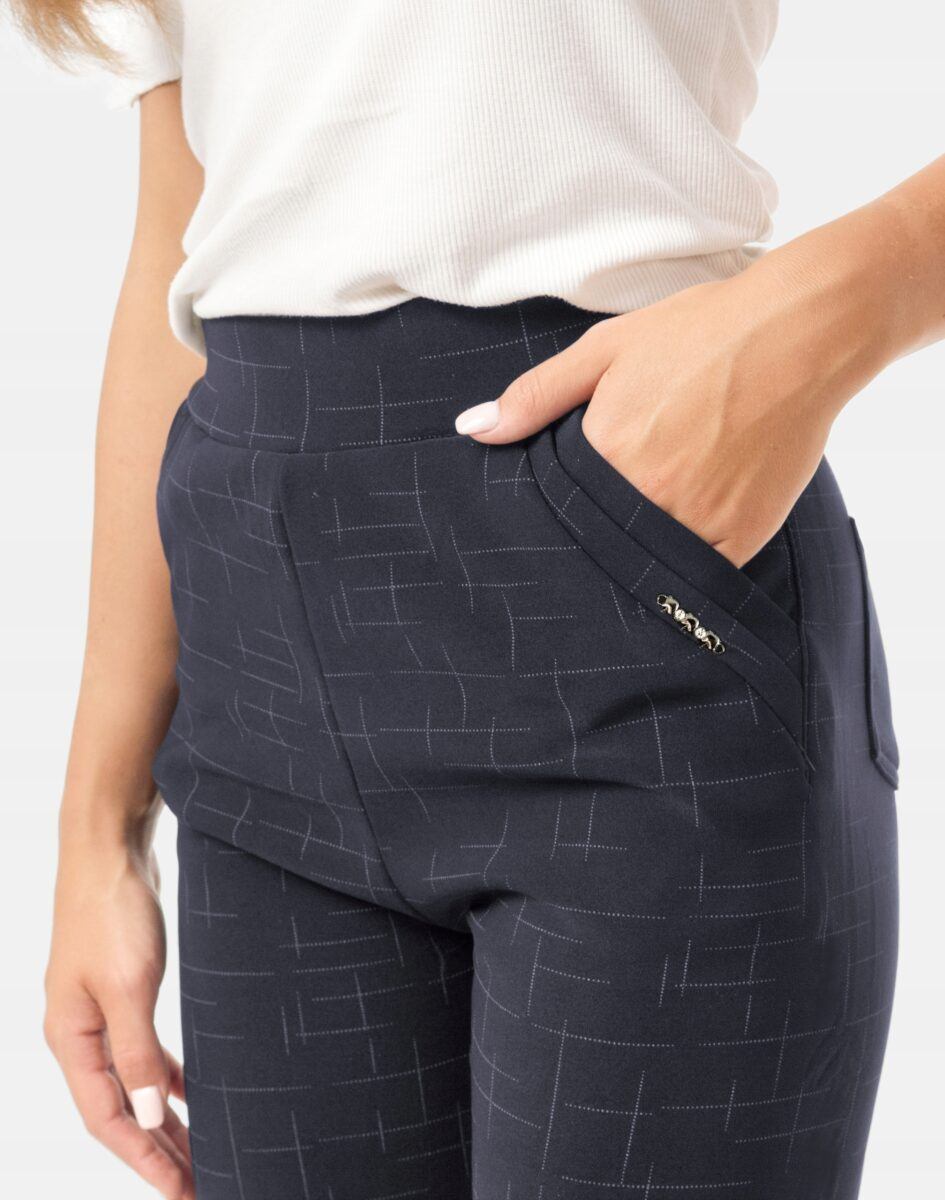Ciepłe spodnie damskie bardzo szykowne cygaretki w stylu Glamour na jesień zimę z podwyższonym stanem i ocieplone od wewnątrz mikropolarem. Z przodu mają dwie kieszenie wpuszczane na dłonie z tyłu dwie kieszonki naszywane. Dopasowanie w pasie zapewnia szeroki elastyczny pas ściągający zgrabnie modelujący sylwetkę w talii. Jak w typowych cygaretkach nogawka zwężana kończąca się na wysokości kostki dzięki temu sylwetka wygląda w nich lekko i zgrabnie. Oferowane przez nas spodnie są unikalnym połączeniem wysokiej jakości tkaniny poliestrowej z dodatkiem wiskozy i elastanu, a od wewnątrz bardzo ciepłego i przyjemnego w kontakcie ze skórą mikropolaru. Dodatek elastanu sprawia że spodnie są bardziej elastyczne co pozwala na pełną swobodę ruchów, daje komfort przy siadaniu i zapewnia ogromny komfort noszenia. Warstwa wewnętrzna spodni wykonana z mikropolaru ma za zadanie zapewnić oddychalność i maksymalną ochronę w zmiennych warunkach i niskiej temperaturze. Takie wykończenie wewnętrznej strony spodni zapewnia bardzo wysoki wskaźnik ochrony termicznej, jak również zdecydowanie podnosi komfort użytkowania tych spodni jesienią a zwłaszcza zimą. Spodnie są przez to bardzo ciepłe, wygodne i oddychające (utrzymują ciepły i suchy mikroklimat skóry), a jednocześnie wyjątkowo lekkie.