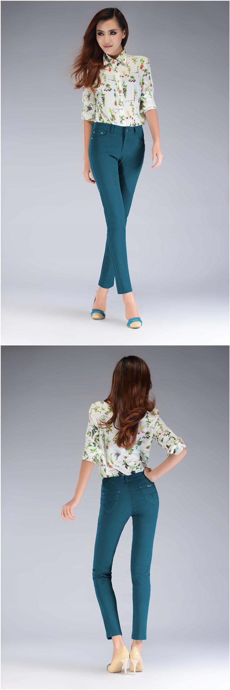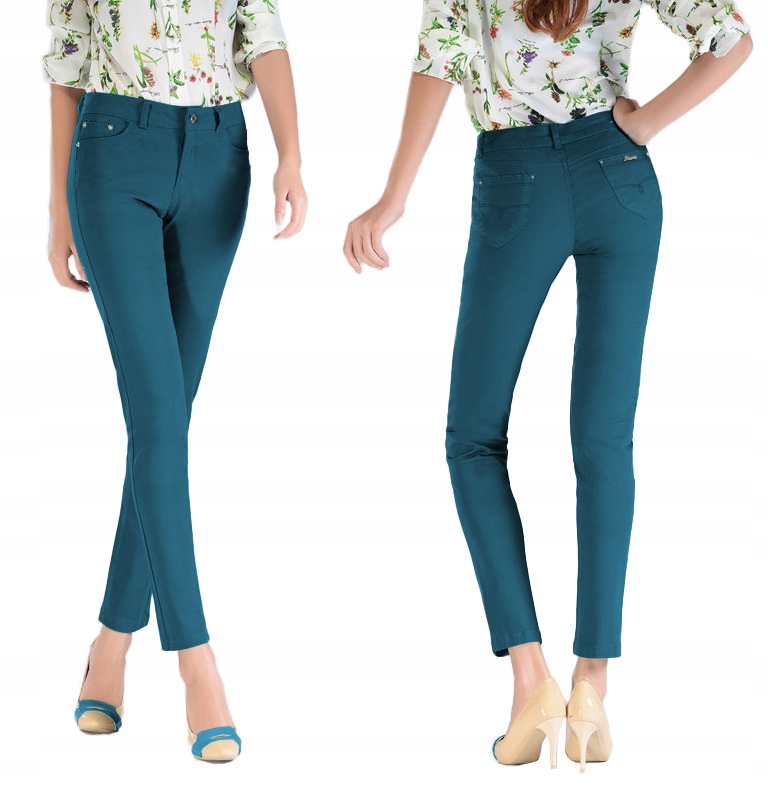 Eleganckie spodnie damskie bawełniane z wyższym stanem i wąską, dopasowaną nogawką to jeden z najczęściej wybieranych przez modne kobiety modeli spodni. Wykonane z wysokiej jakości cienkiej tkaniny bawełnianej o jednolitym wybarwieniu z dodatkiem lycry (elastan). Niewielki dodatek lycry sprawia, że spodnie są bardziej elastyczne i doskonale dopasowują się do każdej sylwetki. Pozwalają na pełną swobodę ruchów, co daje użytkownikowi wygodę przy siadaniu i zapewnia ogromny komfort noszenia. Zapinane są na kryty zamek błyskawiczny i metalowy guzik sygnowany logiem firmy. Z przodu mają dwie kieszonki zaokrąglone oraz mniejszą kieszonkę tzw. bilonówkę, a na tyle klasyczne kieszenie naszywane jak w typowych spodniach jeansowych. W pasie szlufki umożliwiające stylizacje z paskiem. Najbardziej podatne na uszkodzenia miejsca wzmocnione są dodatkowymi przeszyciami i ozdobnymi nitami.