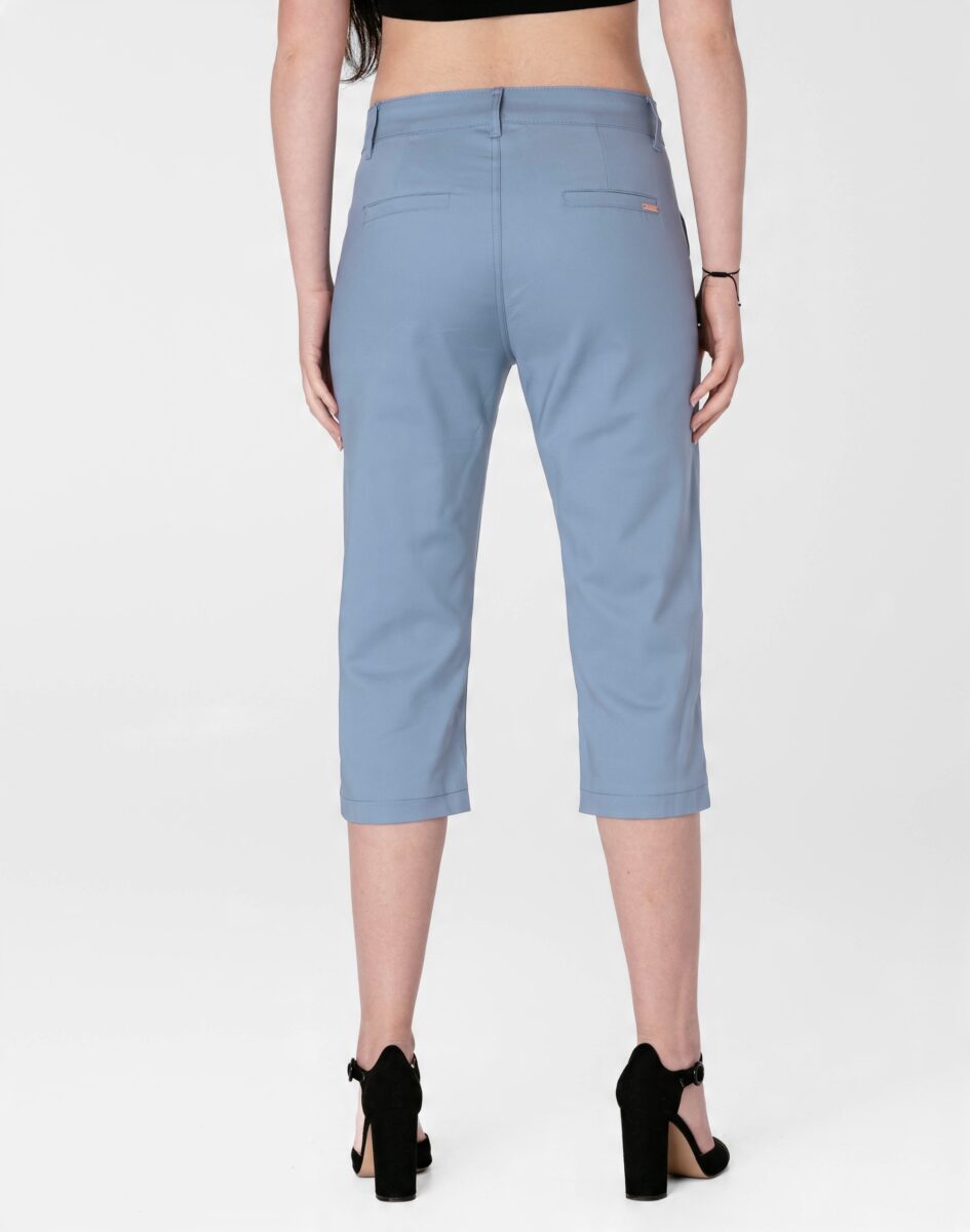 Spodnie damskie model 3335DD to klasyczne, bardzo szykowne rybaczki Capri z wyższym stanem i prostymi nogawkami 3/4, dzięki temu sylwetka wygląda w nich lekko i zgrabnie. Zapinane są na kryty zamek błyskawiczny i metalowy guzik sygnowany logiem firmy. Z przodu mają dwie kieszonki na dłonie, a z tyłu imitacje kieszonek typu Chinosy. W pasie szlufki umożliwiające stylizacje z paskiem.