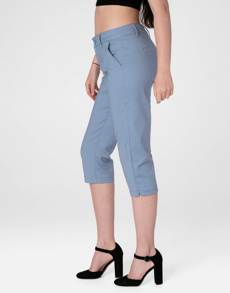 Spodnie damskie model 3335DD to klasyczne, bardzo szykowne rybaczki Capri z wyższym stanem i prostymi nogawkami 3/4, dzięki temu sylwetka wygląda w nich lekko i zgrabnie. Zapinane są na kryty zamek błyskawiczny i metalowy guzik sygnowany logiem firmy. Z przodu mają dwie kieszonki na dłonie, a z tyłu imitacje kieszonek typu Chinosy. W pasie szlufki umożliwiające stylizacje z paskiem.