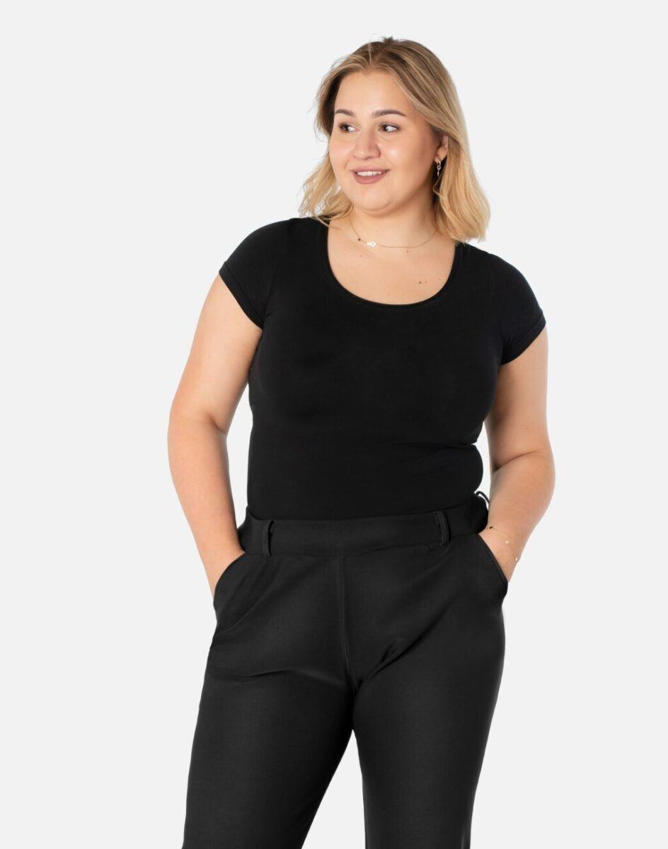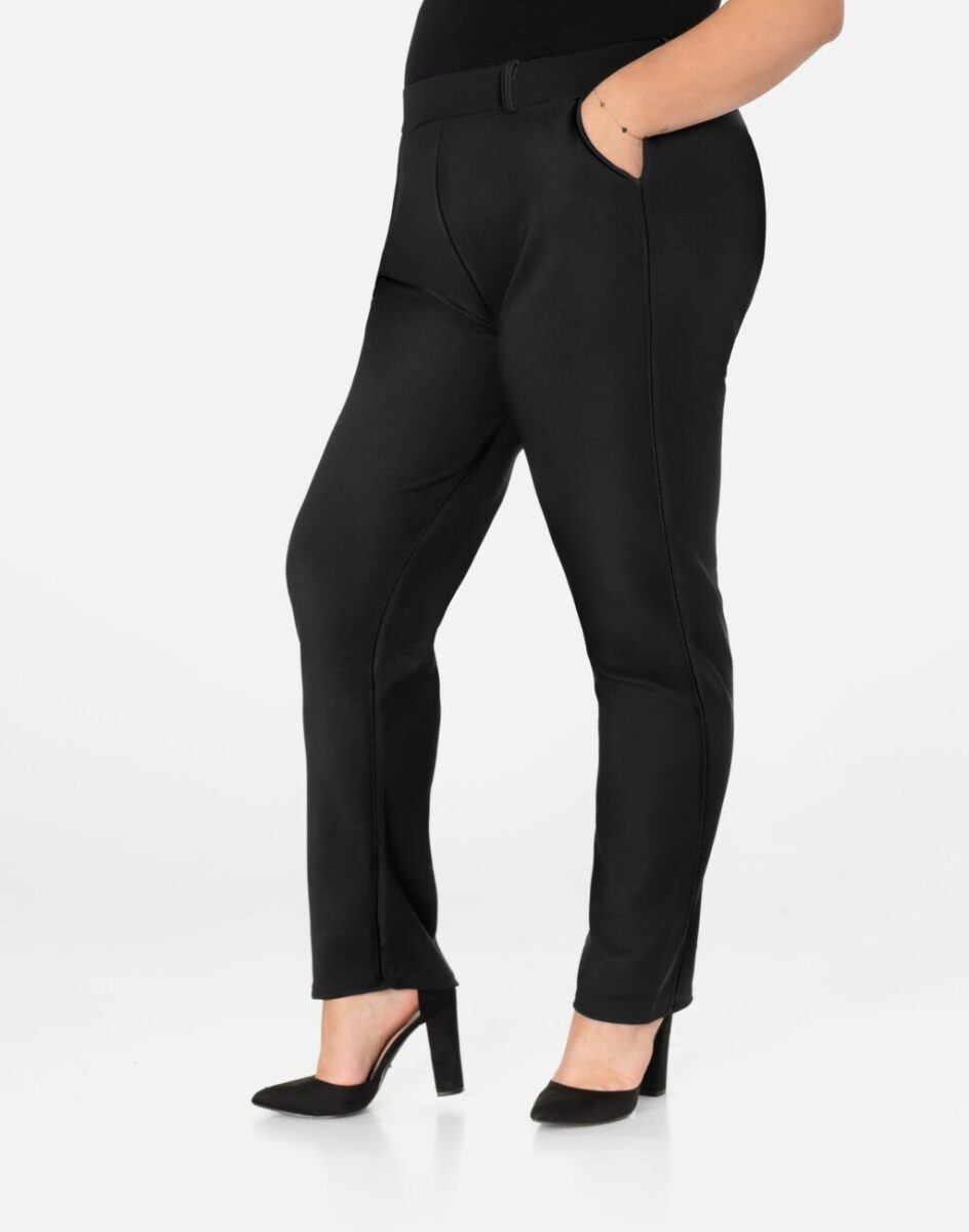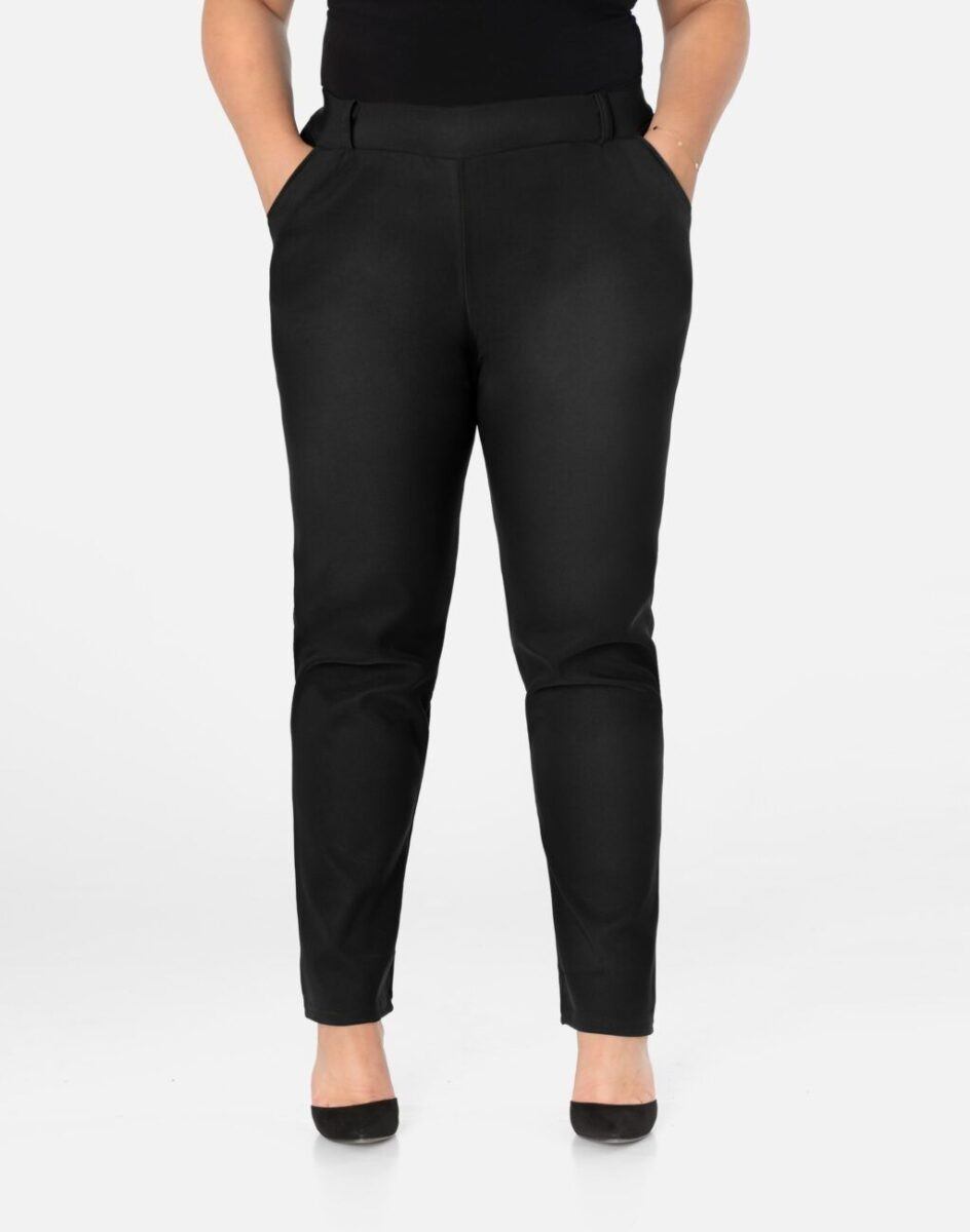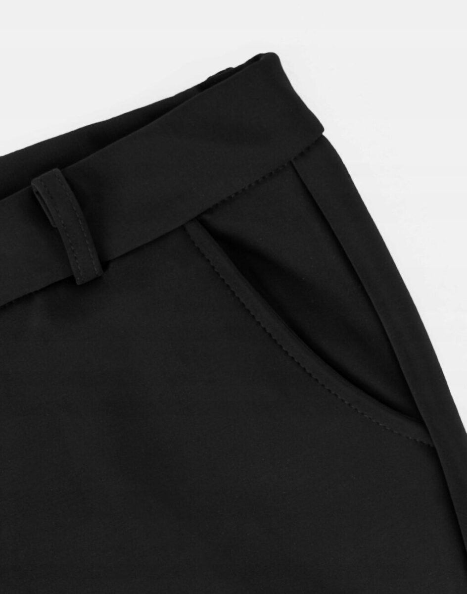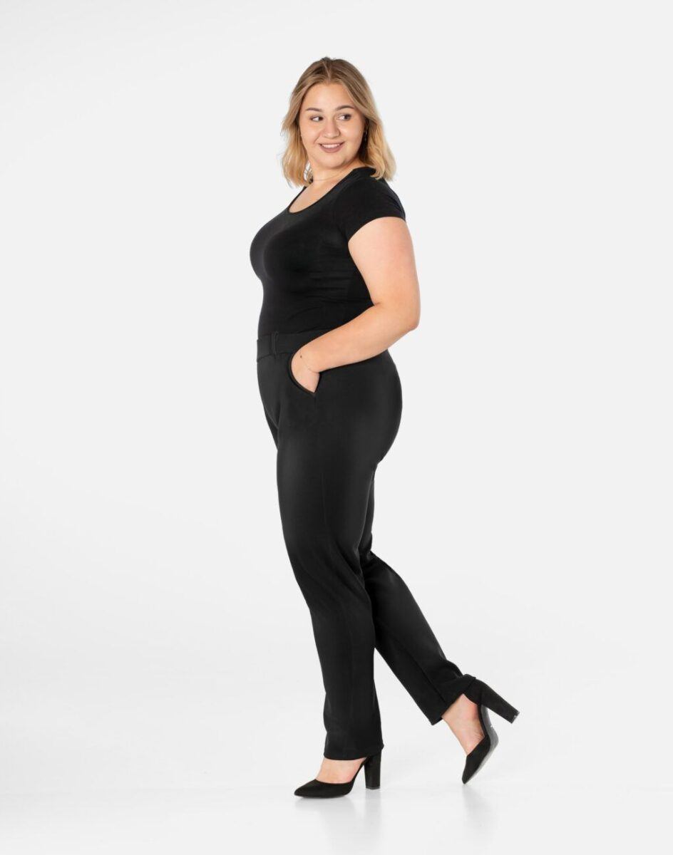 - Szeroki, wygodny, elastyczny ściągacz w pasie wyszczuplający talię oraz szlufki do stylizacji z paskiem