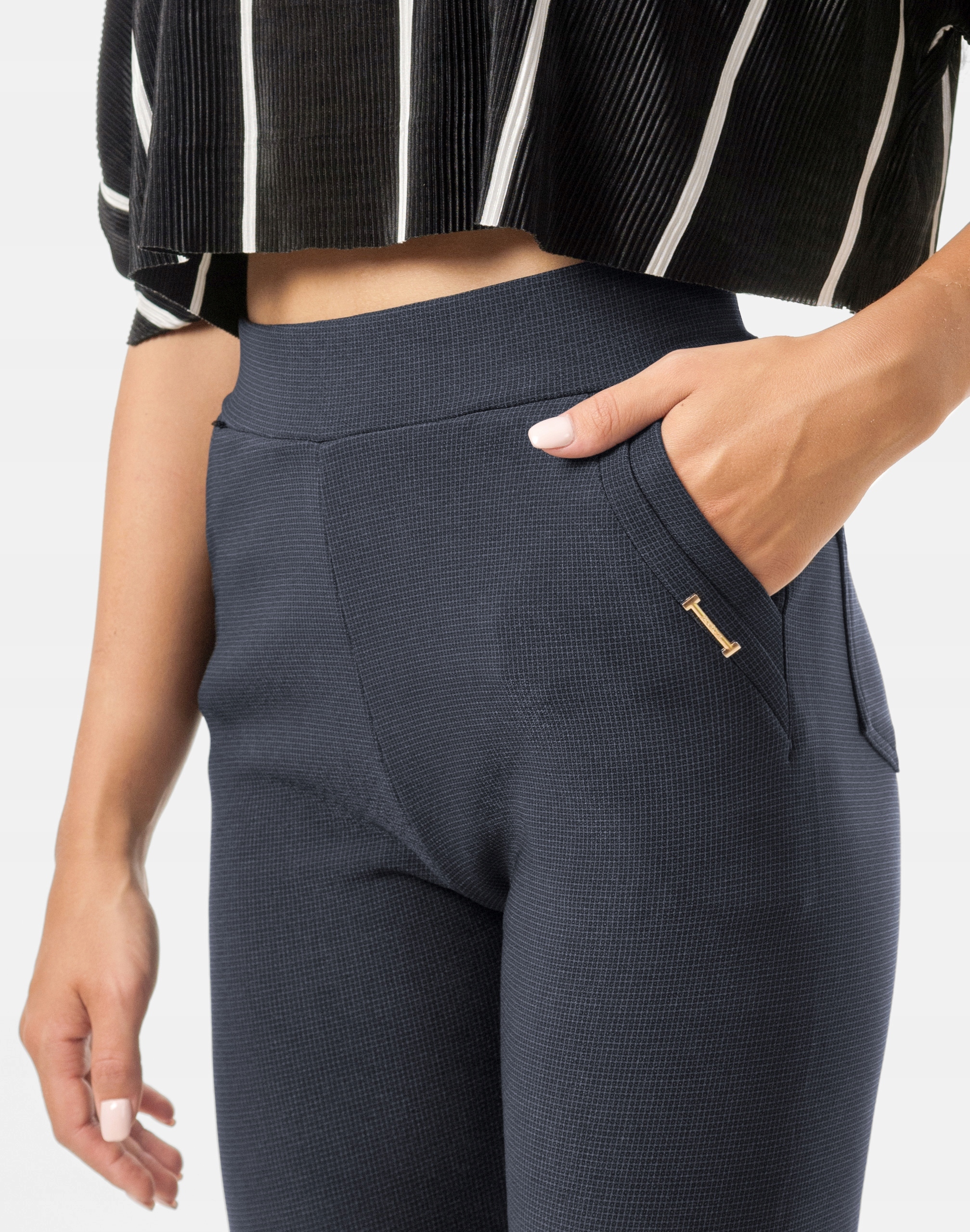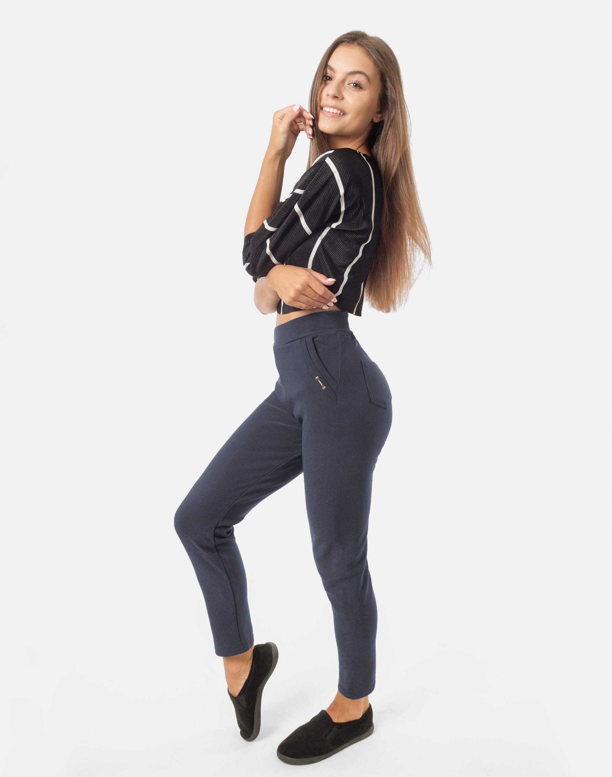 Eleganckie spodnie damskie bardzo szykowne cygaretki w stylu Glamour o wyszczuplającym optycznie kobiecą sylwetkę fasonie i wyższym stanie ocieplone od wewnątrz mikropolarem. Z przodu dwie kieszonki wpuszczane na dłonie, z tyłu dwie kiszenie naszywane. Dopasowanie w pasie zapewnia szeroki elastyczny pas ściągający zgrabnie modelujący sylwetkę w talii. Jak w typowych cygaretkach nogawka zwężana kończąca się na wysokości kostki dzięki temu sylwetka wygląda w nich lekko i zgrabnie.