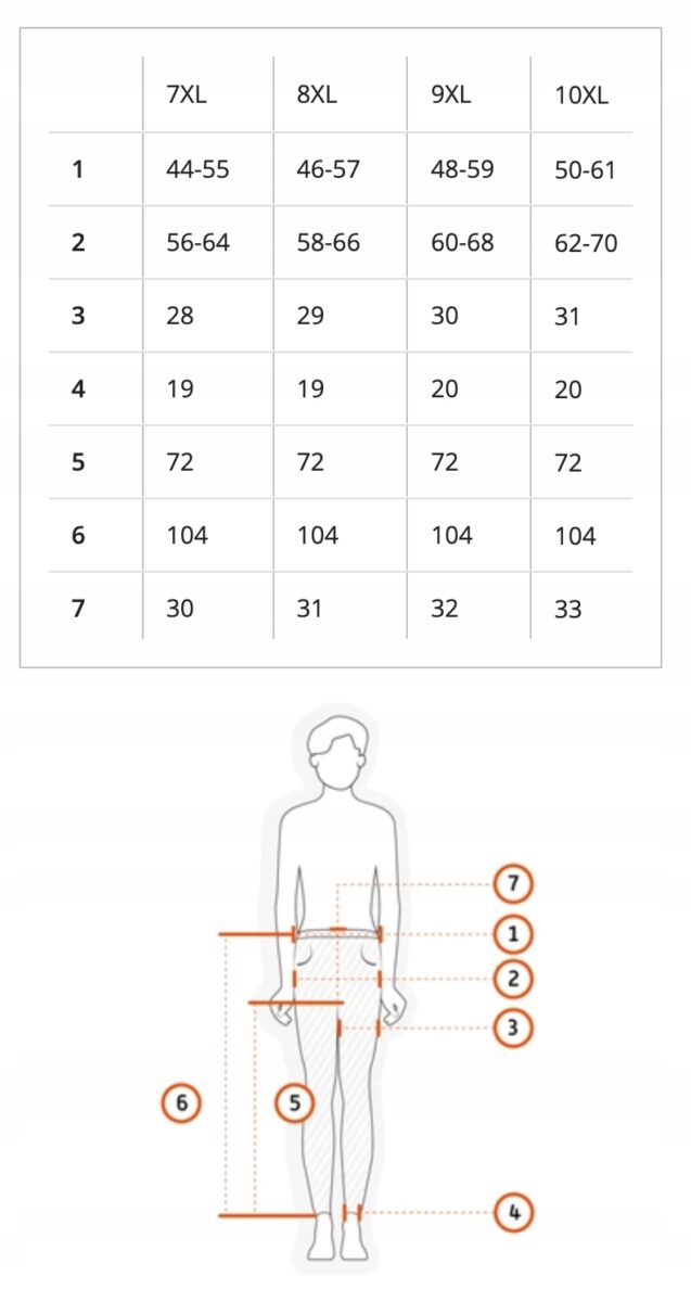 Proszę nie sugerować się rozmiarem podanym na metce przez producenta (np. 7XL, 8XL lub 10XL) ponieważ różne firmy stosują bardzo różne oznaczenia rozmiaru na co my jako sprzedawcy na Allegro nie mamy żadnego wpływu. Najlepiej jest zmierzyć swoje stare spodnie dokładnie centymetrem następnie wybrać odpowiedni rozmiar podany w centymetrach w tabeli na naszych aukcjach.