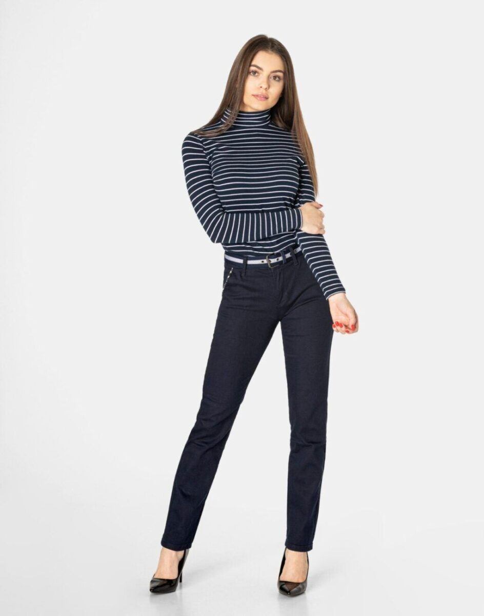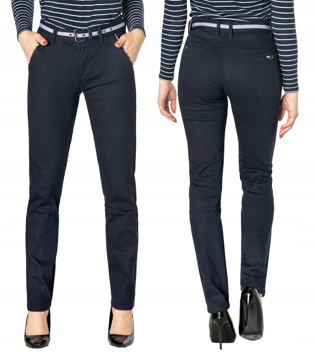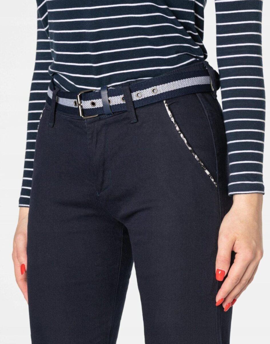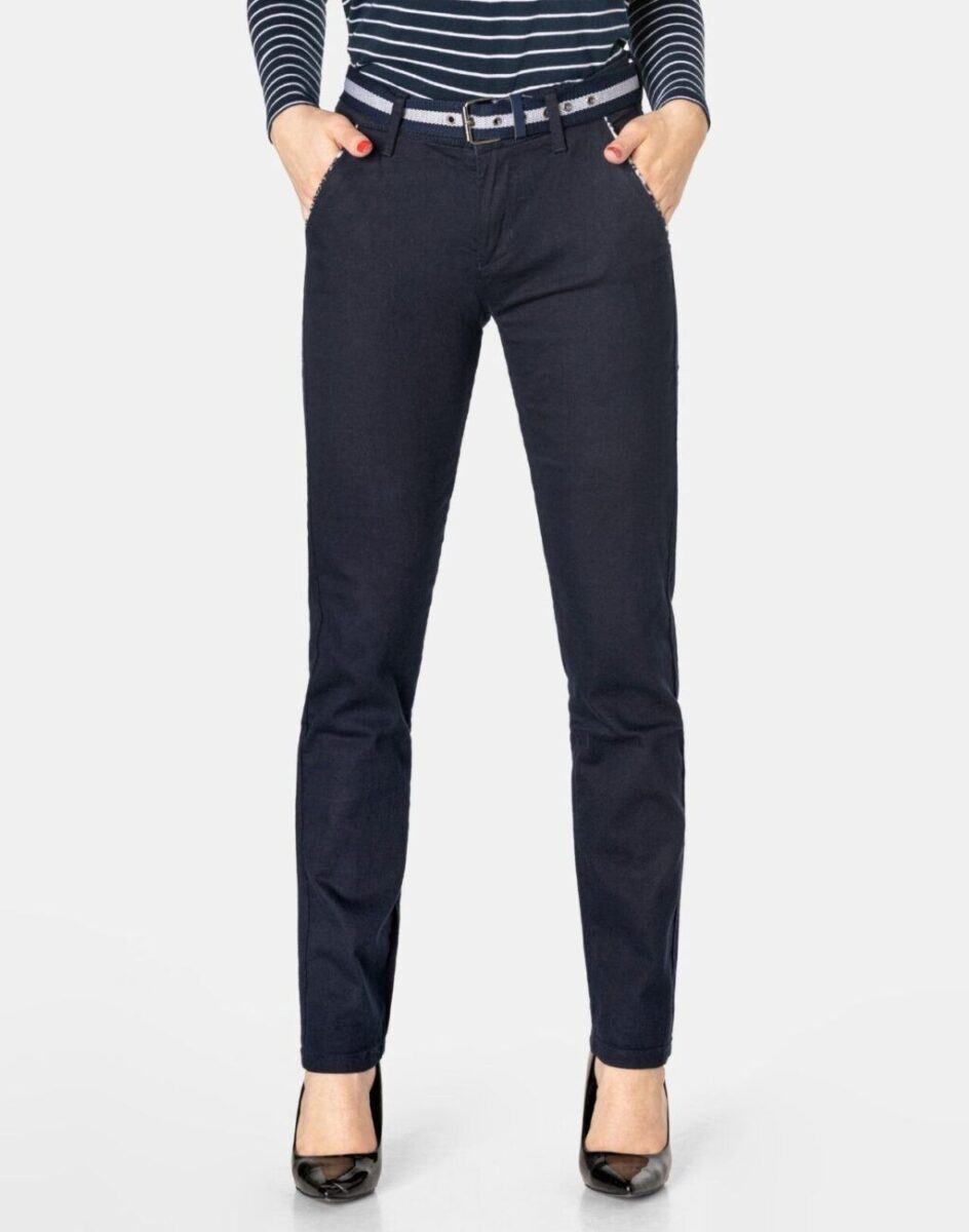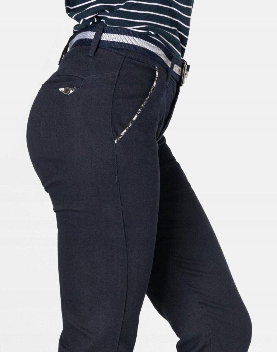 Spodnie damskie typu Chino zwane również Chinosami to klasyka wśród klasyki. Dedykowane kobietom uwielbiającym elegancki i modny wygląd a jednocześnie sportowy charakter. Uszyte z mocnej tkaniny bawełnianej średniej grubości o drobnym zapewniającym dużą wytrzymałość splocie. Zapinane na kryty zamek błyskawiczny i guzik, posiadają charakterystyczne dla Chinosów dwie skośne kieszenie na dłonie ozdobione kontrastowymi wstawkami na bokach spodni i dwie wpuszczane kieszenie ozdobione guzikami z tyłu spodni. W pasie szlufki umożliwiające stylizacje z paskiem. Użyta do produkcji spodni wysokiej jakości tkanina bawełniana dzięki niewielkiemu dodatkowi lycry (spandex) jest delikatnie elastyczna co sprawia że spodnie są wyjątkowo wygodne w użytkowaniu, pozwalają na pełną swobodę ruchów co daje wygodę przy siadaniu i zapewnia ogromny komfort noszenia. Jak w typowych Chinosach nogawka lekko zwężana, co sprawia że sylwetka wygląda w nich lekko i zgrabnie.