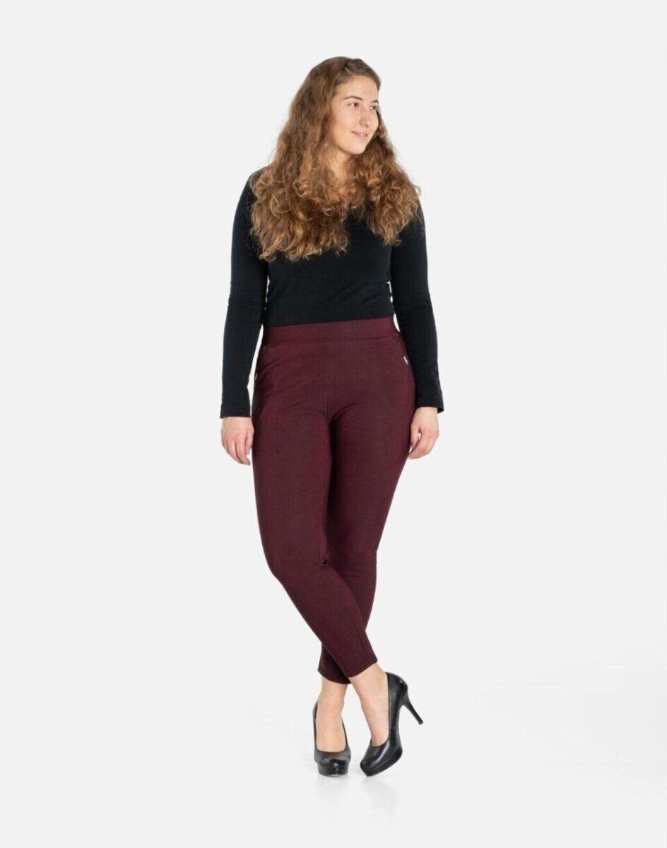 Wykonane z wysokiej jakości dzianiny spodniowej średniej grubości z dodatkiem elastanu dzięki czemu spodnie są bardziej elastyczne, bardzo dobrze się układają i dopasowują do każdej figury. Pozwalają na pełną swobodę ruchów co daje komfort przy siadaniu i zapewnia ogromny komfort noszenia. Trwałe i elastyczne wykończenie spodni (użycie do produkcji elastycznych nici) gwarantuje komfort i wygodę ich użytkownikowi w każdych warunkach, a tkanina jest na tyle gruba, że nie widać przez nią bielizny. Sprawdzony przez wiele zadowolonych klientek uniwersalni i modny krój typu cygaretki z lekko zwężoną nogawką 7/8 i wyższym stanem, które założysz na wiele różnych okazji.
