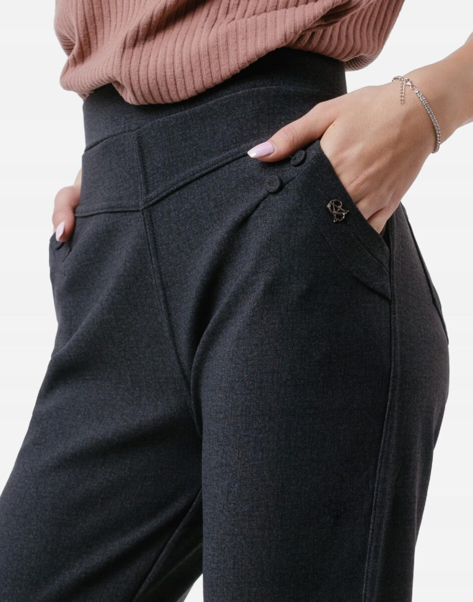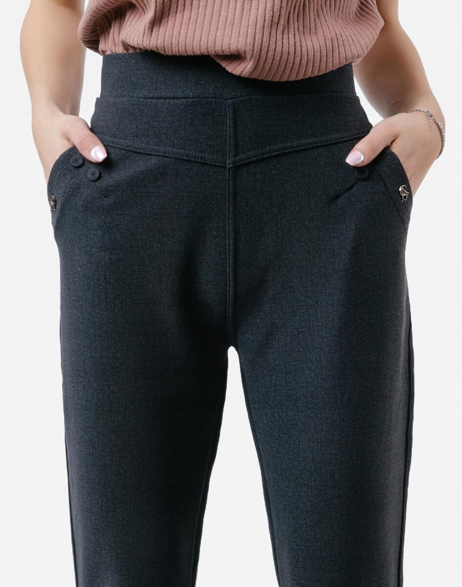 Wykonane z przyjemnej w dotyku dzianiny bawełnianej z dodatkiem elastanu dzięki czemu spodnie są bardziej elastyczne i bardzo dobrze dopasowują się do każdej figury. Trwałe i elastyczne wykończenie spodni (użycie do produkcji elastycznych nici) gwarantuje komfort i wygodę ich użytkownikowi w każdych warunkach, a tkanina jest na tyle gruba że nie widać przez nią bielizny. Pozwalają na pełną swobodę ruchów co daje komfort przy siadaniu i zapewnia ogromny komfort noszenia. Uniwersalny, zawsze modny krój typu cygaretki z lekko zwężoną nogawką i wyższym stanem które założysz na wiele różnych okazji.