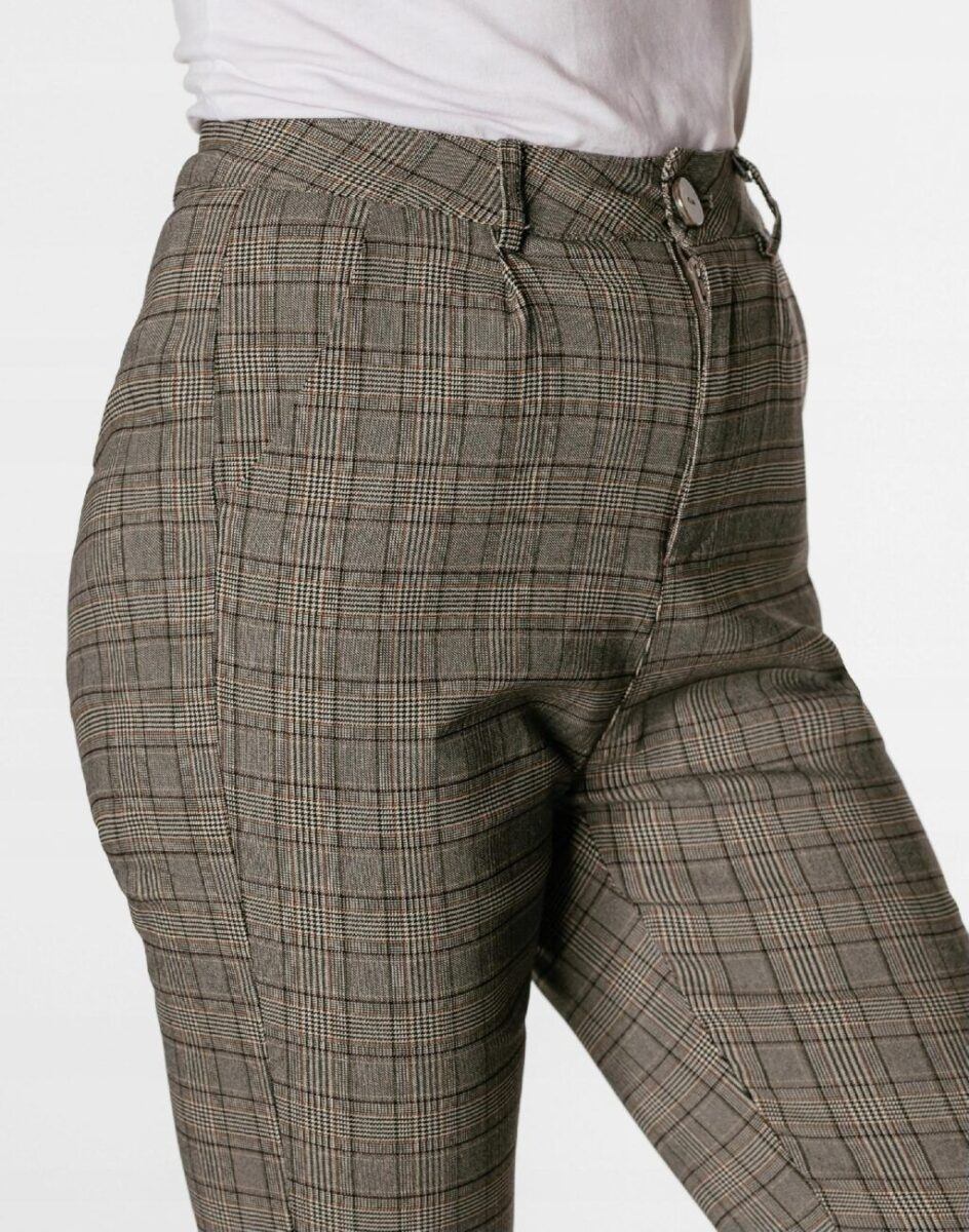 Spodnie damskie model 1921 to klasyczne, bardzo szykowne cygaretki w nieśmiertelnym stylu Glamour o wyszczuplającym optycznie kobiecą sylwetkę fasonie i wyższym stanie. Zapinane są na kryty zamek błyskawiczny i guzik. W pasie szlufki umożliwiające stylizacje z paskiem. Na bokach spodni dwie ukośne wpuszczane kieszenie na dłonie. Jak w typowych cygaretkach nogawka zwężana kończąca się na wysokości kostki co sprawia że sylwetka wygląda w nich lekko i zgrabnie.