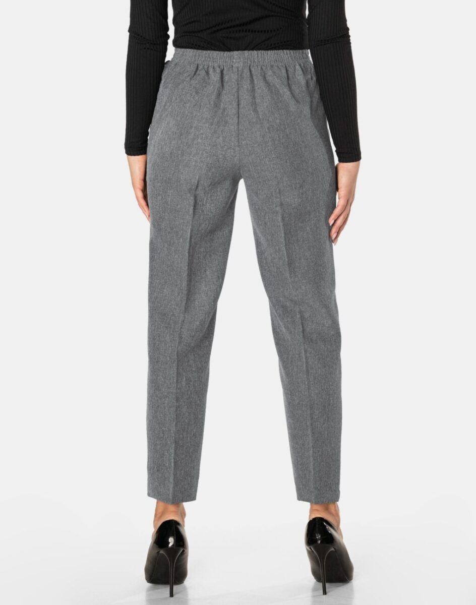 Spodnie damskie model S001 to klasyczne, bardzo szykowne cygaretki w nieśmiertelnym stylu Glamour o wyszczuplającym optycznie kobiecą sylwetkę fasonie i wyższym stanie. Dopasowanie w pasie zapewnia szeroki elastyczny pas ściągający, który zgrabnie modeluje sylwetkę w talii. Na bokach spodni dwie wpuszczane kieszenie na dłonie, zasuwane na zamki błyskawiczne. Jak w typowych cygaretkach nogawka lekko zwężana kończąca się na wysokości kostki co sprawia że sylwetka wygląda w nich lekko i zgrabnie.