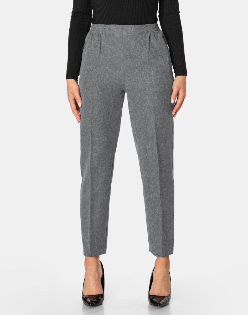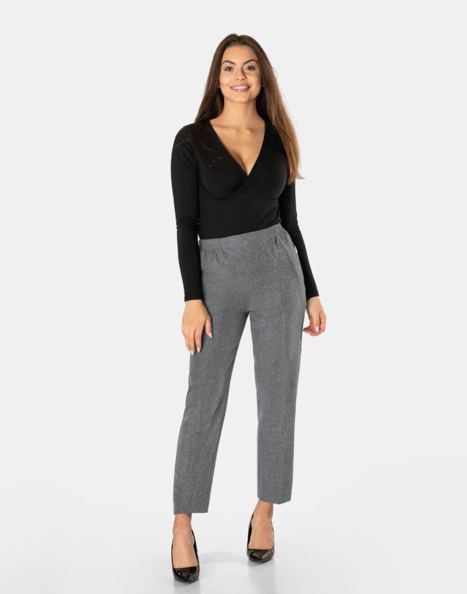 Spodnie damskie model S001 to klasyczne, bardzo szykowne cygaretki w nieśmiertelnym stylu Glamour o wyszczuplającym optycznie kobiecą sylwetkę fasonie i wyższym stanie. Dopasowanie w pasie zapewnia szeroki elastyczny pas ściągający, który zgrabnie modeluje sylwetkę w talii. Na bokach spodni dwie wpuszczane kieszenie na dłonie, zasuwane na zamki błyskawiczne. Jak w typowych cygaretkach nogawka lekko zwężana kończąca się na wysokości kostki co sprawia że sylwetka wygląda w nich lekko i zgrabnie.