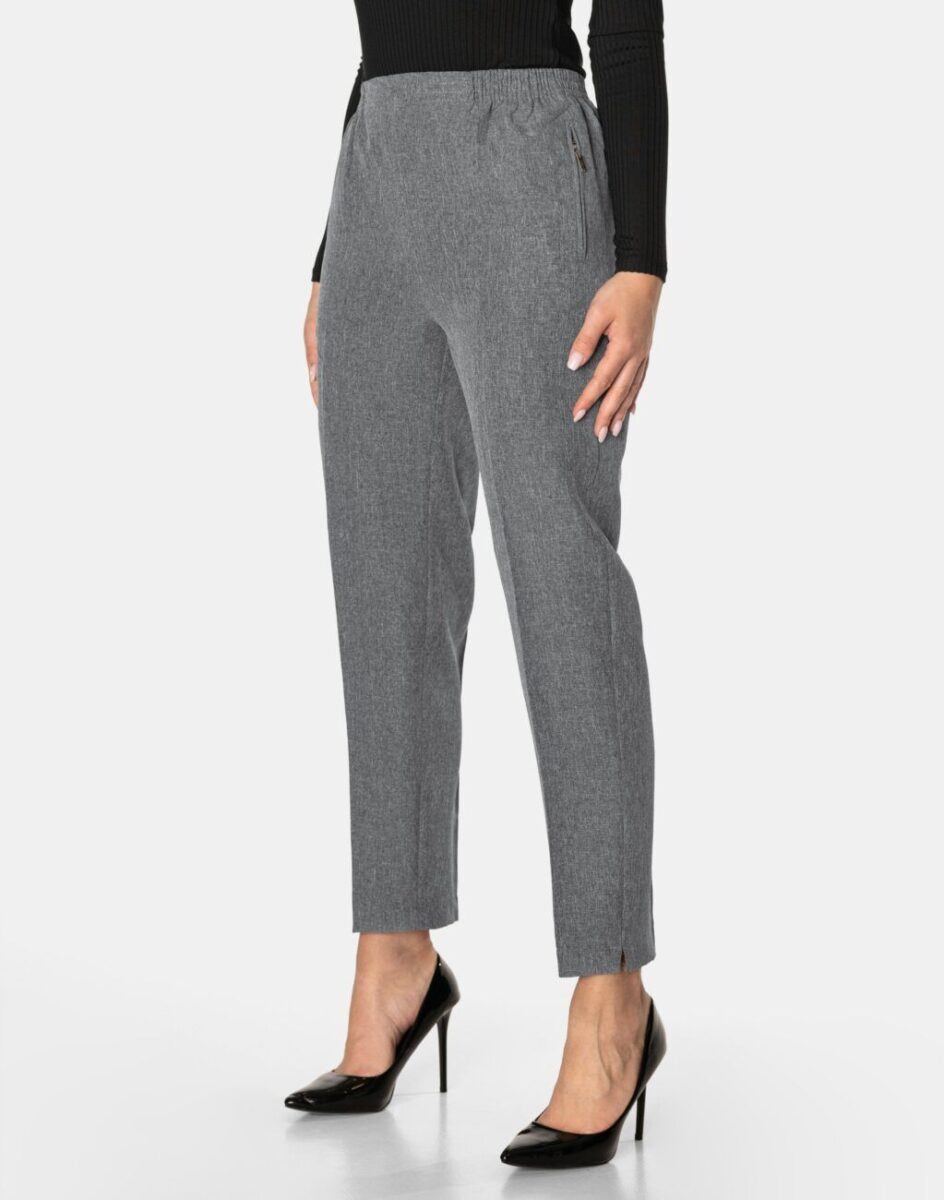 Spodnie damskie model S001 to klasyczne, bardzo szykowne cygaretki w nieśmiertelnym stylu Glamour o wyszczuplającym optycznie kobiecą sylwetkę fasonie i wyższym stanie. Dopasowanie w pasie zapewnia szeroki elastyczny pas ściągający, który zgrabnie modeluje sylwetkę w talii. Na bokach spodni dwie wpuszczane kieszenie na dłonie, zasuwane na zamki błyskawiczne. Jak w typowych cygaretkach nogawka lekko zwężana kończąca się na wysokości kostki co sprawia że sylwetka wygląda w nich lekko i zgrabnie.