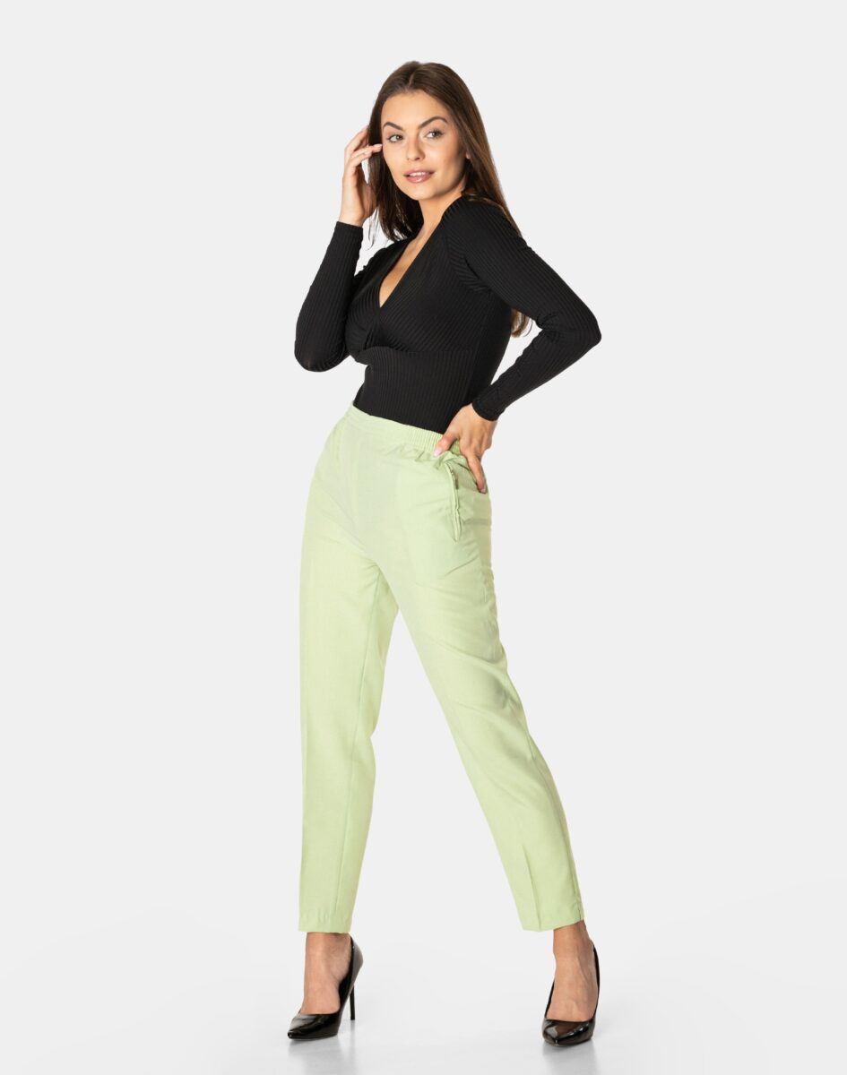 Spodnie damskie model S001 to klasyczne, bardzo szykowne cygaretki w nieśmiertelnym stylu Glamour o wyszczuplającym optycznie kobiecą sylwetkę fasonie i wyższym stanie. Dopasowanie w pasie zapewnia szeroki elastyczny pas ściągający, który zgrabnie modeluje sylwetkę w talii. Na bokach spodni dwie wpuszczane kieszenie na dłonie, zasuwane na zamki błyskawiczne. Jak w typowych cygaretkach nogawka lekko zwężana kończąca się na wysokości kostki co sprawia że sylwetka wygląda w nich lekko i zgrabnie.