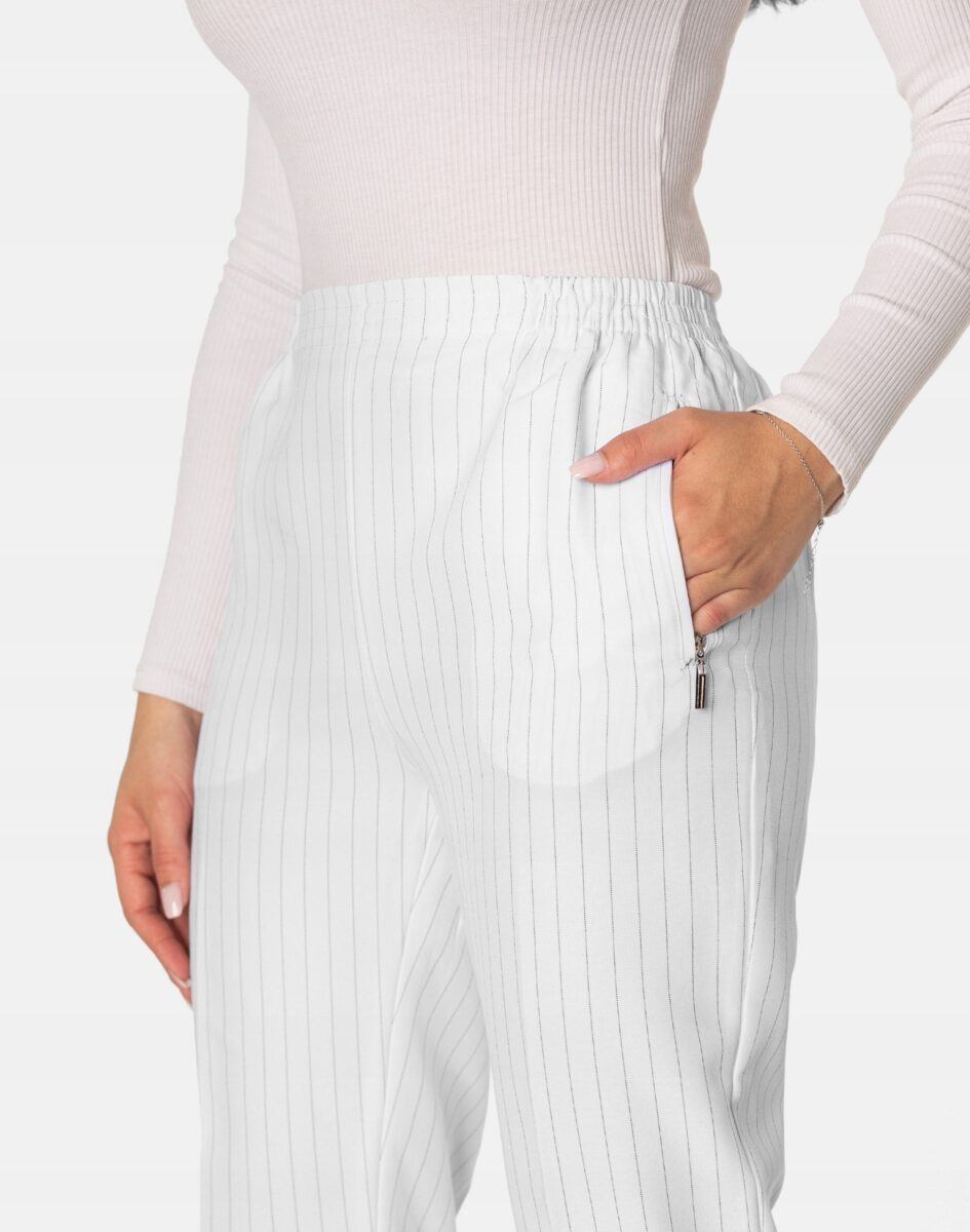 Wykonane z wysokiej jakości cienkiej tkaniny z dodatkiem wiskozy, dzięki czemu spodnie są lekkie, przewiewne, bardzo dobrze się układają i dopasowują do każdej figury. Pozwalają na pełną swobodę ruchów co daje komfort przy siadaniu i zapewnia ogromny komfort noszenia. Trwałe i elastyczne wykończenie spodni (użycie do produkcji elastycznych nici) gwarantuje komfort i wygodę ich użytkownikowi w każdych warunkach.