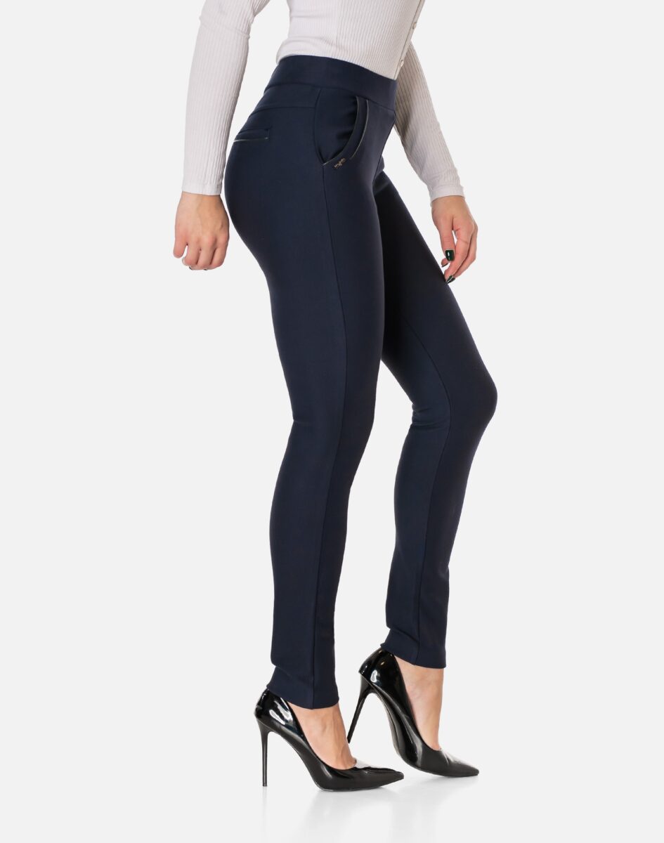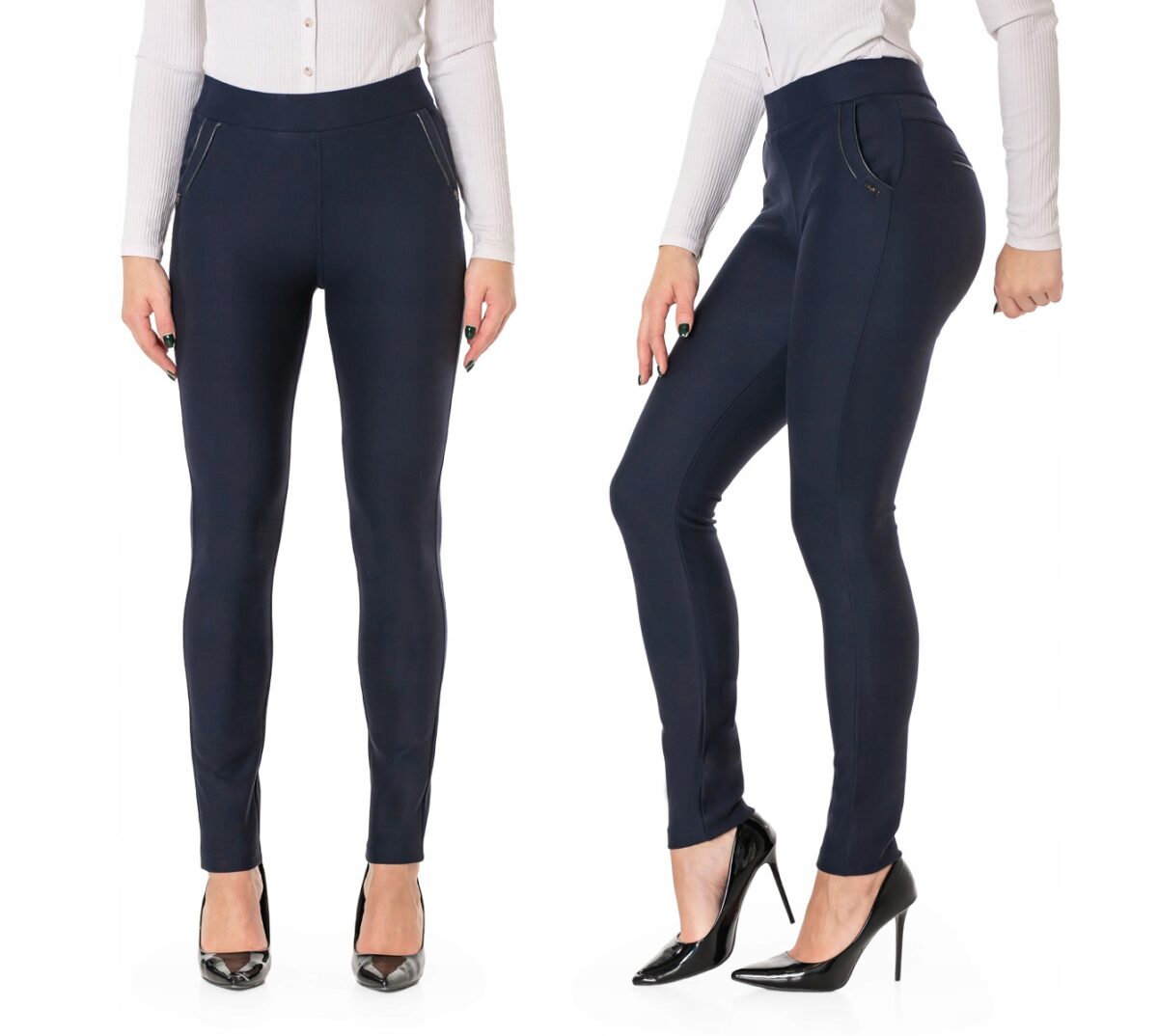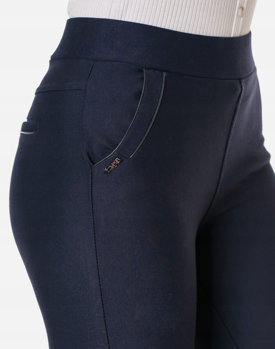 Spodnie damskie model 8061 to klasyczne, bardzo szykowne cygaretki-rurki w nieśmiertelnym stylu Glamour o wyszczuplającym optycznie kobiecą sylwetkę fasonie i wyższym stanie. Dopasowanie w pasie zapewnia szeroki elastyczny pas ściągający, który zgrabnie modeluje sylwetkę w talii. Na bokach spodni dwie wpuszczane kieszenie na dłonie z tyłu imitacja kieszonek wpuszczanych. Jak w typowych cygaretkach nogawka zwężana co sprawia, że sylwetka wygląda w nich lekko i zgrabnie. Skutecznie maskują pełną figurę i ładnie podkreślają kobiece kształty.