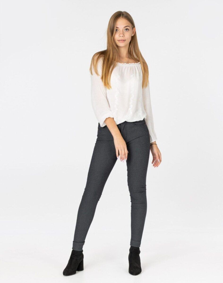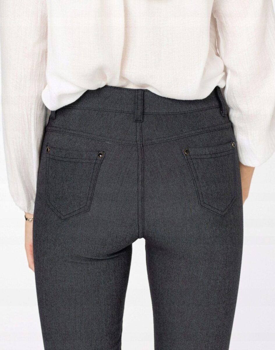 Spodnie model 8069 to klasyczne bardzo szykowne cygaretki damskie w stylu Glamour o wyszczuplającym optycznie kobiecą sylwetkę fasonie i wyższym stanie. Zapinane są na kryty zamek błyskawiczny i metalowy guzik sygnowany logiem firmy. Z przodu mają dwie kieszonki zaokrąglone oraz mniejszą kieszonkę tzw. bilonówkę, a na tyle klasyczne kieszenie naszywane jak w typowych spodniach jeansowych. W pasie szlufki umożliwiające stylizacje z paskiem. Najbardziej podatne na uszkodzenia miejsca wzmocnione są dodatkowymi przeszyciami oraz ozdobnymi nitami. Jak w typowych cygaretkach nogawka zwężana kończąca się na wysokości kostki dzięki temu sylwetka wygląda w nich lekko i zgrabnie.