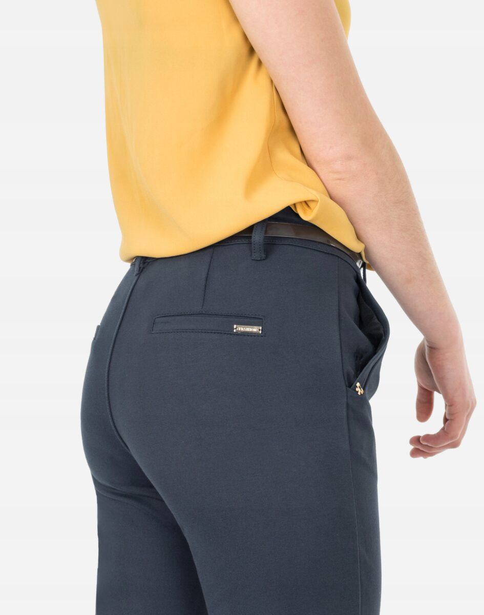 Spodnie model 8145 to klasyczne, bardzo eleganckie Chinosy damskie o wyszczuplającym optycznie kobiecą sylwetkę fasonie i wyższym stanie. Zapinane są na kryty zamek błyskawiczny i guzik sygnowany logiem firmy. Na bokach mają dwie skośne kieszonki, z tyłu imitacja kieszeni wpuszczanych. W pasie szlufki umożliwiające stylizacje z paskiem.